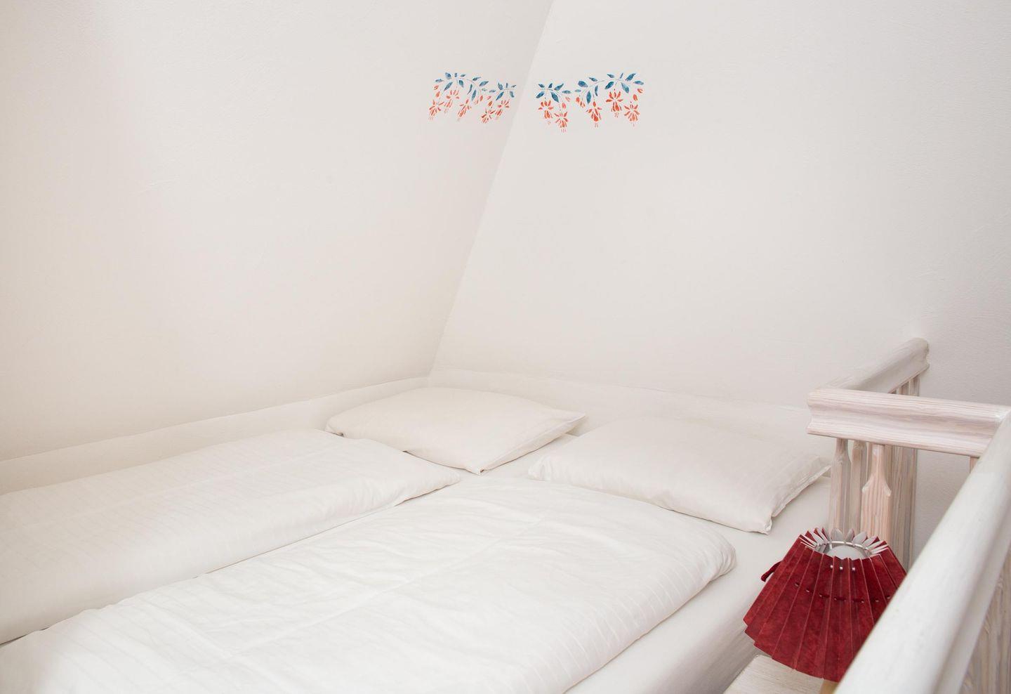 Das Doppelbett mit einer Breite von 160 cm ist auf der Galerie der Wohnung zu finden und bietet somit einen gemütlichen Schlafplatz unterm Dach des Friesenhauses. Diese Galerie ist über eine Treppe zugänglich.