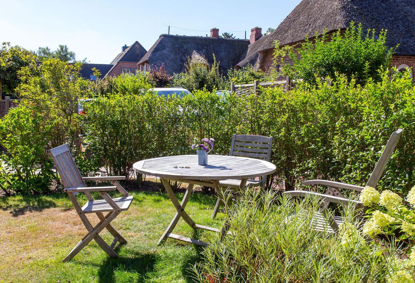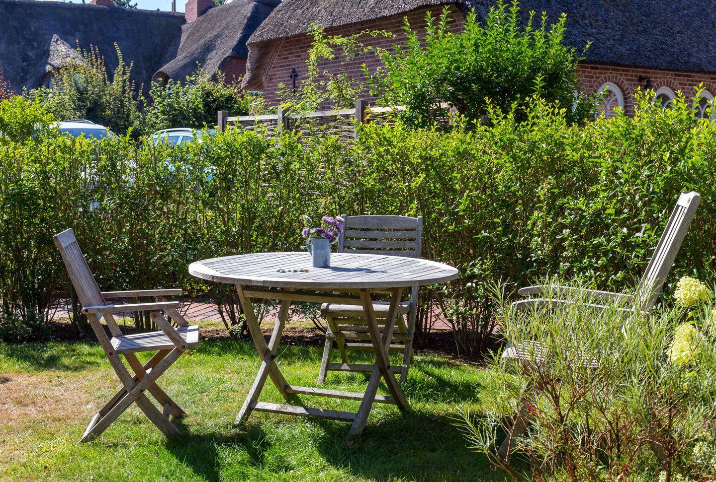Im Garten vor dem Reetdachhaus finden Sie einen Esstisch und Gartenmöbel, der Ihnen als Gästen der Wohnung 12 vorbehalten ist.