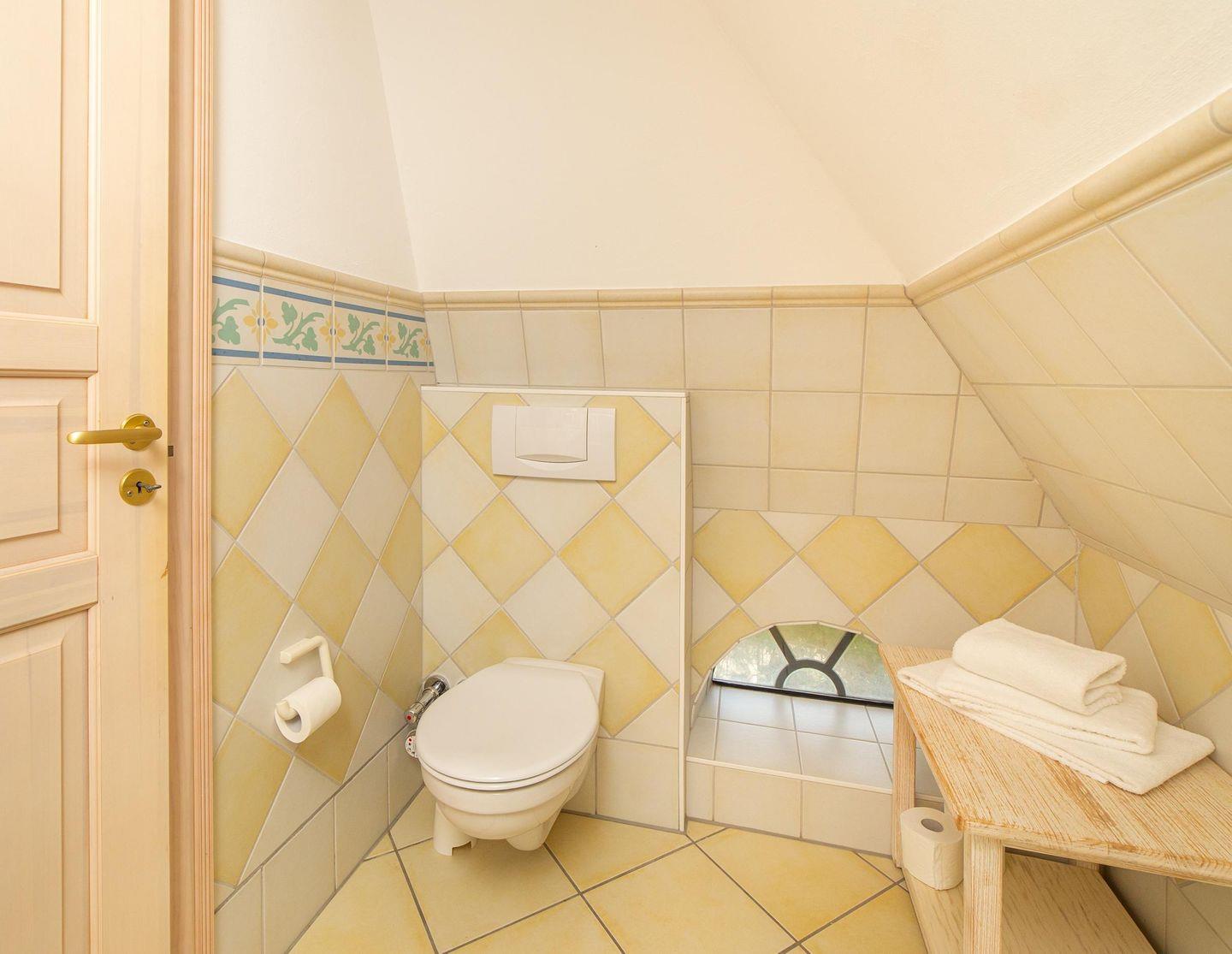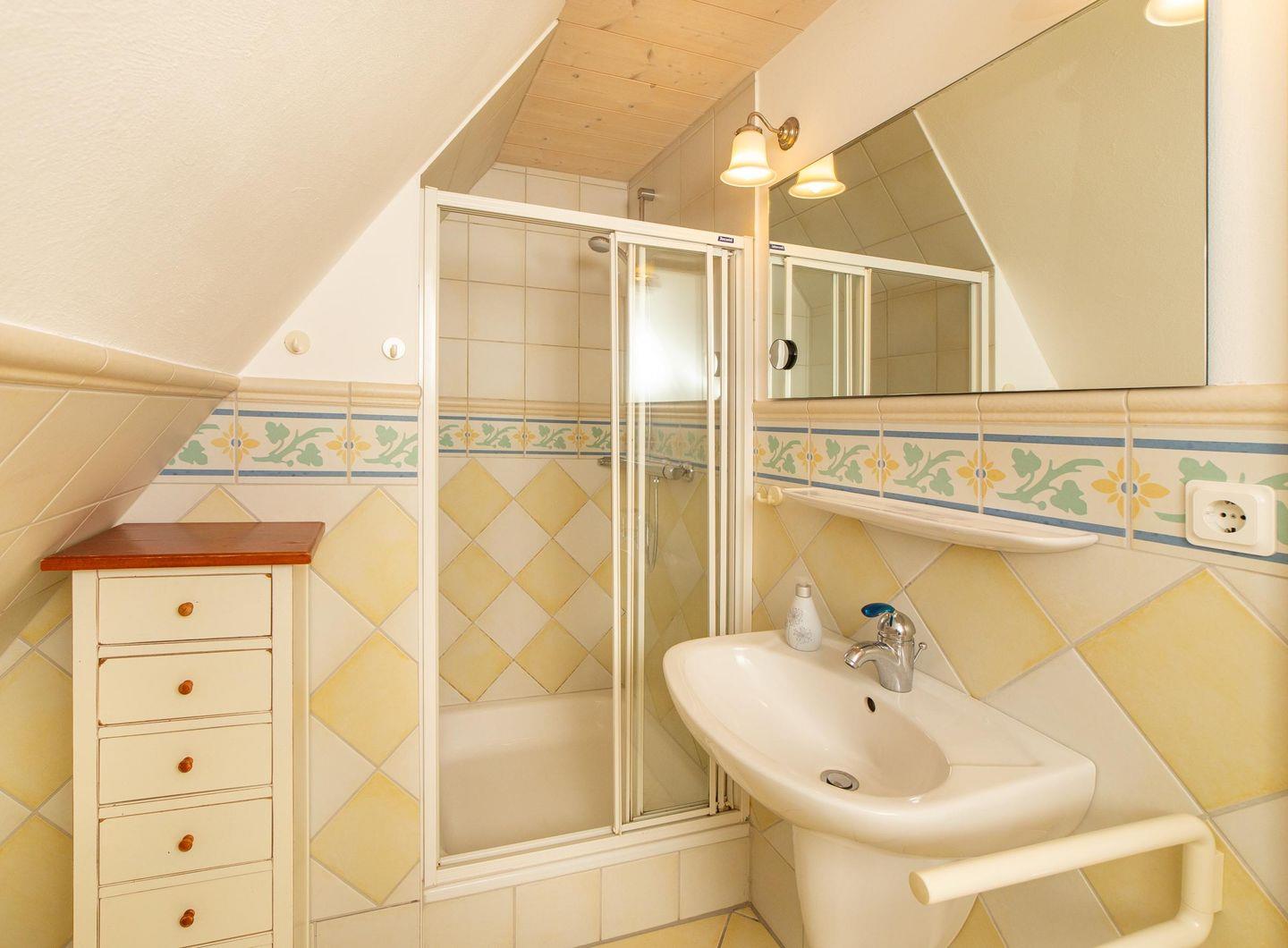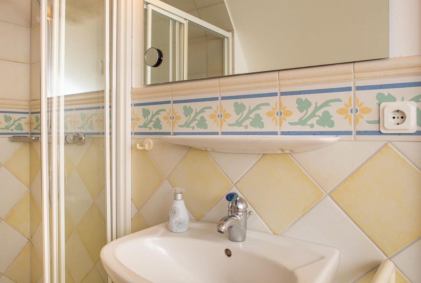 Das Bad ist hell gestaltet und mit einem Fenster ausgestattet. Es bietet Ihnen eine Dusche, ein WC und ein Waschbecken und genügend Platz in einem schönen Ambiente.