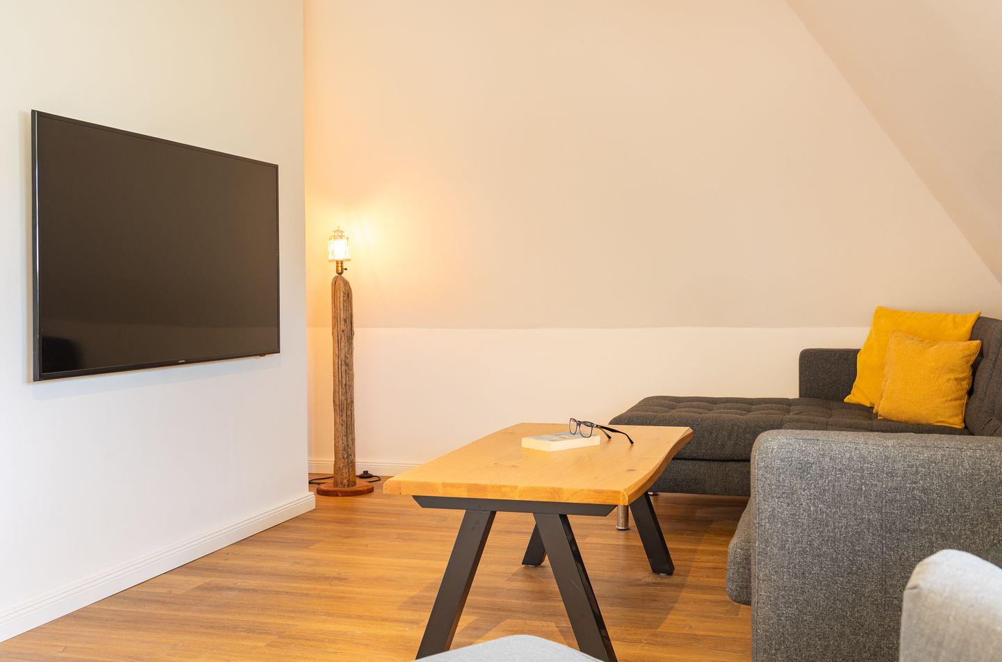 - Wohnzimmer mit Sofa, Sessel, Flachbild-TV und Essecke