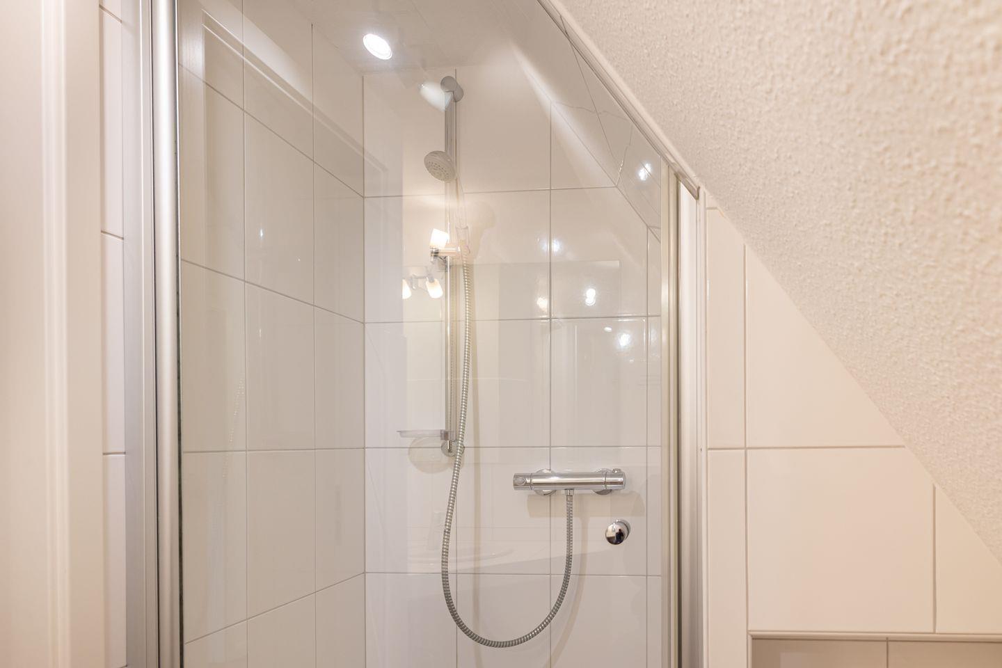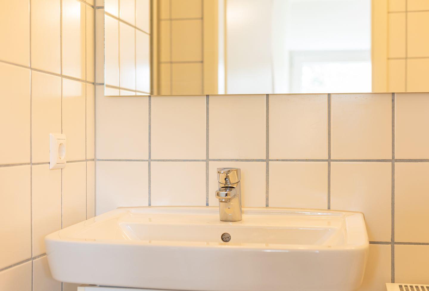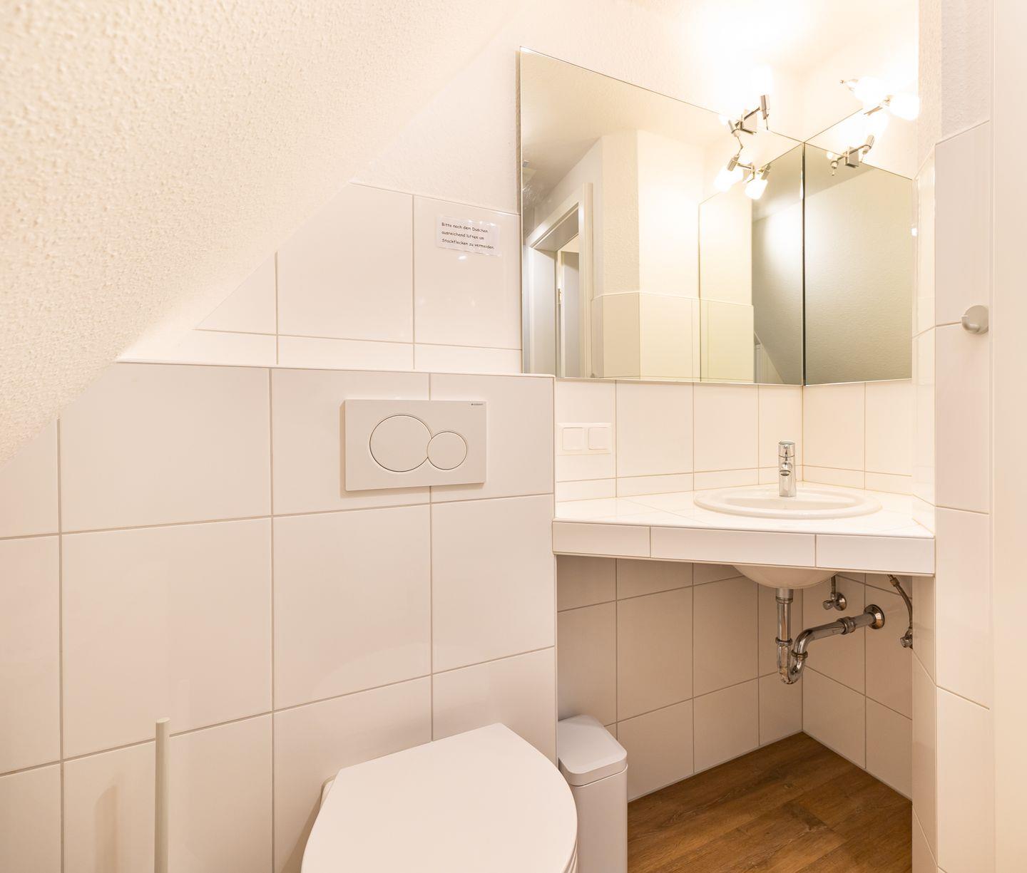 - Badezimmer mit WC, Waschbecken, Spiegel, Dusche und Fön