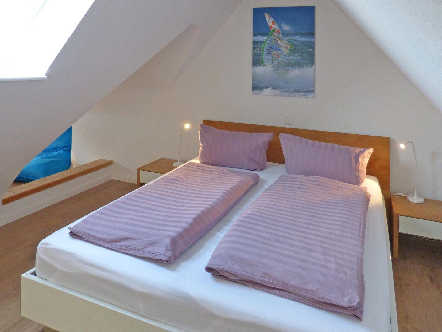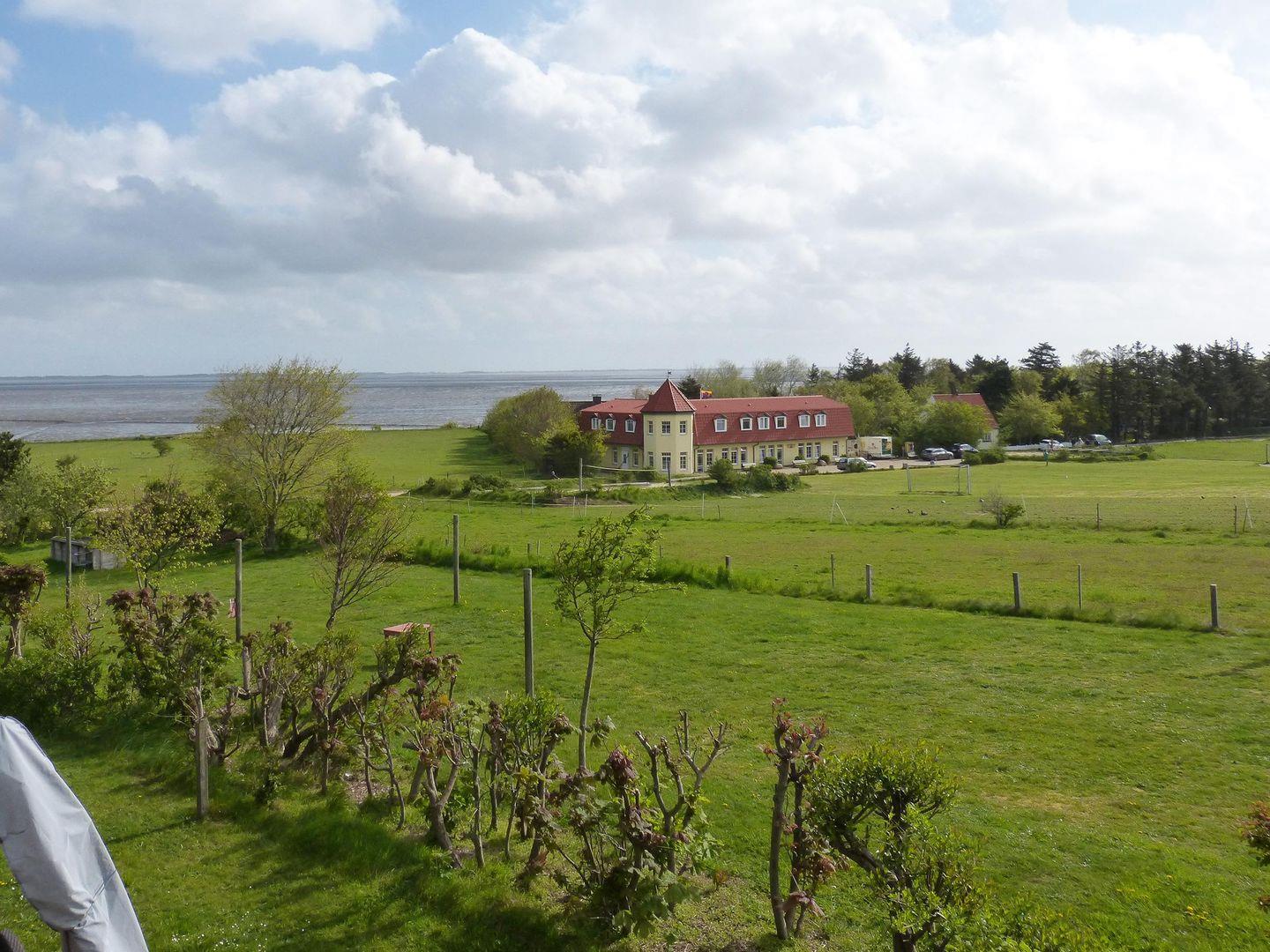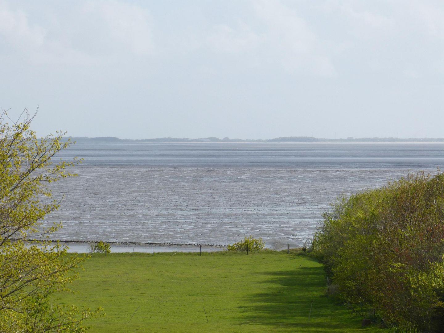 Die Ferienwohnung *Bi a Maln* (Friesisch: bei der Mühle) im 1. Ober- und Dachgeschoss rechts des Hauses *Nordlicht* in Nebel auf Amrum ist eine1,5-Zimmer-Maisonette-Ferienwohnung (ca. 44 qm Grundfläche) mit Schlafmöglichkeiten für 1 bis 2 Personen. Blick über das Wattenmeer bis nach Föhr.
