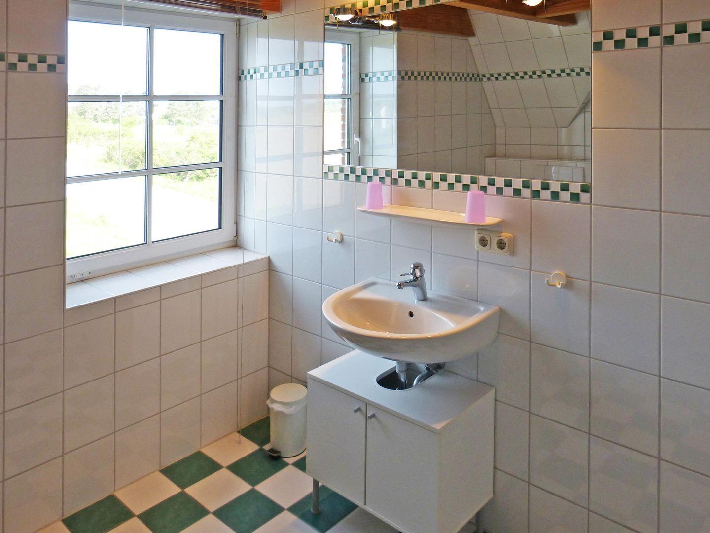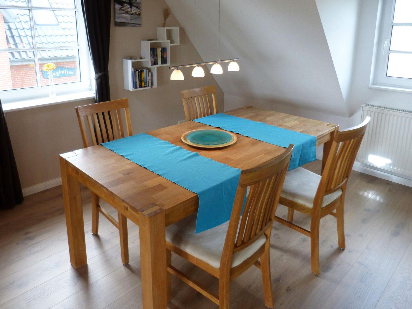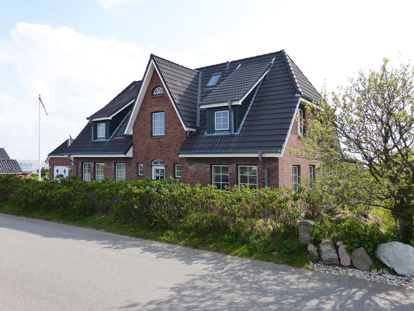 Die Ferienwohnung *Bi a Maln* (Friesisch: bei der Mühle) im 1. Ober- und Dachgeschoss rechts des Hauses *Nordlicht* in Nebel auf Amrum ist eine1,5-Zimmer-Maisonette-Ferienwohnung (ca. 44 qm Grundfläche) mit Schlafmöglichkeiten für 1 bis 2 Personen. Blick über das Wattenmeer bis nach Föhr.