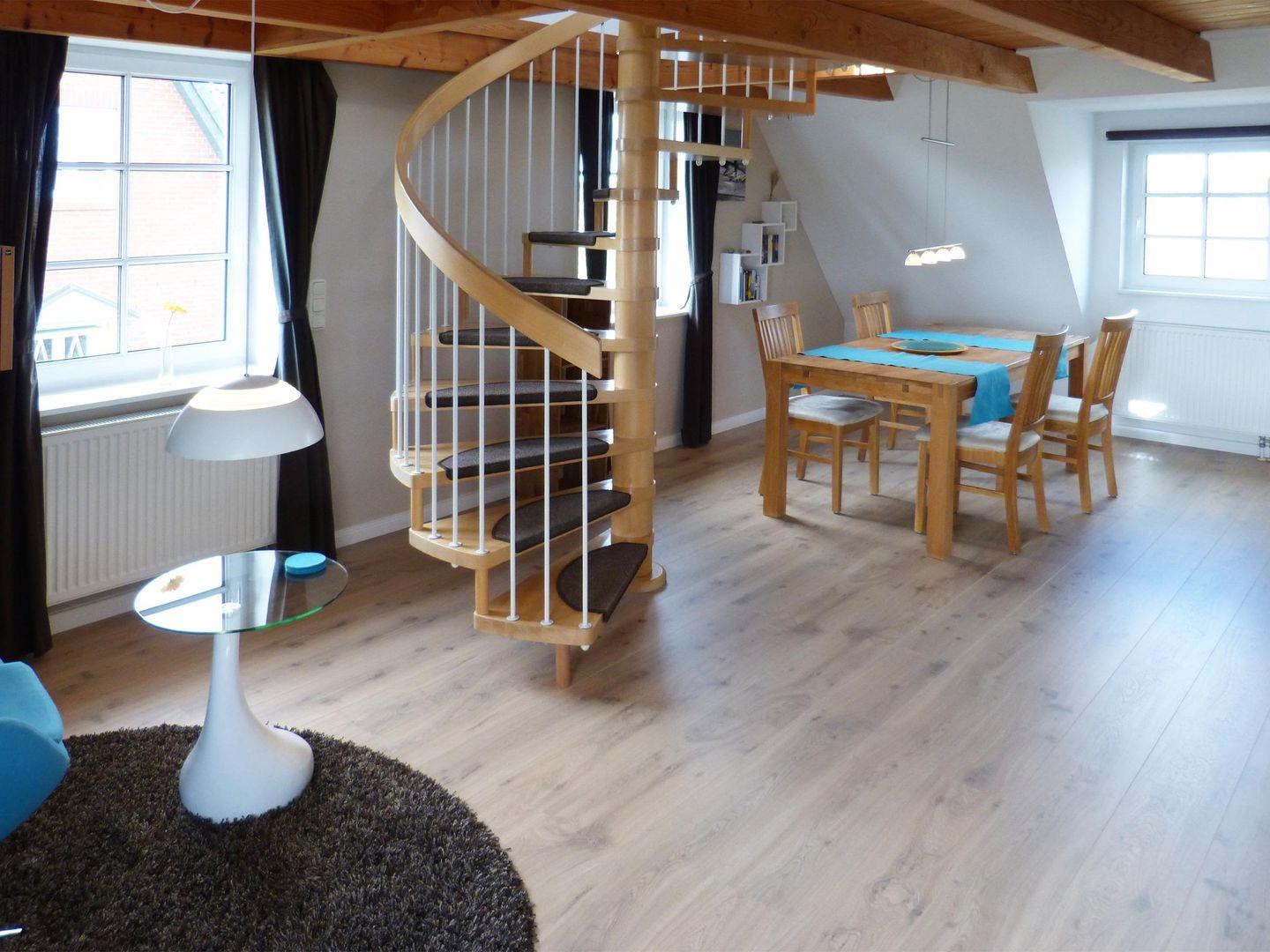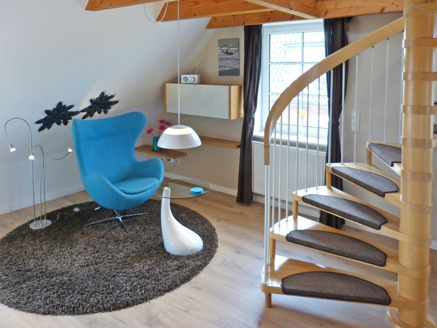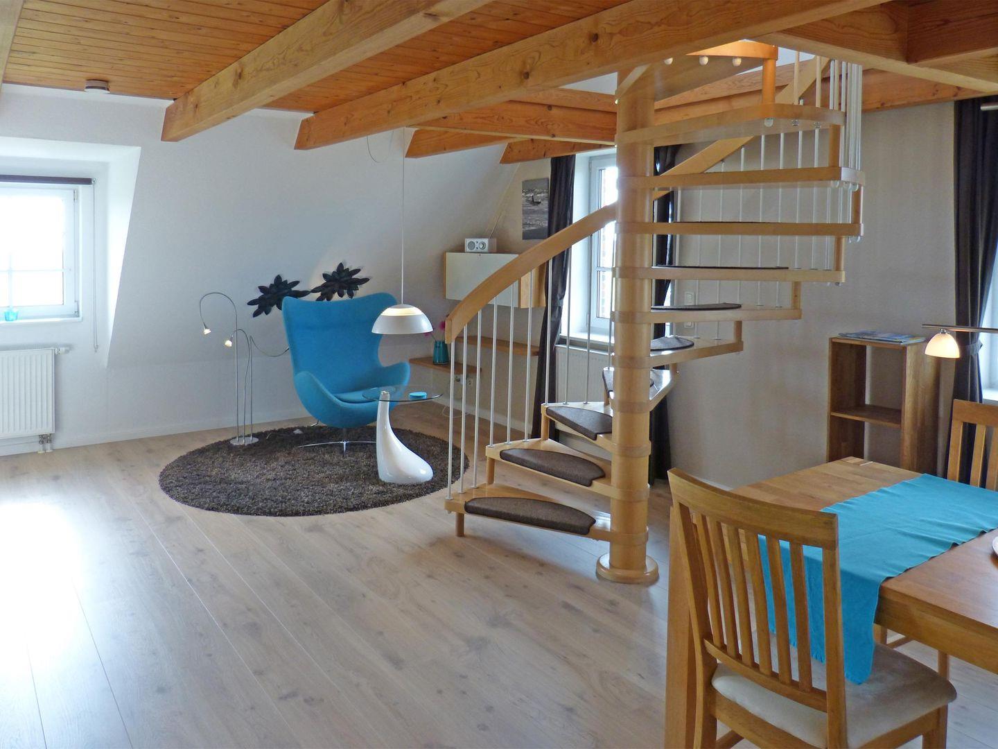 Die Wohnung verfügt über 1 Wohnraum mit WLAN, Sat-TV und offener Küchenzeile, 1 offenes Schlafzimmer im Dachgeschoss, 1 Badezimmer mit Dusche und WC. Ein PKW-Stellplatz am Haus ist vorhanden.