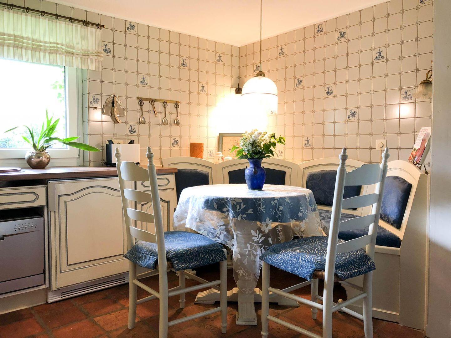 Den Gast erwartet eine ganz besondere Mischung aus biedermeierartigen Einrichtungselementen, maritimen Details, friesisch-ländlichem Küchenbereich und einem Schlafbereich mit Einbaumöbeln wie unter Deck einer klassischen Segelyacht. Der komplett offene Grundriss des Hauses gibt ein großzügiges Wohnerlebnis mit direktem Blick auf das Wattenmeer sowohl vom Wohnzimmer als auch vom Doppelbett aus im Obergeschoss.