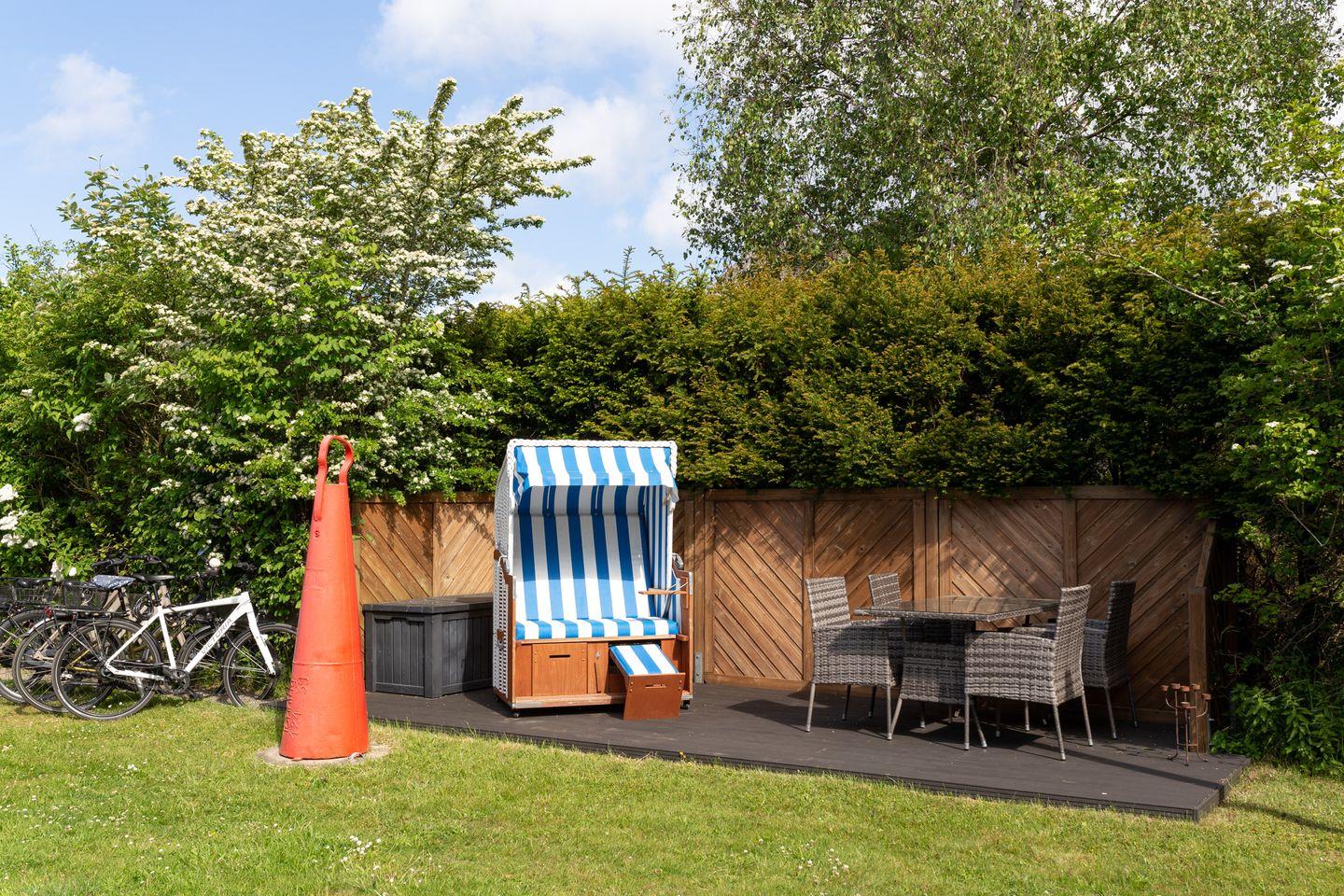 Im Garten können Sie im Strandkorb entspannen oder die Sonnenliegen und Gartenmöbel nutzen.