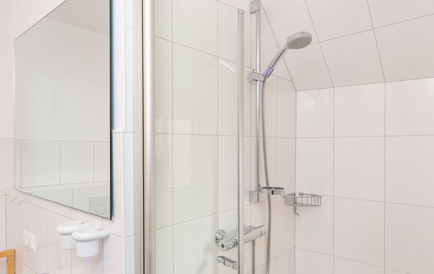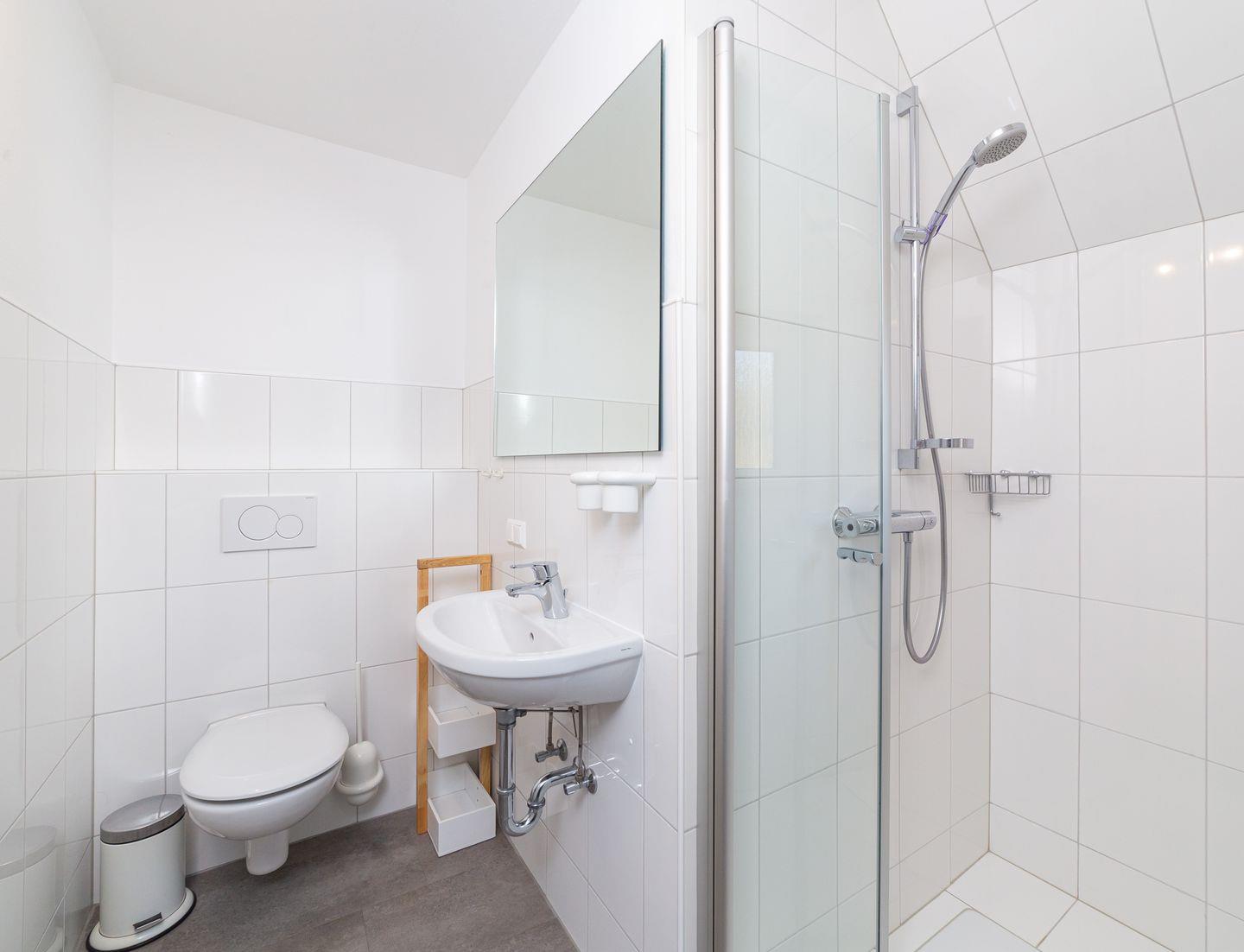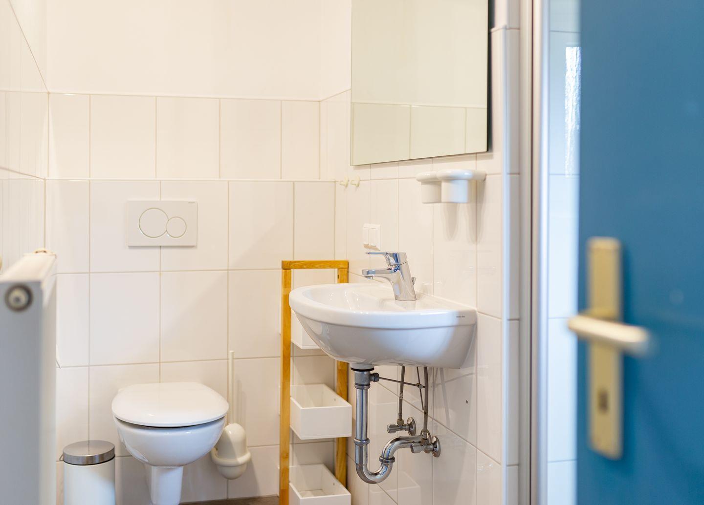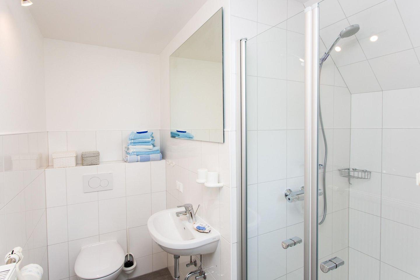 - Badezimmer mit WC, Waschbecken, Spiegel, Dusche und Fön