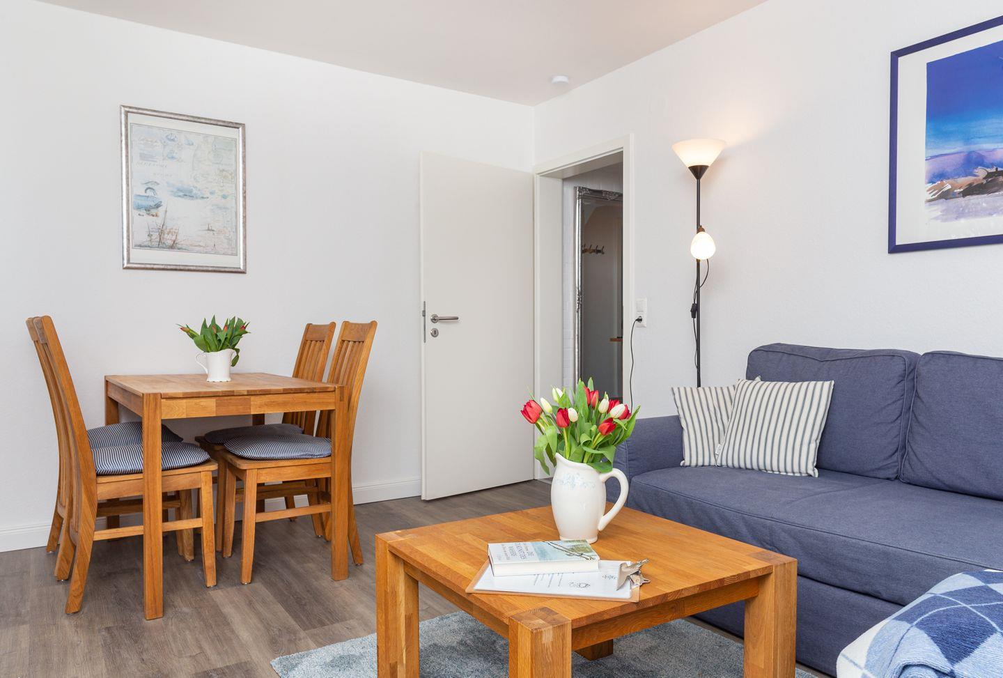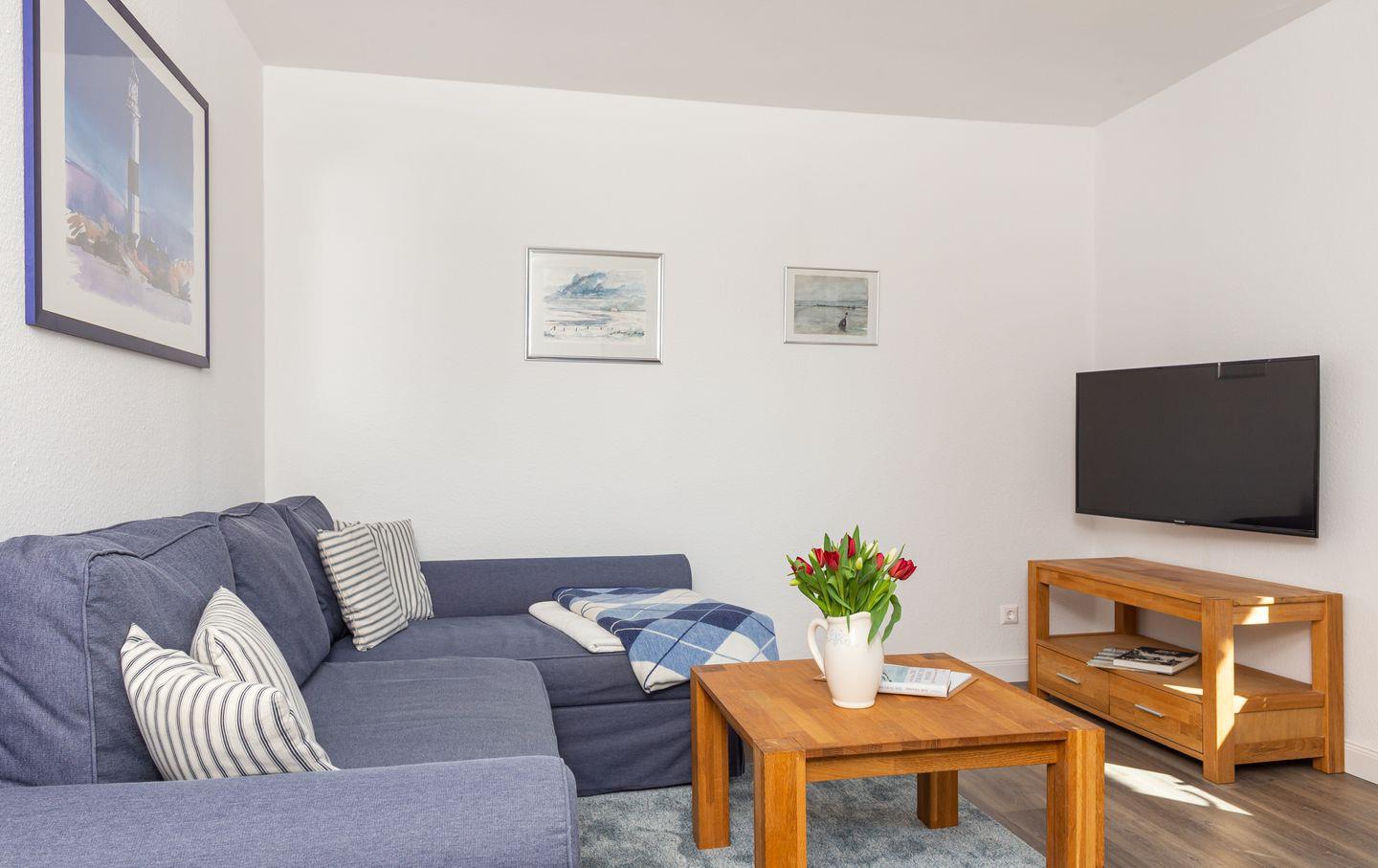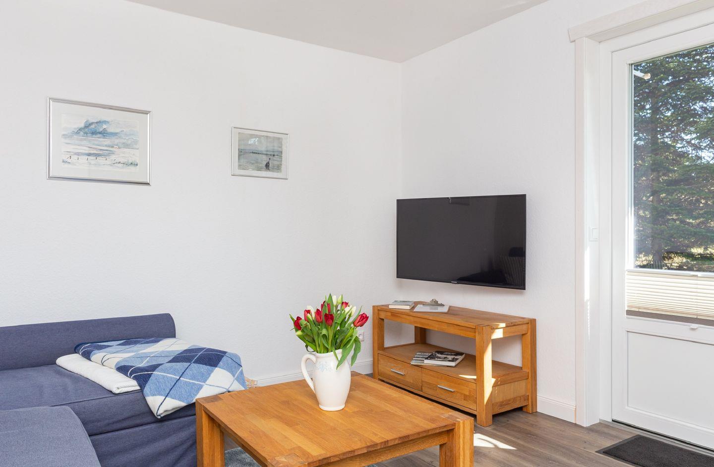- Wohnzimmer mit Sofa, Flachbild-TV und Esstisch