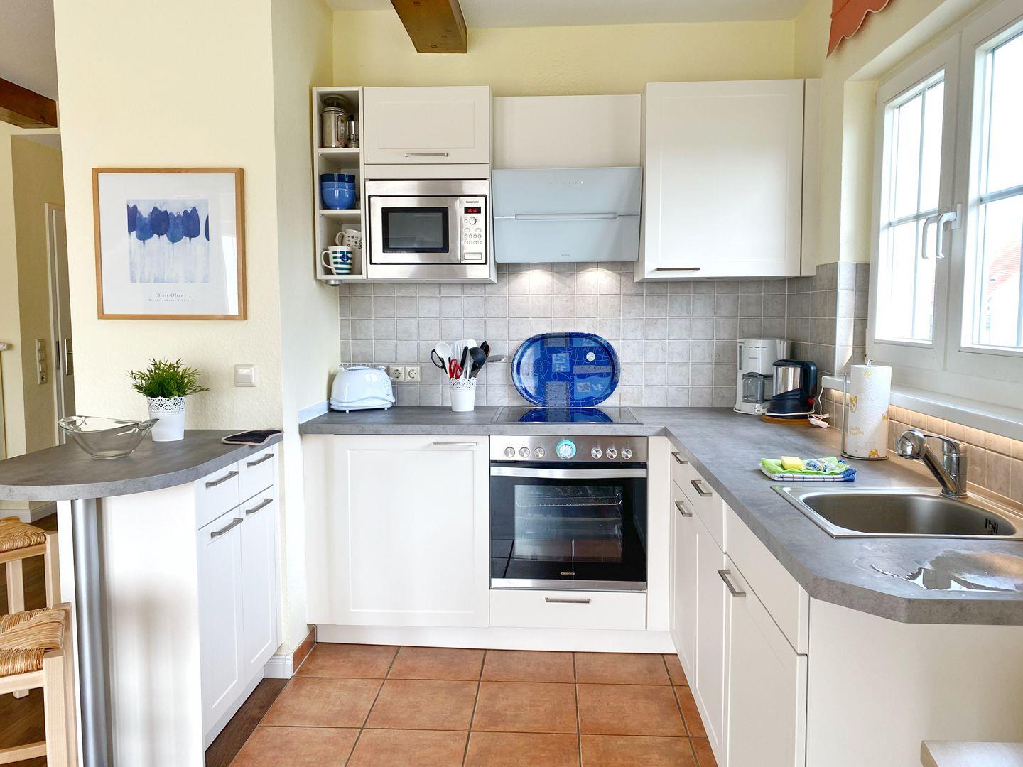 Der großzügige und helle Wohnbereich mit einer gut ausgestatteten offenen Küchenzeile verfügt über einen Herd mit Backofen, einen Geschirrspüler, einen Kühlschrank mit Gefrierfach sowie eine Mikrowelle. Weitere Küchengeräte wie Kaffeemaschine, Toaster und Wasserkocher gehören natürlich zur Grundausstattung!