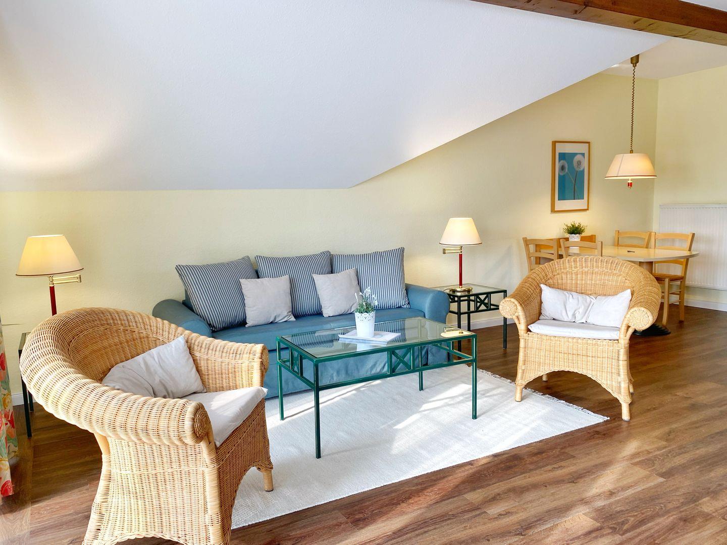 Die Couch der gemütlichen Sitzecke im Wohnzimmer bietet als Schlafcouch eine Schlafgelegenheit für 2 Personen. Über große bodentiefe Fenster gelangen Sie auf den Südbalkon. Verweilen Sie hier bei vielen sonnigen Stunden mit herrlichem Blick ins Grüne.