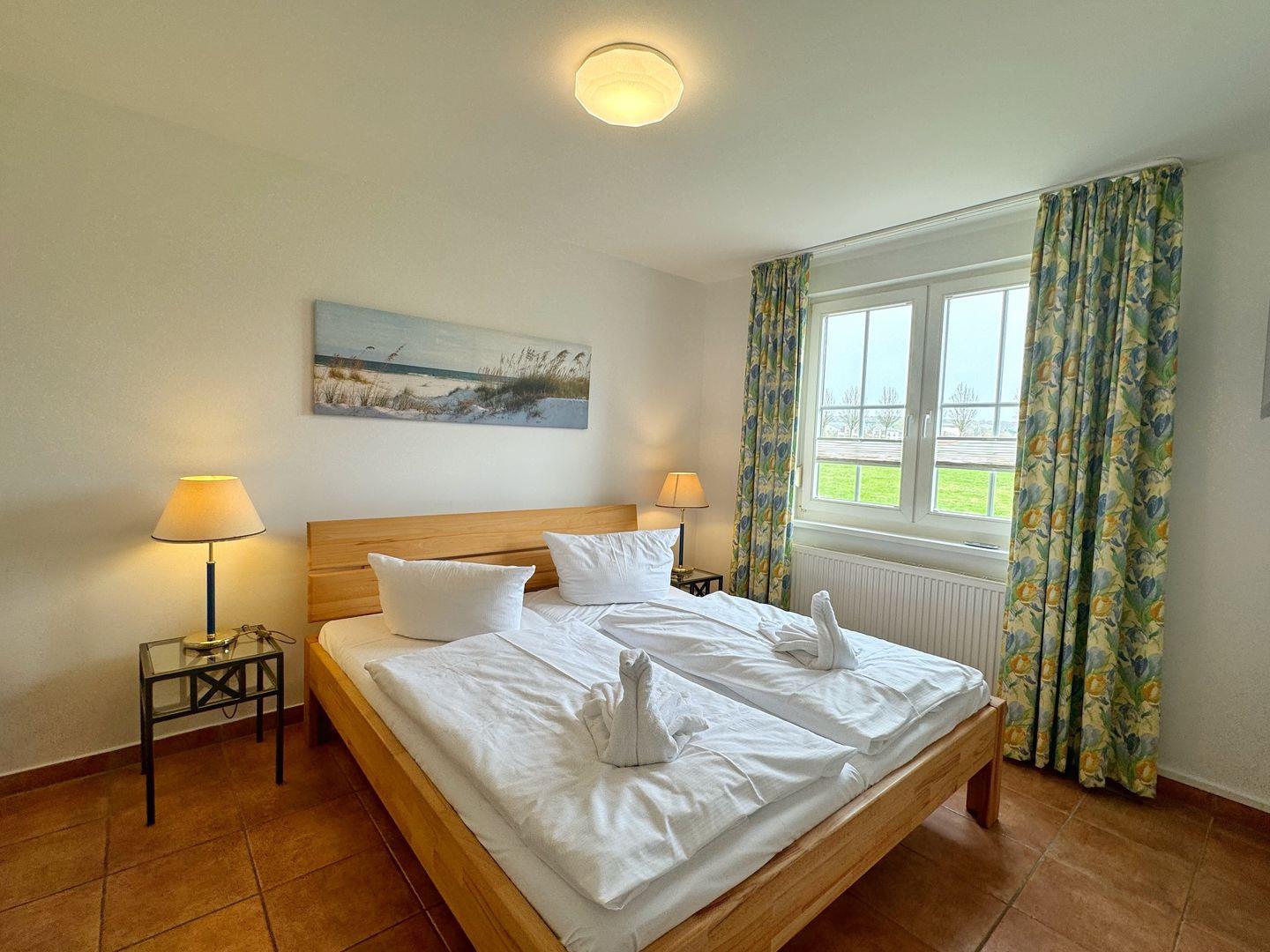 Im Schlafzimmer gibt es ein Doppelbett. Der großzügige und helle Wohnbereich bietet mit einem Schrank-Klapp-Bett Platz für zwei weitere Schlafgäste. Neben einer Couchecke gibt es einen Esstisch. Die offene Küche ist gut ausgestattet mit einem Herd, Backofen, einem Geschirrspüler, Kühlschrank mit Gefrierfach sowie eine Mikrowelle. Weitere Küchengeräte wie Kaffeemaschine, Toaster und Wasserkocher gehören natürlich zur Grundausstattung!
