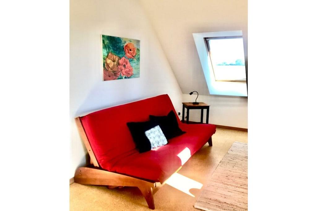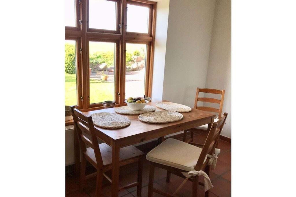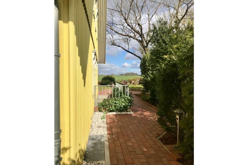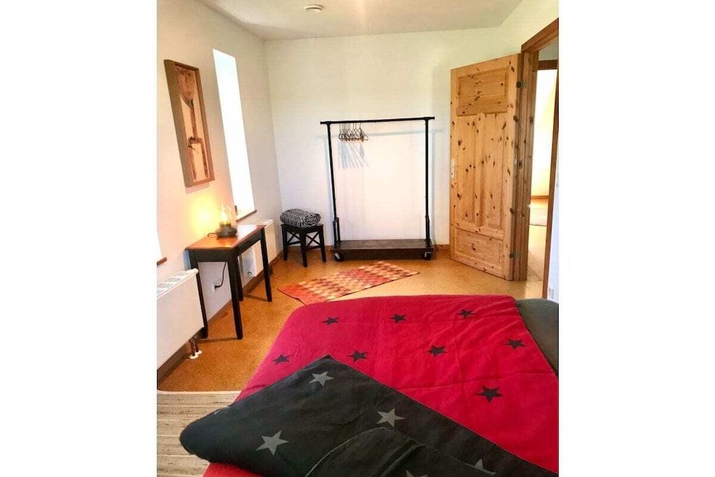 Den hyggelige, lyse lejlighed på 90 m² med separat indgang er højrefløjen i det skandinaviske træhus. Den strækker sig over to etager med et rummeligt køkken, gæstetoilet, åben stue-spisestue i stueetagen, to soveværelser og et komplet badeværelse (bruser og badekar, plus et andet toilet) på øverste etage. Den har også en åben hems/loft under taget med panoramaudsigt. På grund af den åbne beliggenhed på en bjergskråning, delvis udsigt over Muggesfelde-ejendommen og søen samt den åbne trætrappe er den ikke tilgængelig for kørestolsbrugere! Den private terrasse med havemøbler i teaktræ, liggestole og en Weber-grill ligger direkte i udkanten af marken; terrassen under asketræerne er perfekt til at nyde solnedgangen. Wi-Fi er tilgængelig til streaming med din egen enhed.