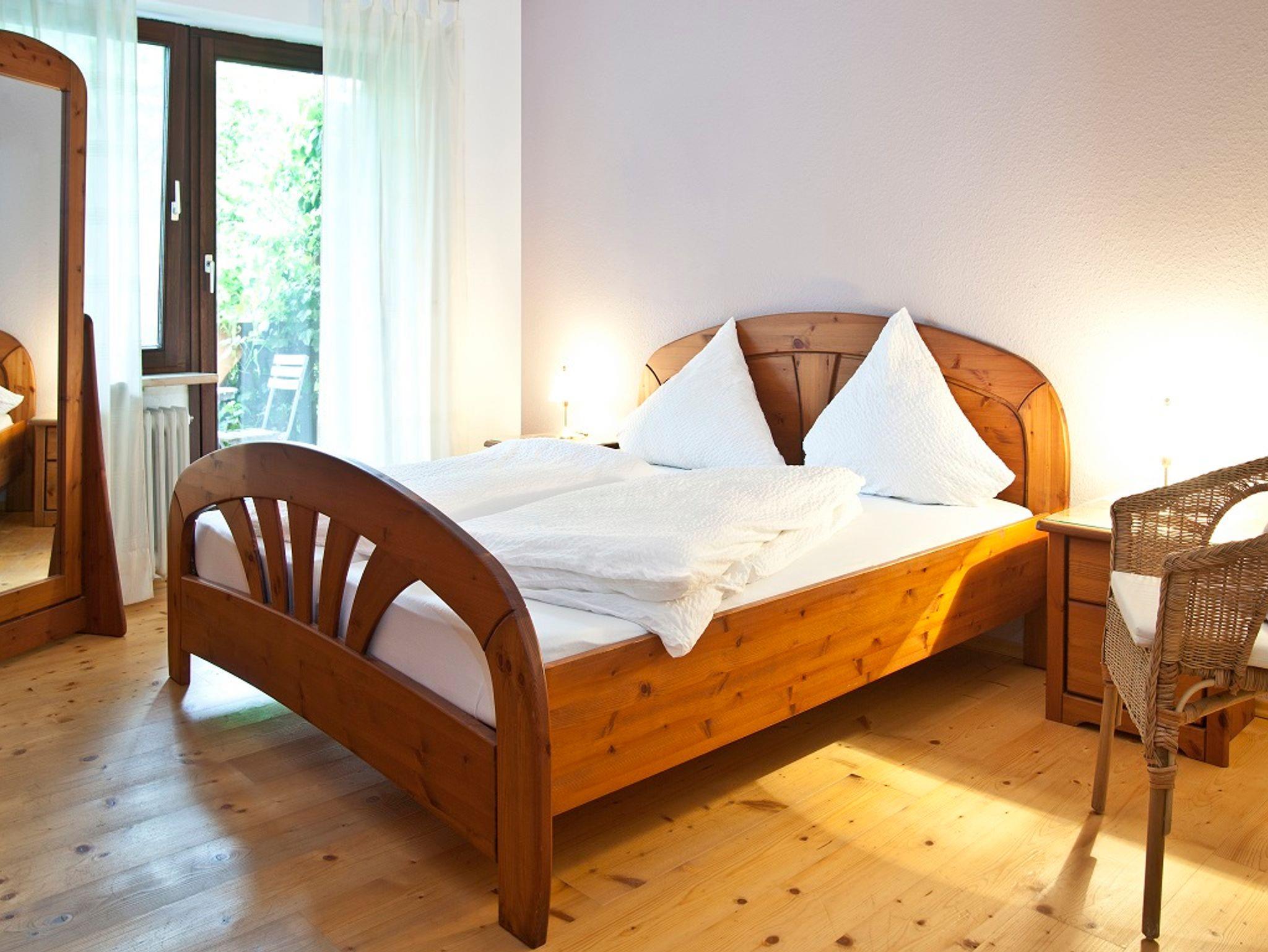 Die Ferienwohnung verfügt über zwei Schlafzimmer mit Doppelbetten, je zwei Nachtkästchen mit Leuchten und einem geräumigen Schrank.