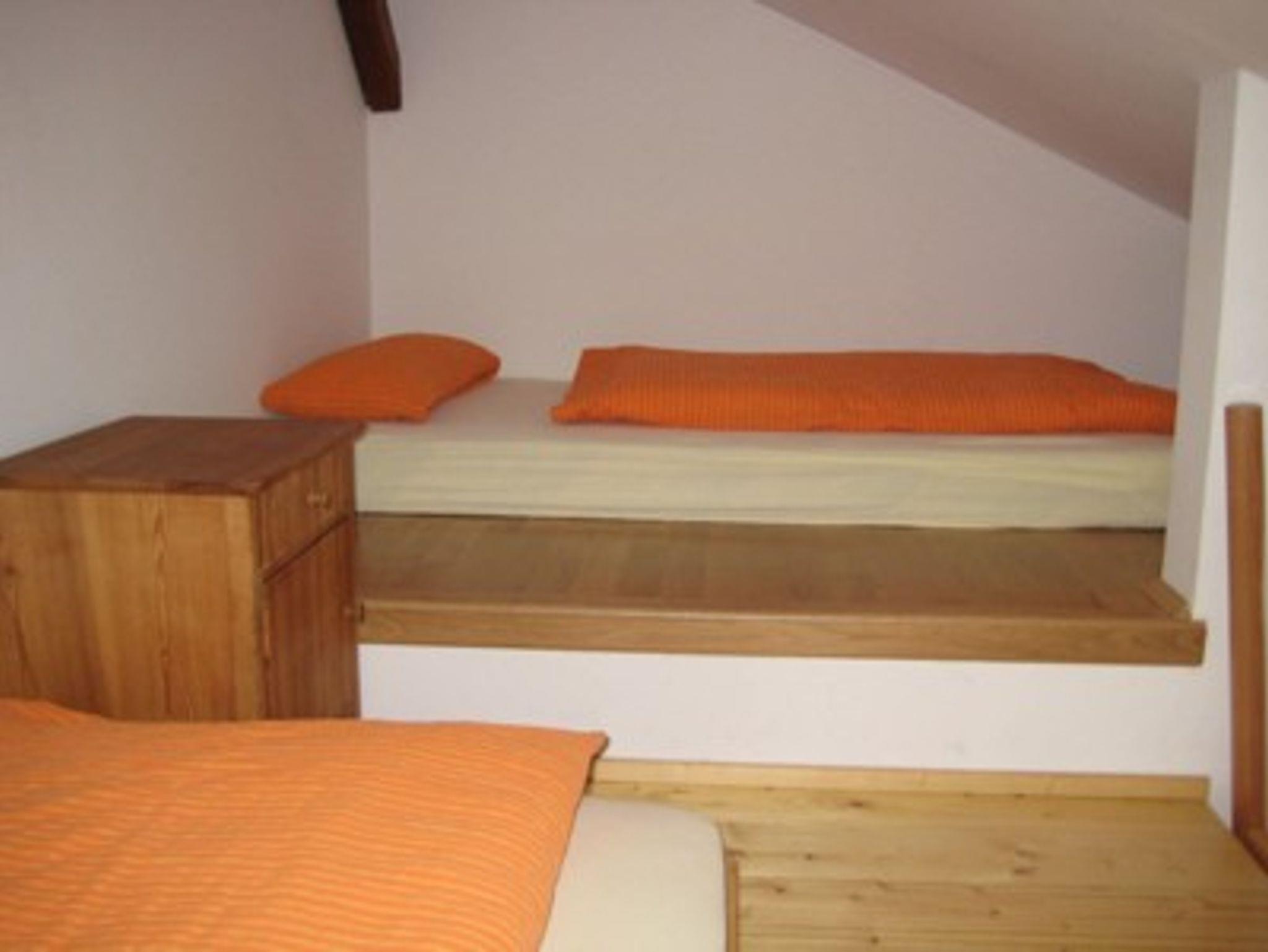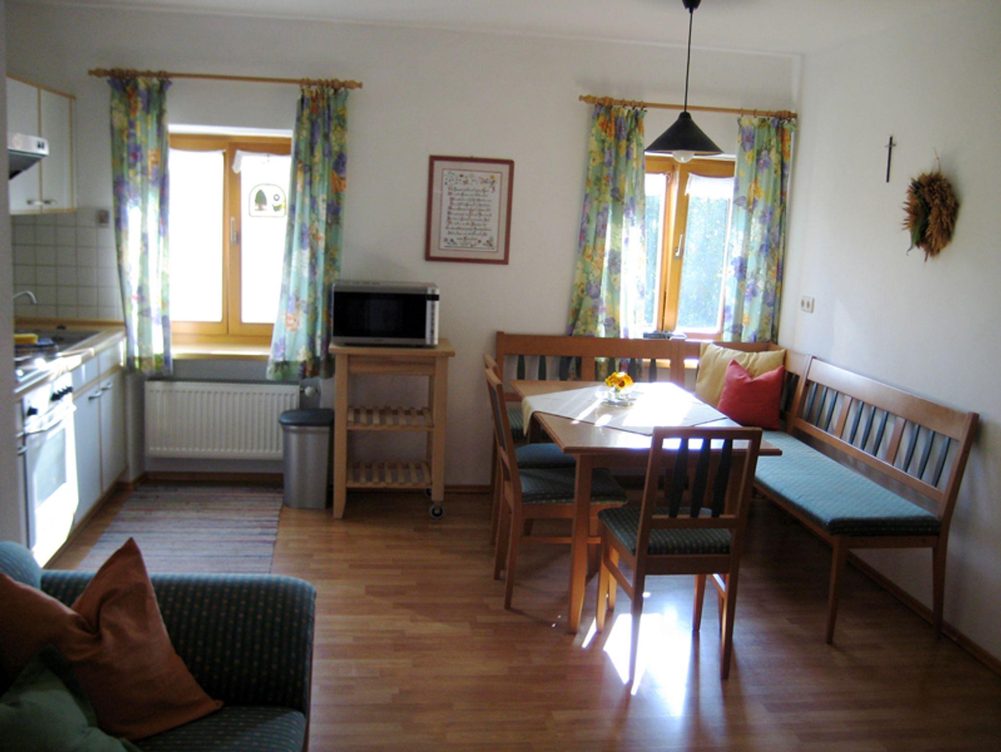 Ferienwohnung Oberdirn im Obergeschoss mit 6 Betten. Zwei getrennte Schlafräume, ein Doppelzimmer sowie ein weiteres Zimmer mit Doppelbett und Etagenbett. Großzügige, sonnige Wohnküche mit Waldblick. Bad mit DU/WC .
