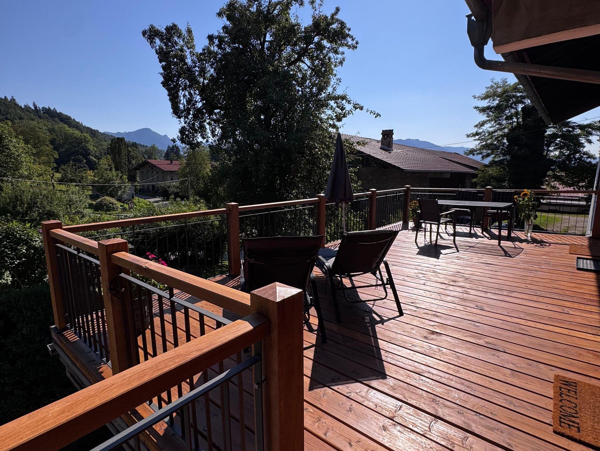 Besonderheit: Südseitige Terrasse mit Liegen und Sonnenschirm mit traumhaften Blick auf Wiesen und Berge für erholsame Stunden.