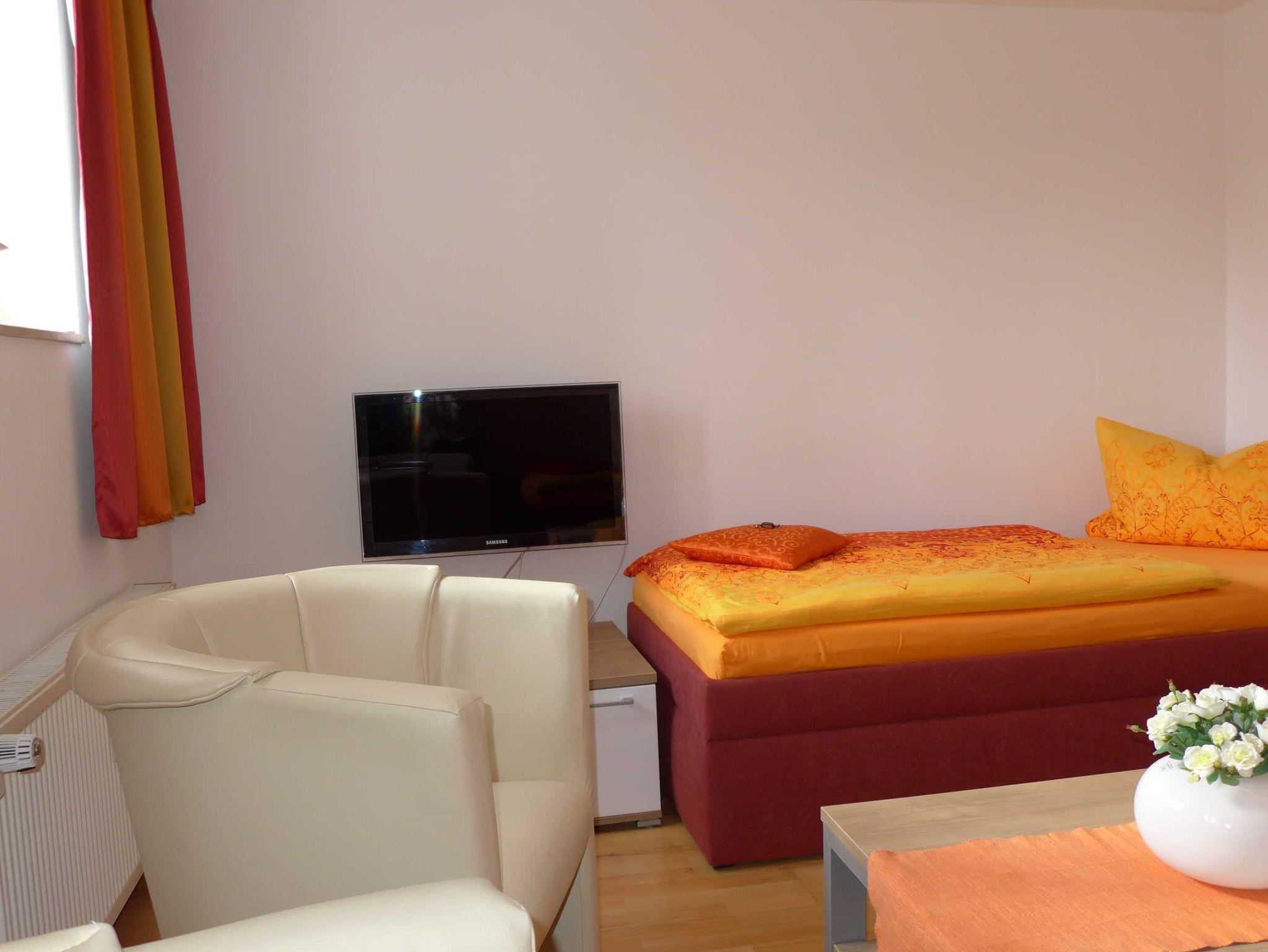 Gemütlicher Wohn-Schlafraum, weiterer Schlafraum separat neben der Ferienwohnung für 3. und 4. Person, Küche mit großem Esstisch, Flur und Bad.