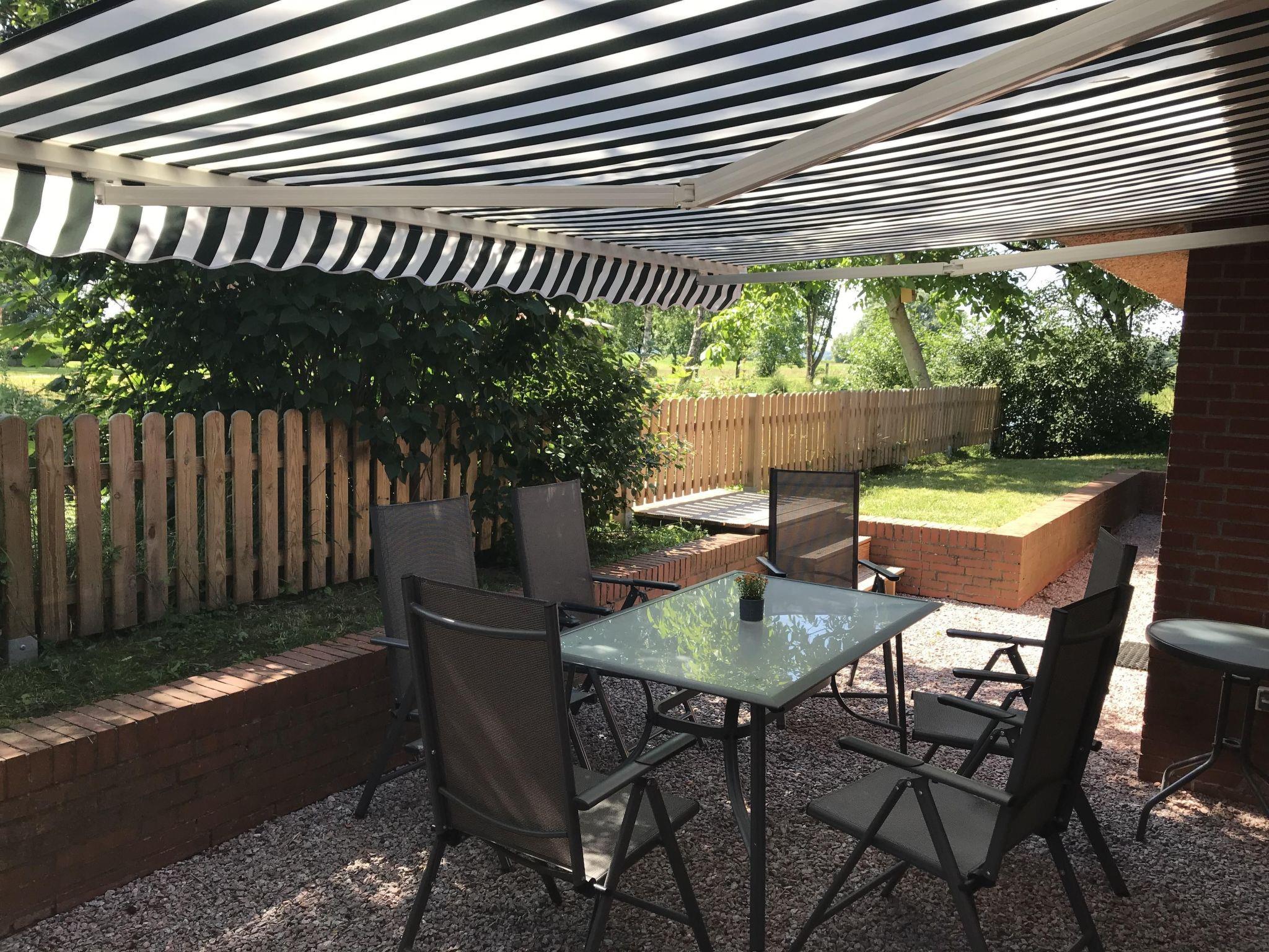 Small garden with cosy terrace incl. awning and electric barbecue and own jetty / boat landing stage in the Wilster Au, from our jetty you have direct access to the Wilster Au, which invites you to go canoeing, pedal boating and stand-up paddling and, if you like, swimming and fishing.