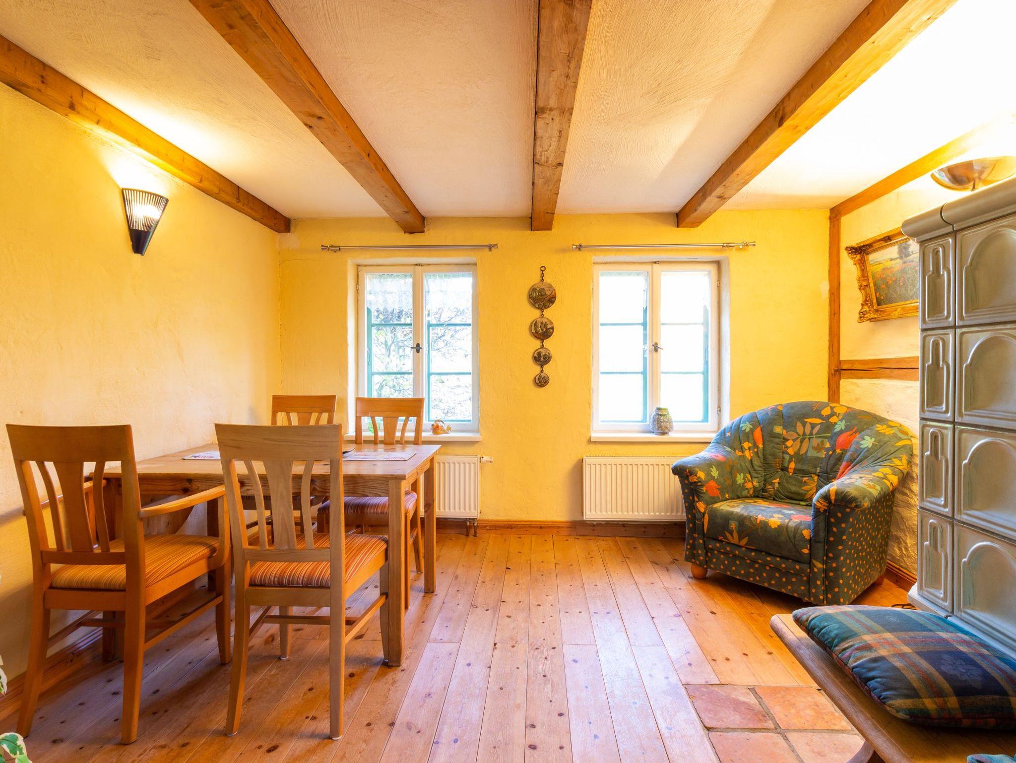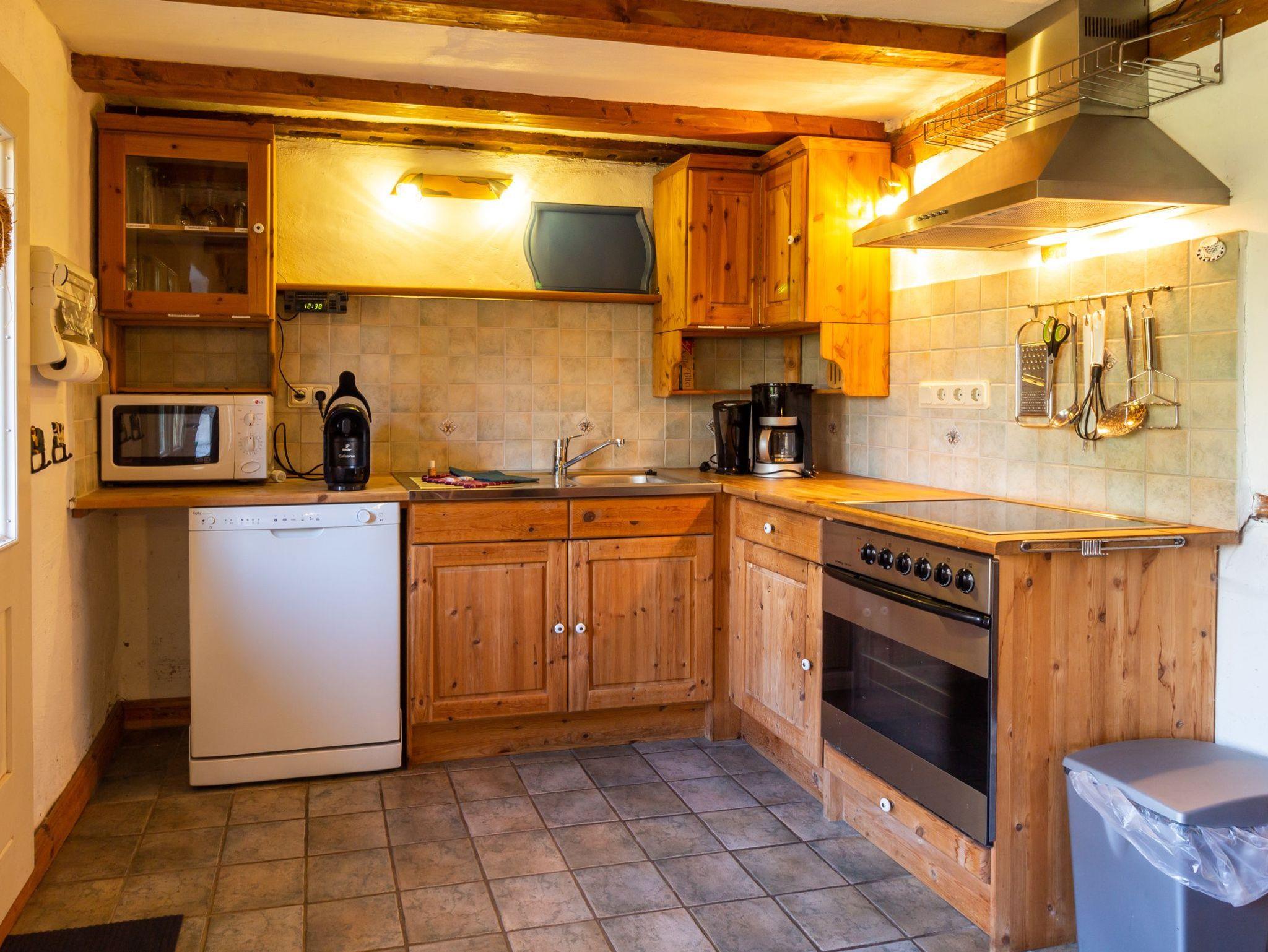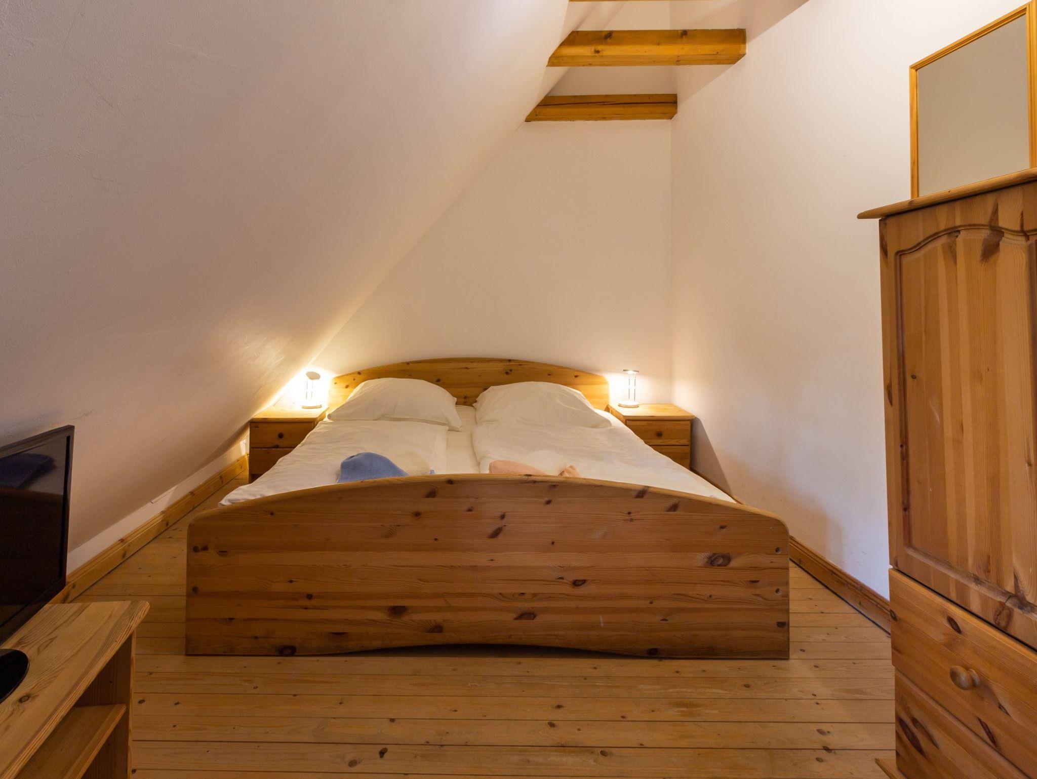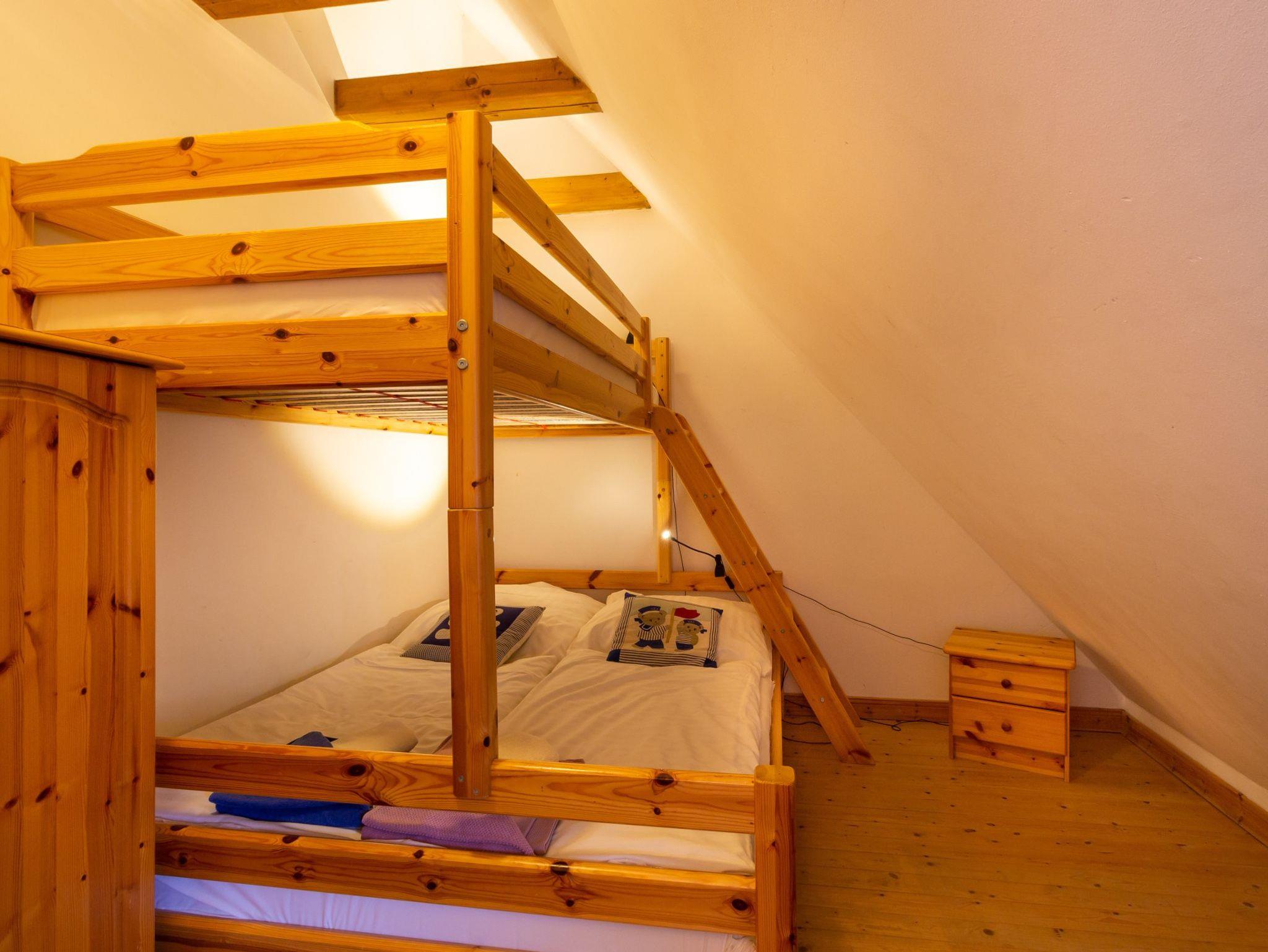 Hochwertig ausgestattetes Ferienhaus. Im Erdgeschoss separate Küche mit Esstisch, Wohnzimmer mit Kachelofen und Bad mit Badewanne. Im Obergeschoss ein Schlafzimmer mit Doppelbett, ein zweites Schlafzimmer mit einem Doppelstockbett, unten als Doppelbett (1,40 m breit) und einem Oberbett. Dusche/WC.