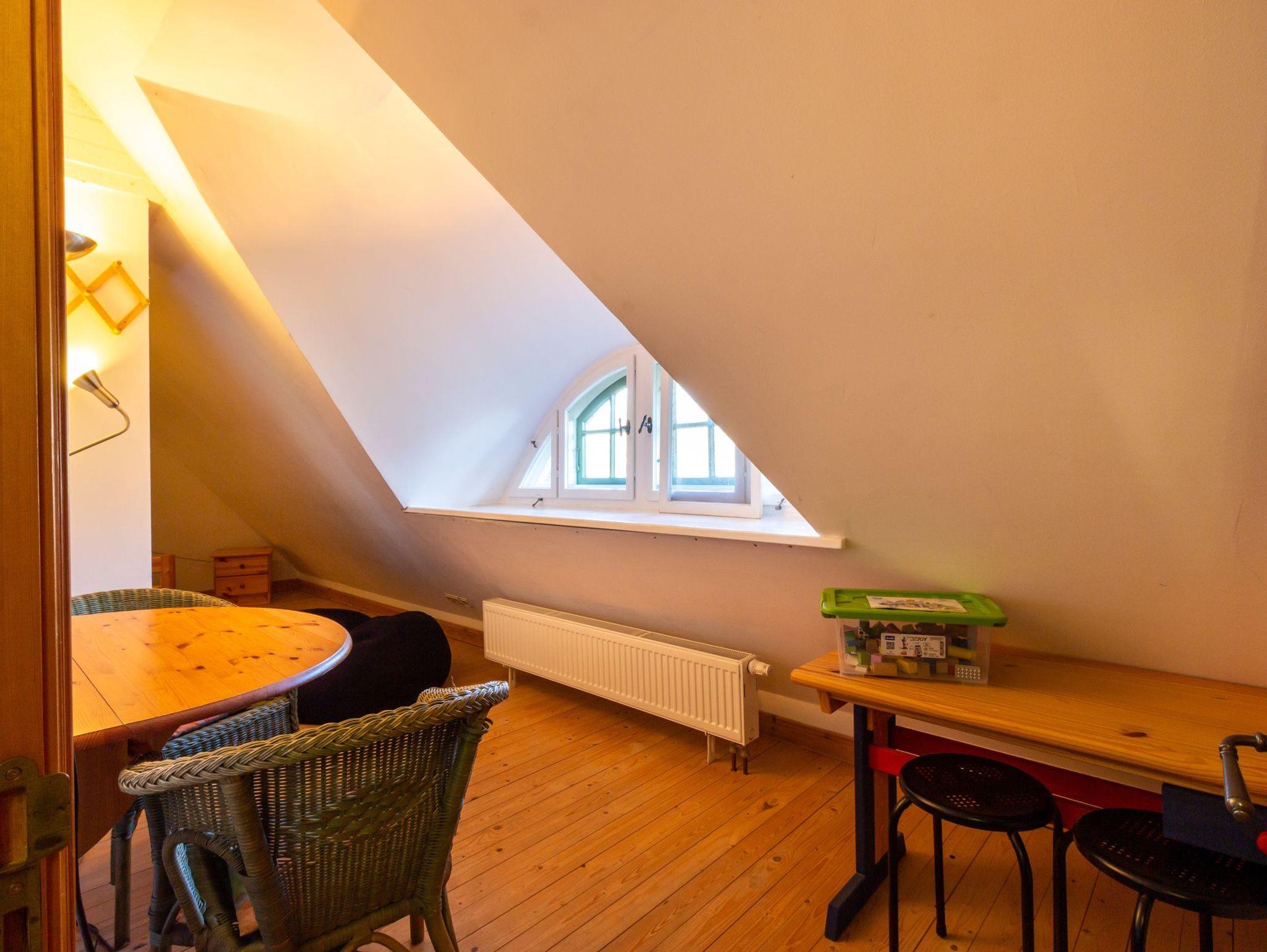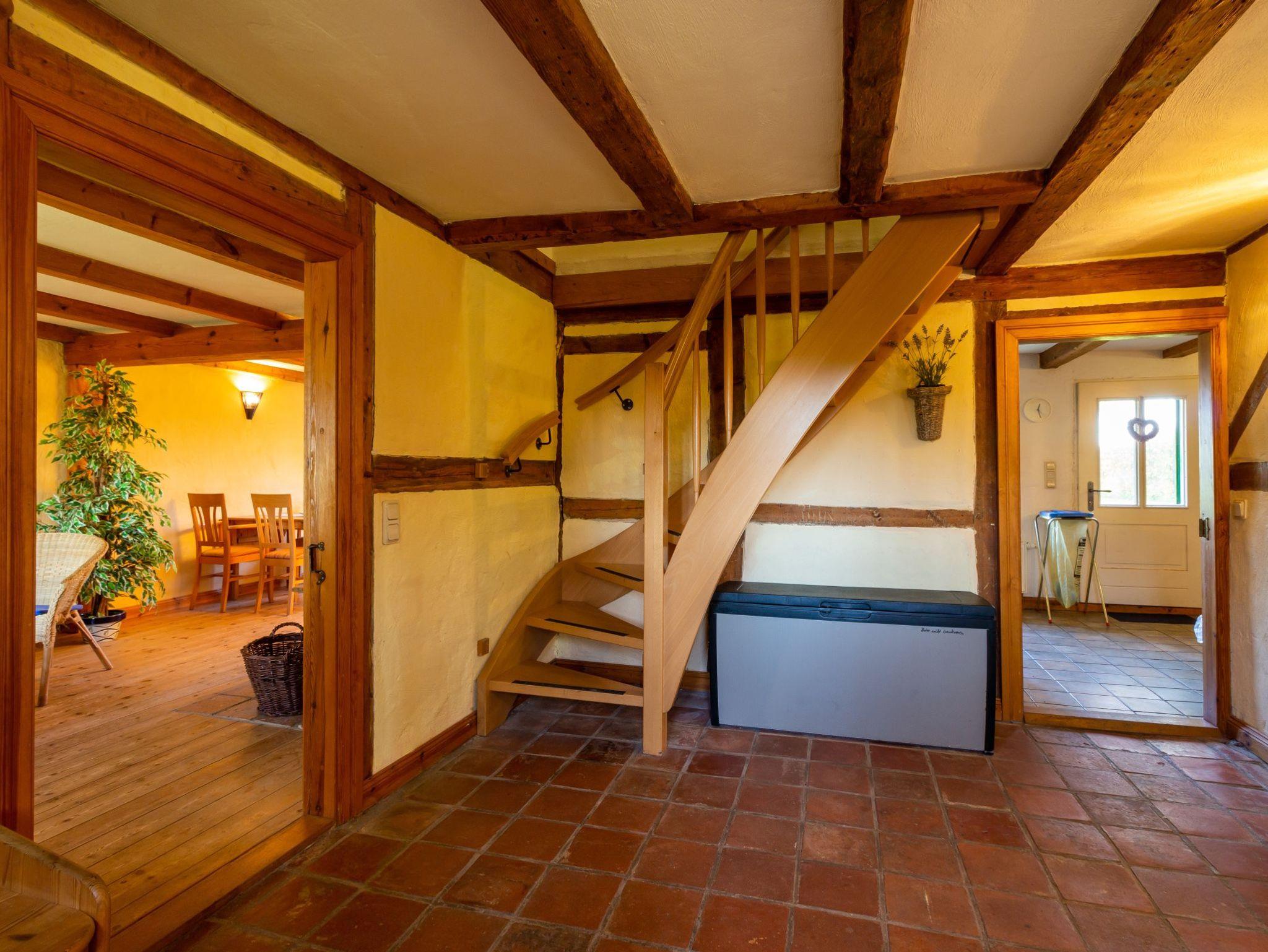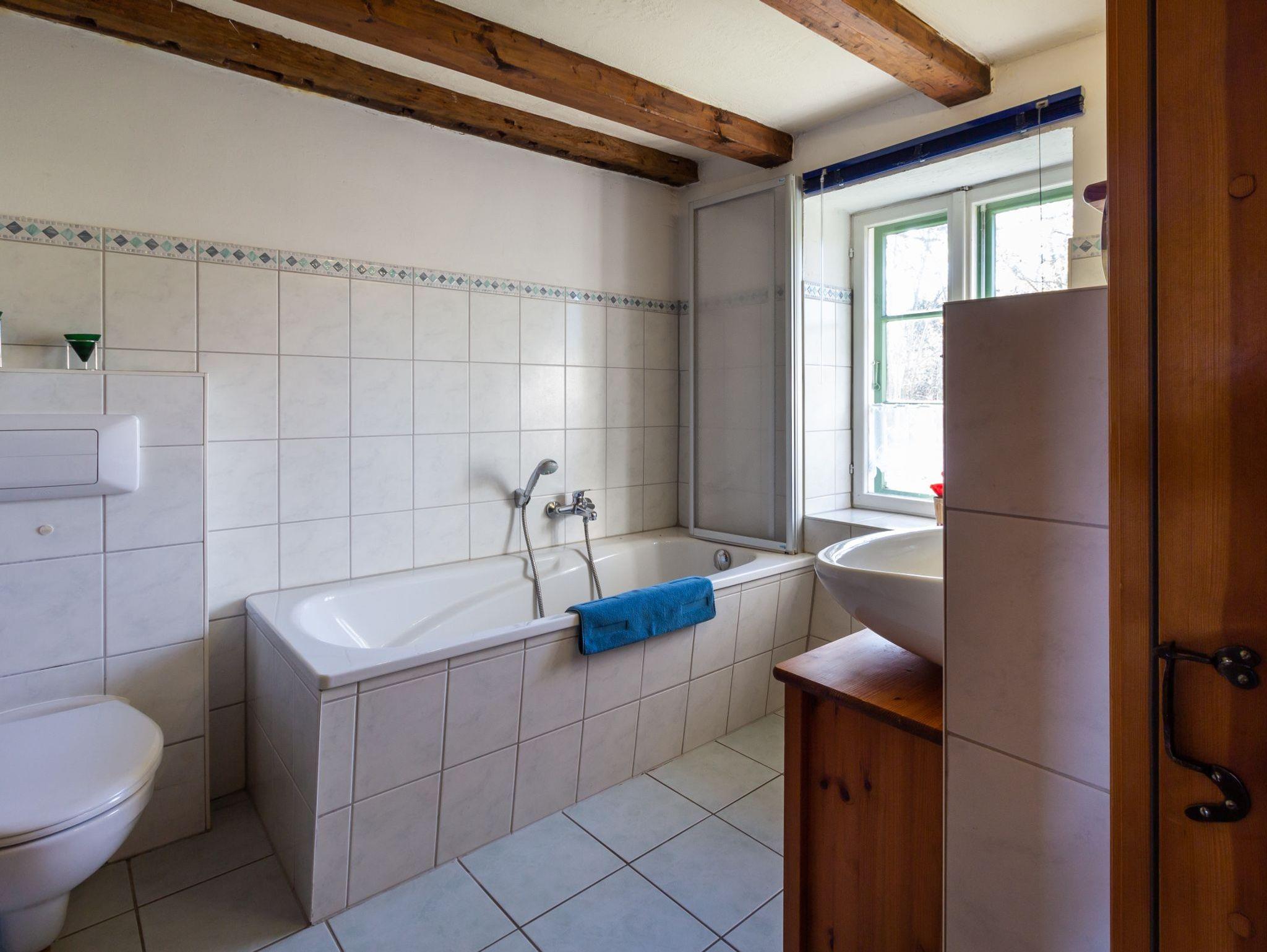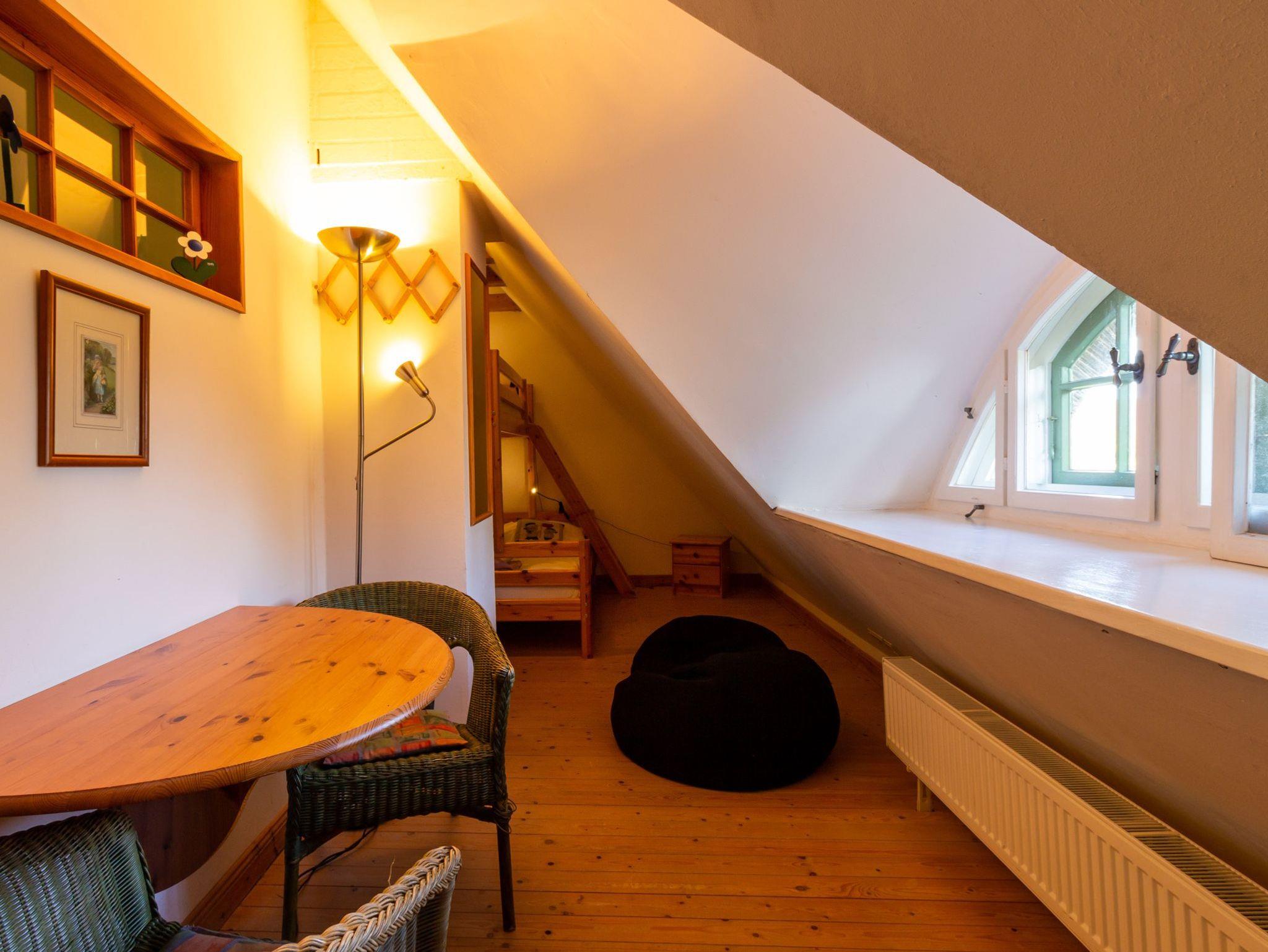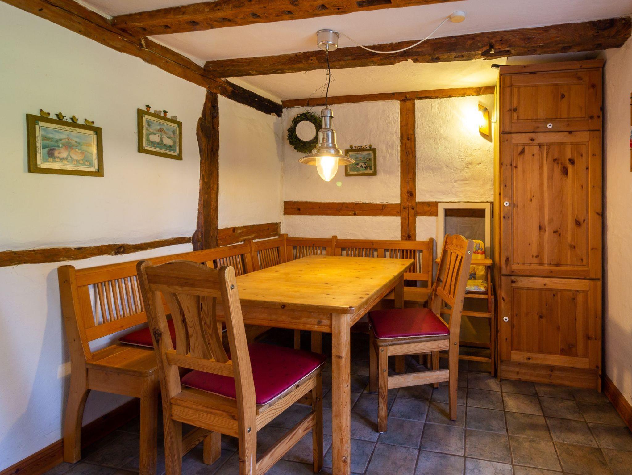 Hochwertig ausgestattetes Ferienhaus. Im Erdgeschoss separate Küche mit Esstisch, Wohnzimmer mit Kachelofen und Bad mit Badewanne. Im Obergeschoss ein Schlafzimmer mit Doppelbett, ein zweites Schlafzimmer mit einem Doppelstockbett, unten als Doppelbett (1,40 m breit) und einem Oberbett. Dusche/WC.