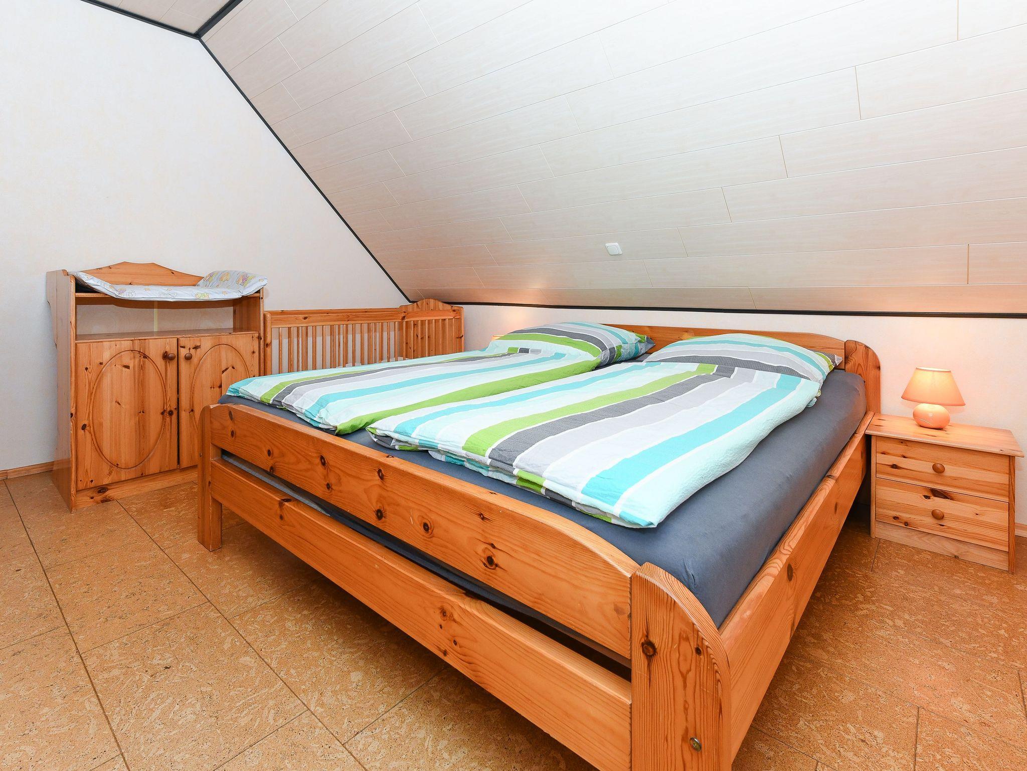 Größe ca. 50 Quadratmeter, Wohnraum mit integrierter Küche und mit Schlafmöglichkeit, Schlafzimmer, Badezimmer mit Dusche, Waschtisch und WC, Obergeschoss, Balkon, optimal für 2 bis 4 Personen.