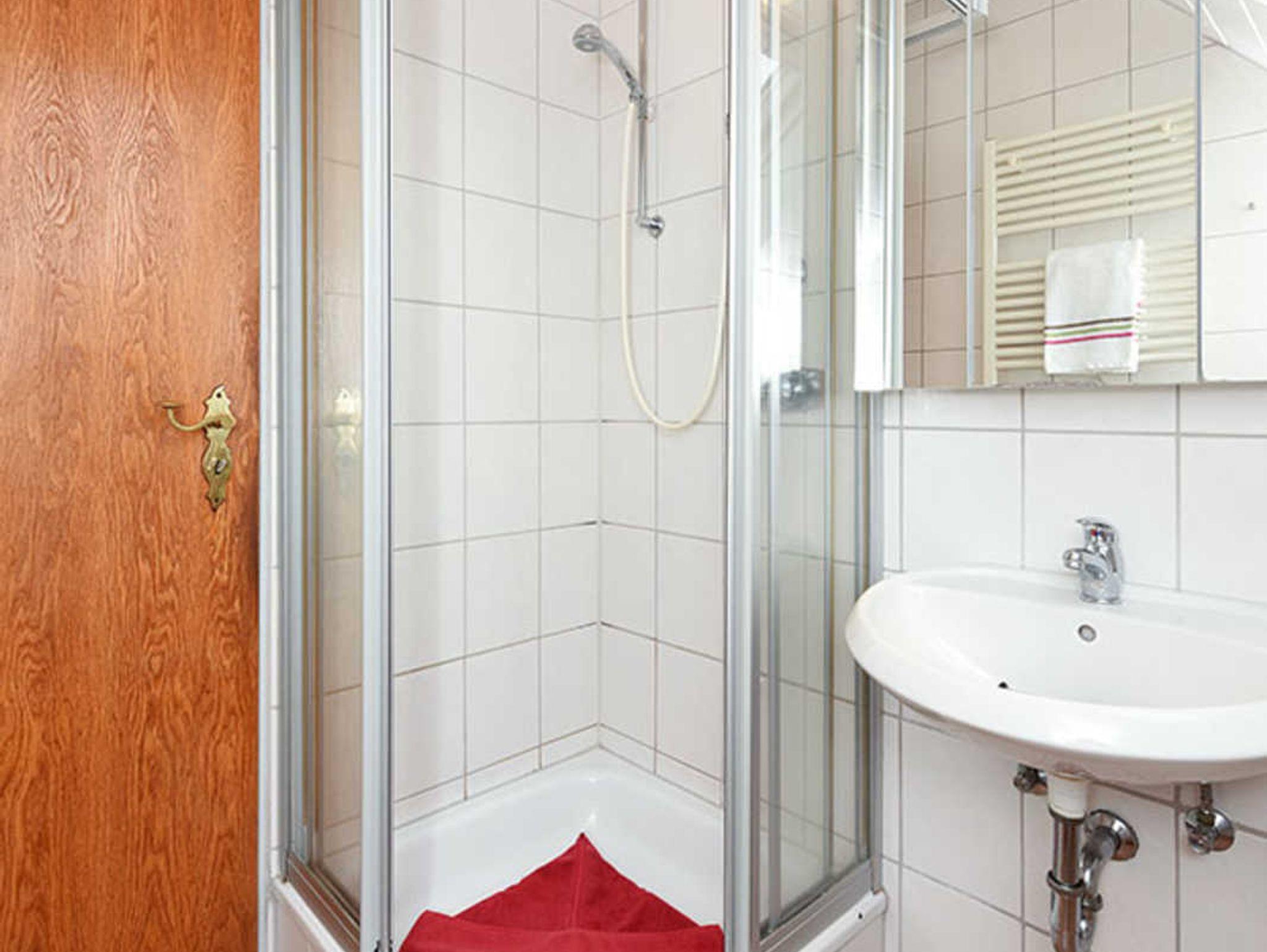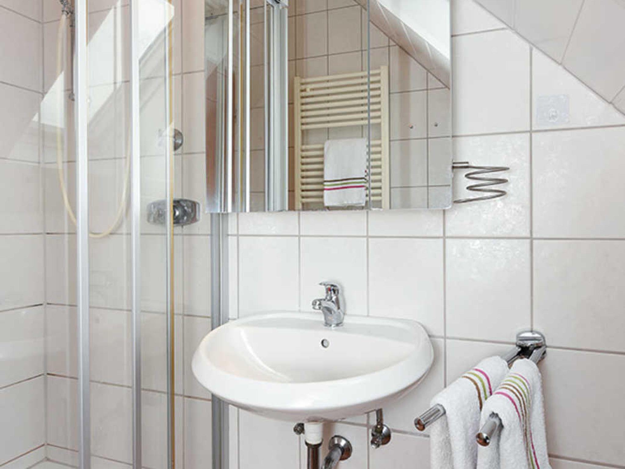 Badezimmer mit Dusche, Waschtisch und WC
