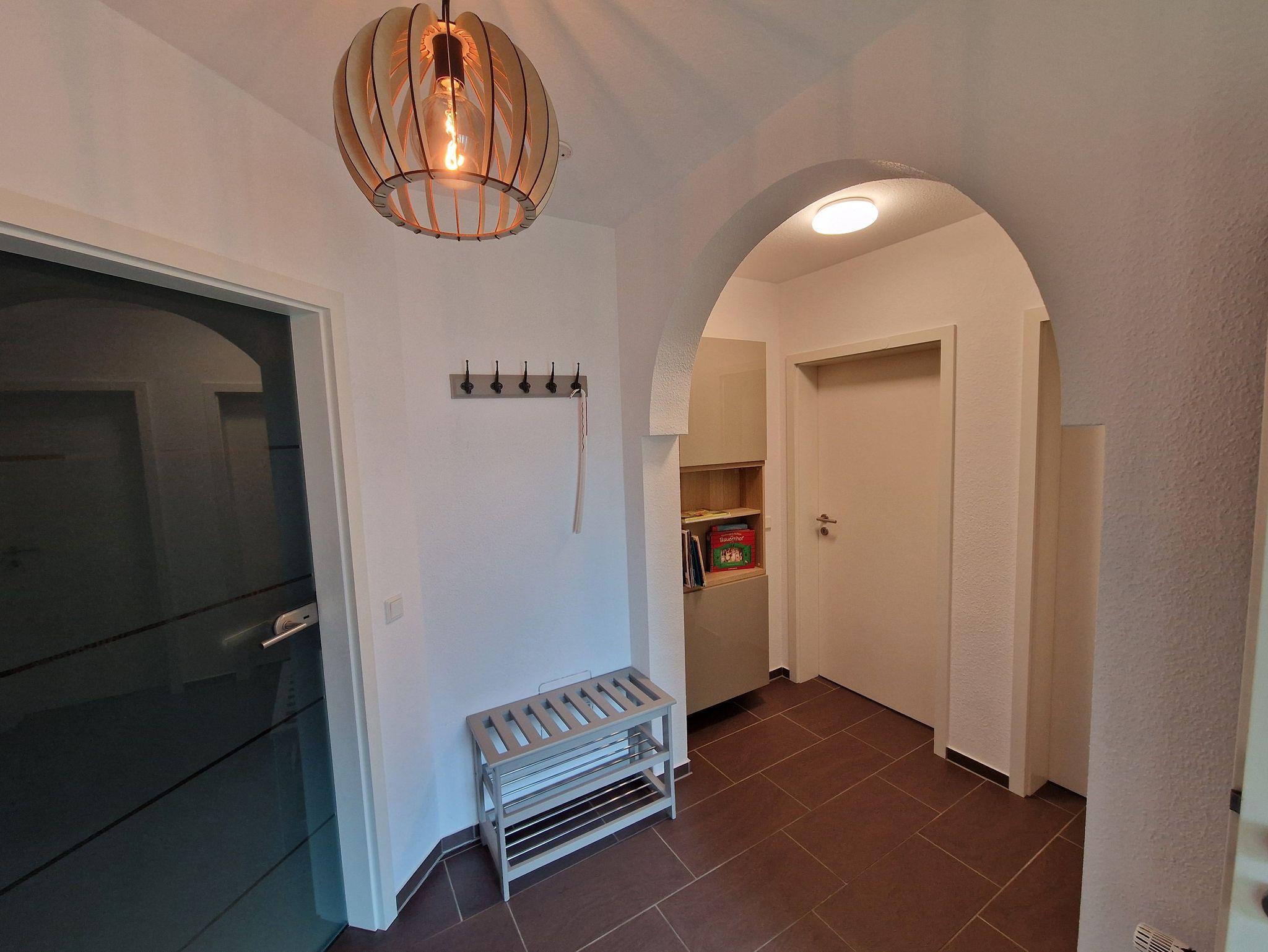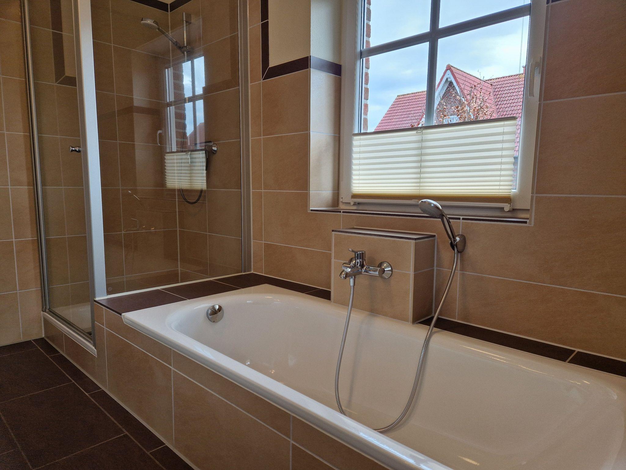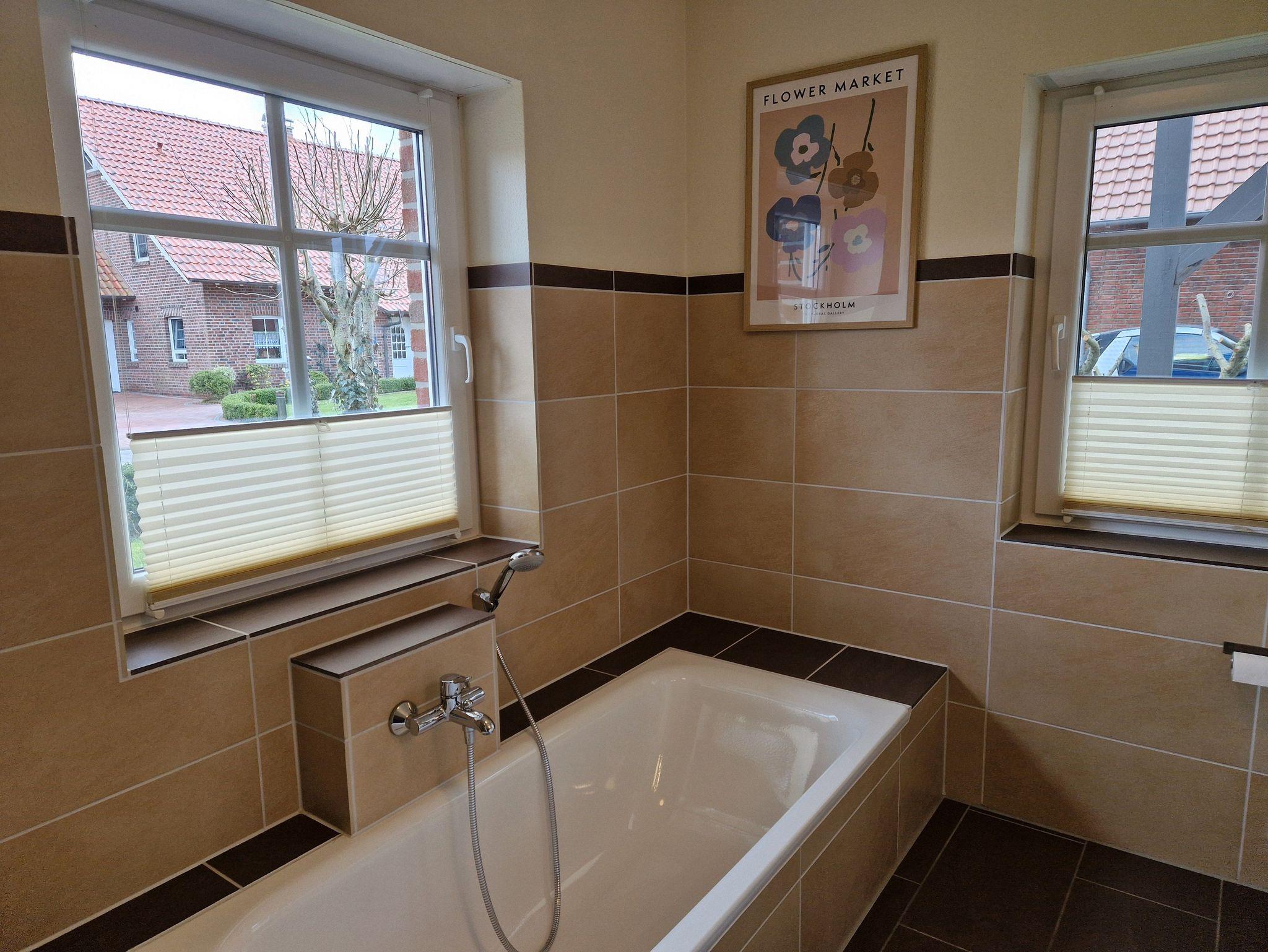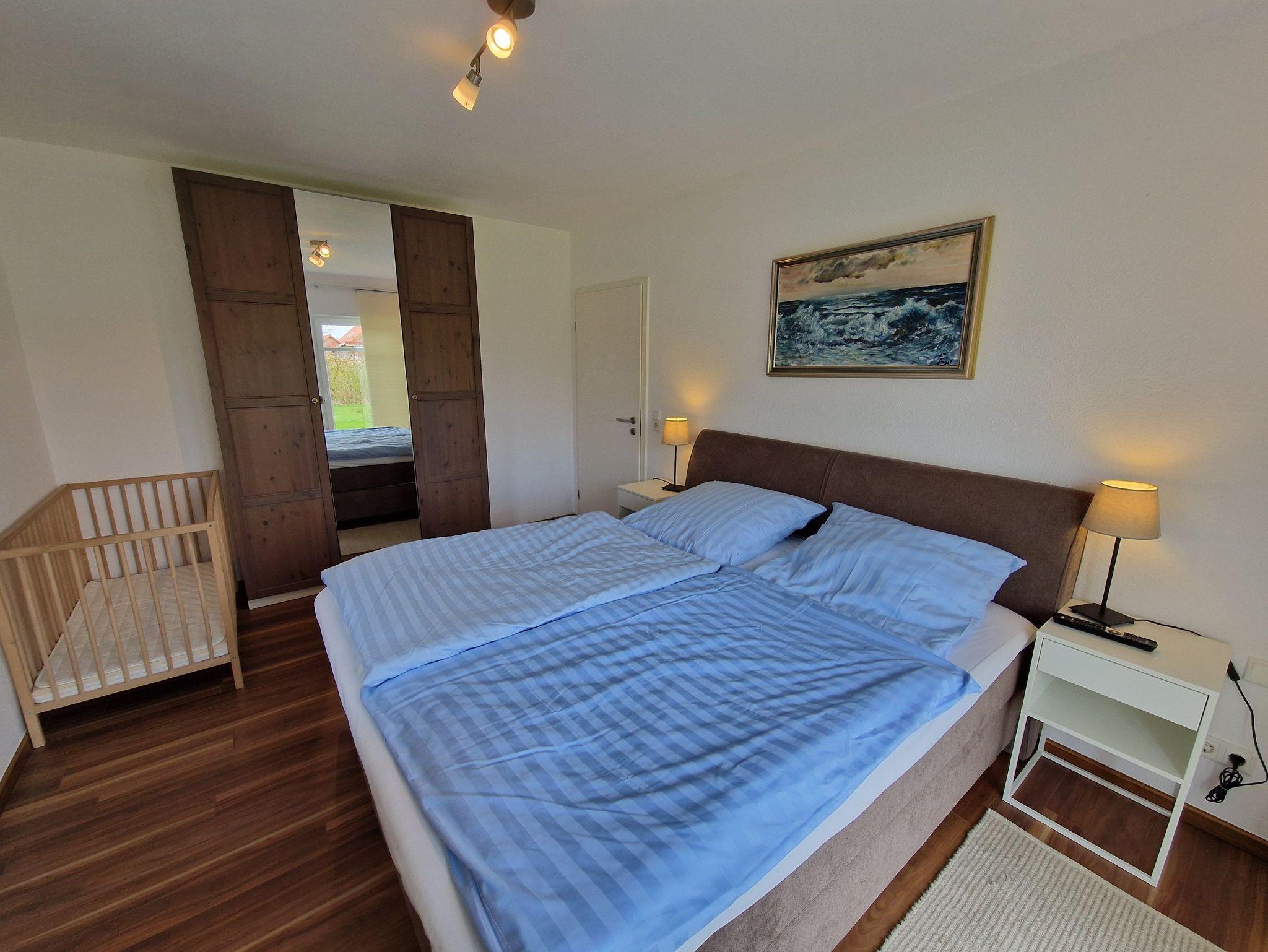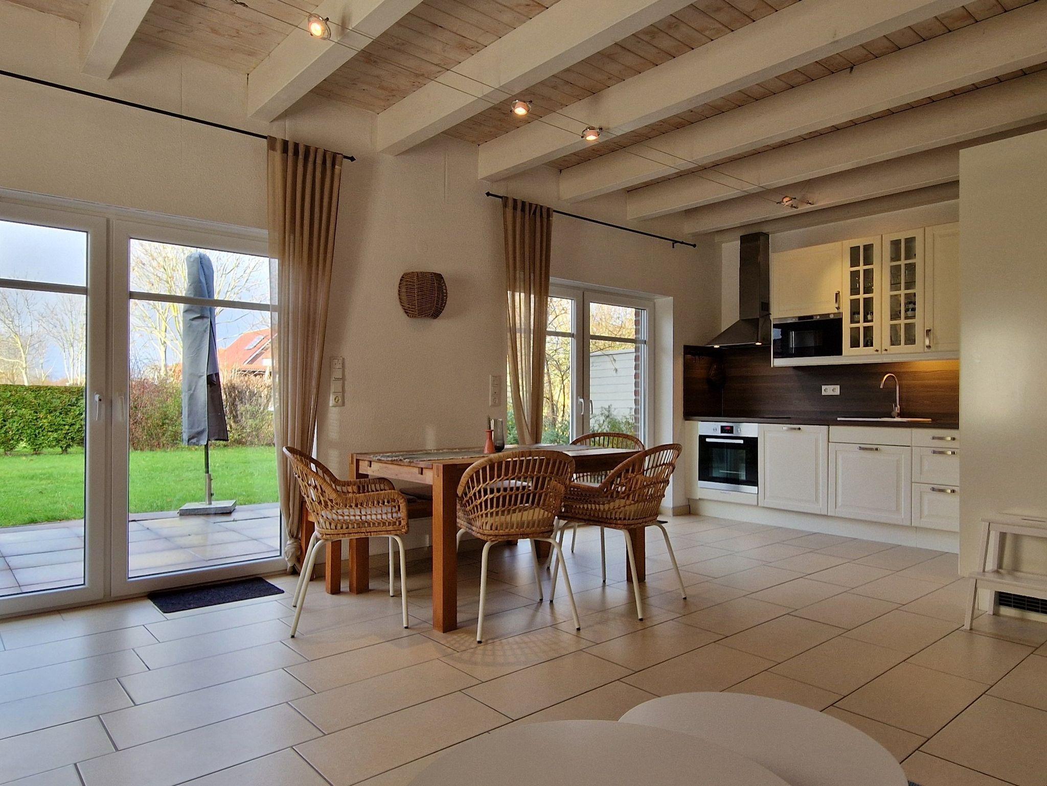 Die ca. 89m² große Ferienwohnung verfügt über einen großzügigen Wohn- und Essbereich mit moderner Küchenzeile. Von hier aus haben Sie ebenfalls Zugang zum Garten. Des weiteren finden Sie ein Schlafzimmer mit einem Doppelbett sowie ein Schlafzimmer mit zwei Einzelbetten. Ein geräumiges Badezimmer mit Badewanne, Dusche und WC rundet diese komfortable Wohnung ab. Die Böden sind mit Laminat und Fliesen, die Fenster mit Rolläden ausgestattet. WLAN steht Ihnen kostenlos zur Verfügung.