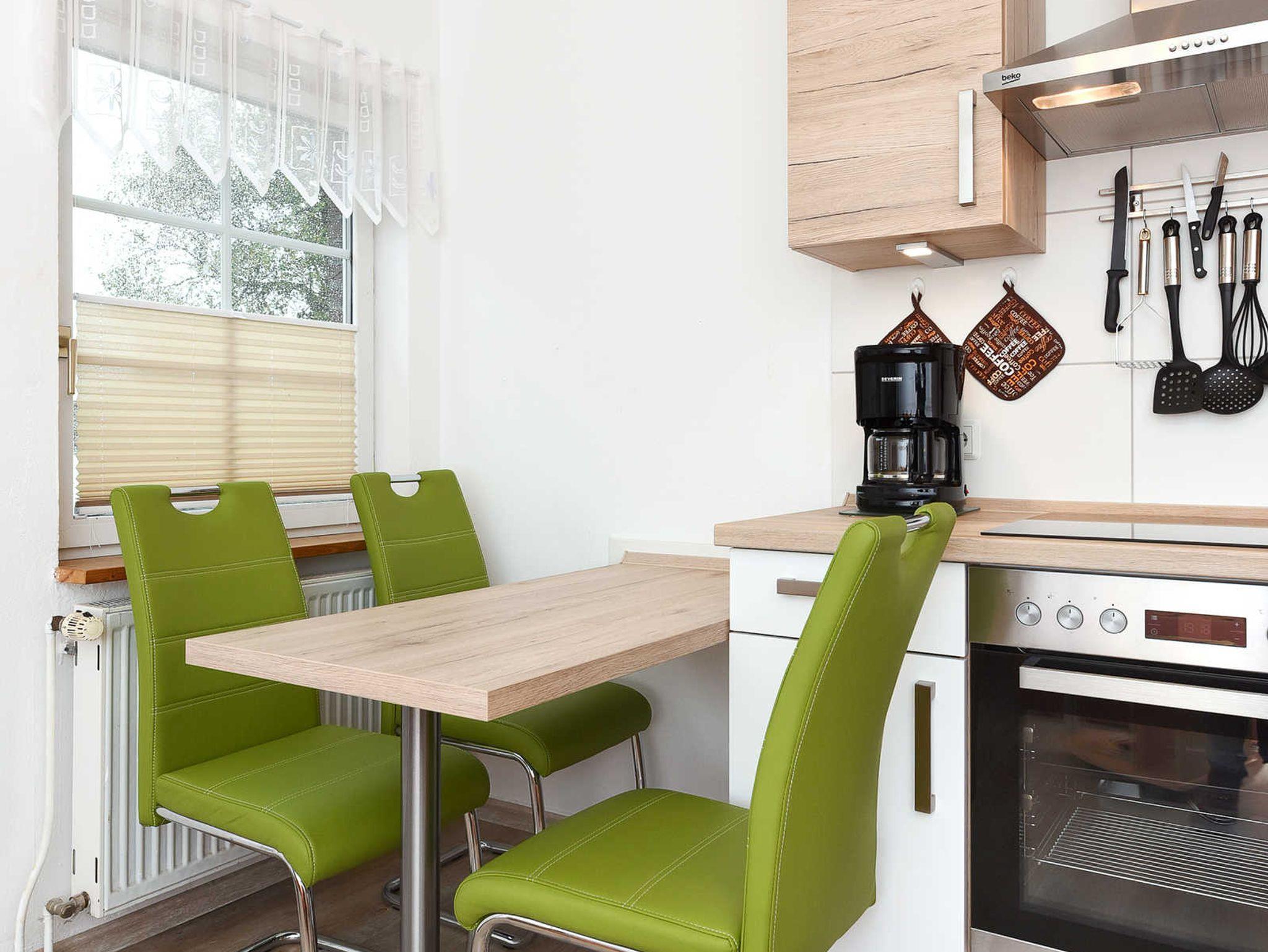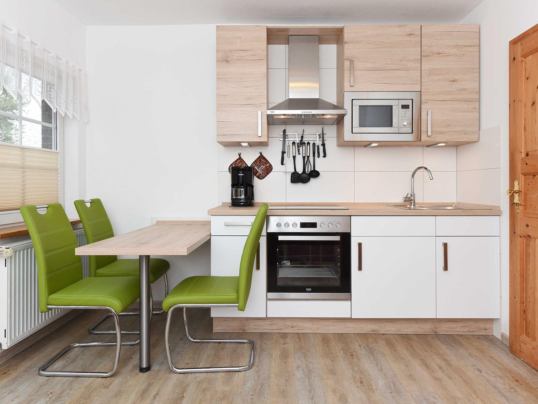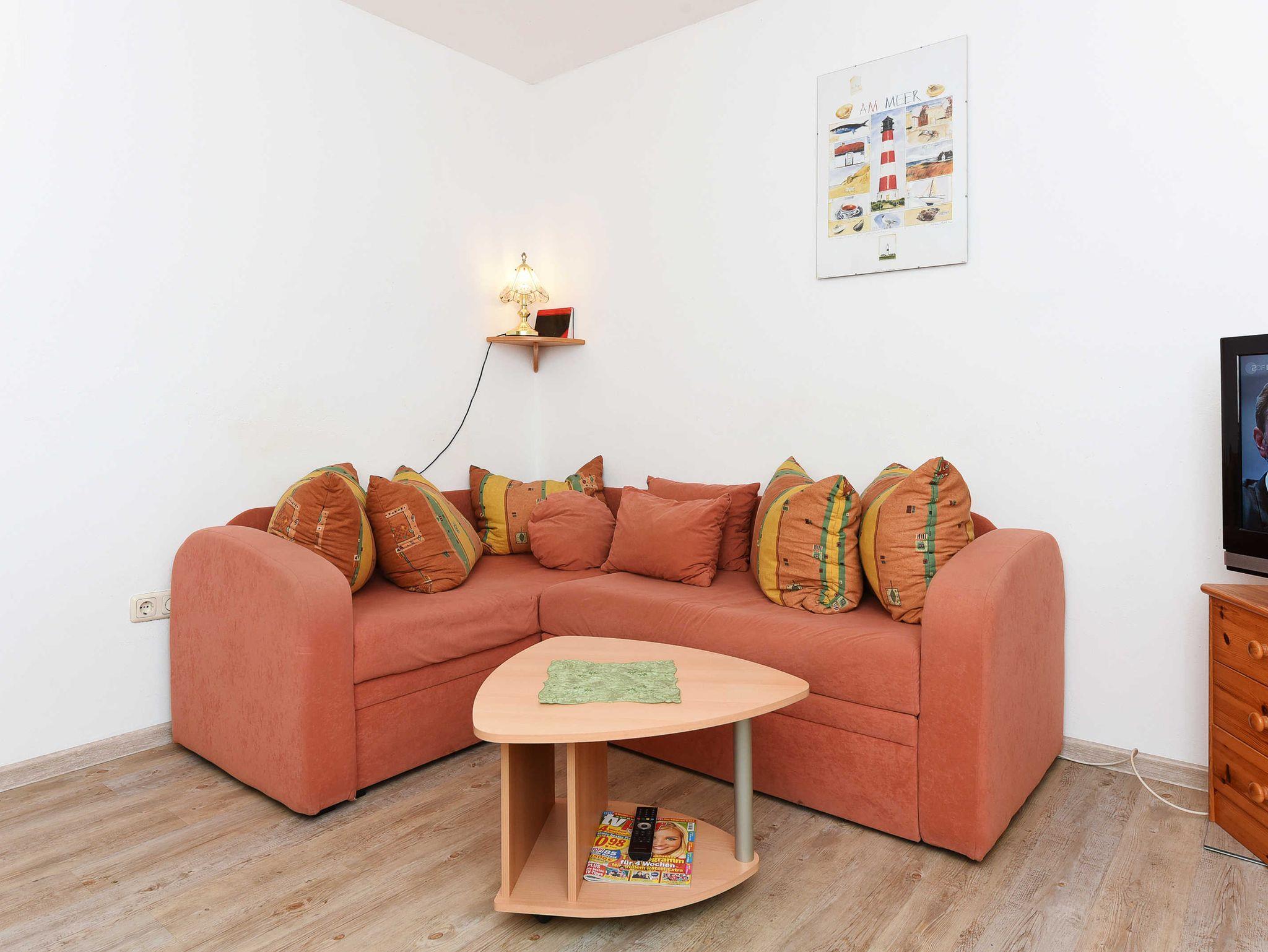 Größe ca. 35 Quadratmeter, Wohnraum mit integrierter Küche, Schlafzimmer, Badezimmer mit Dusche, Waschtisch und WC, Erdgeschoss, Terrasse, optimal für 1 bis 2 Personen und zusätzlich ein Kleinkind.