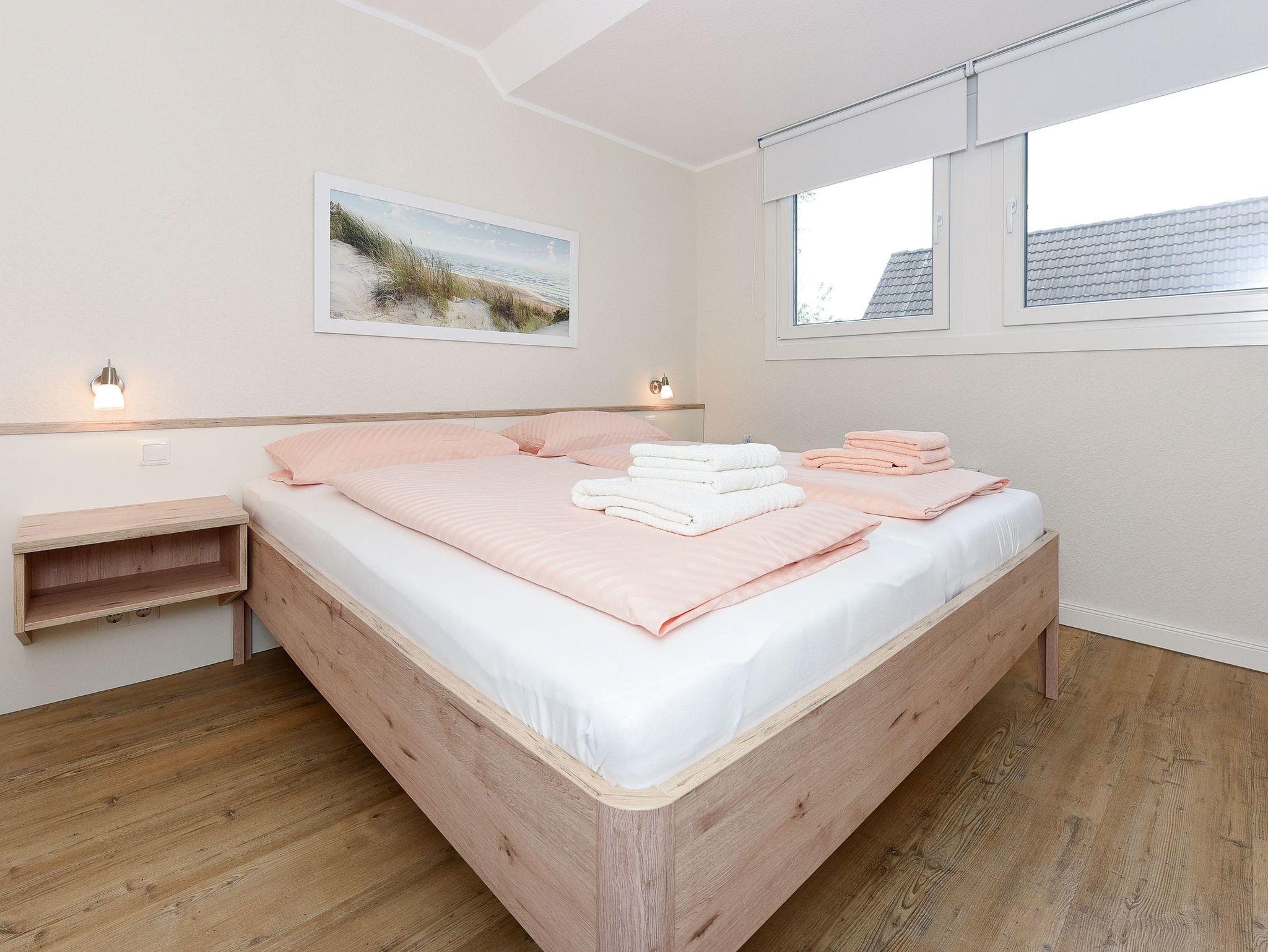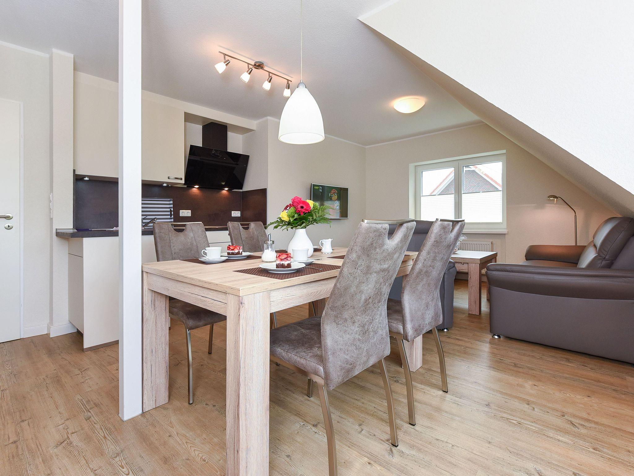 Größe ca. 60 Quadratmeter, Wohnraum mit integrierter Küche und Essgruppe, Schlafzimmer, zweites separates Schlafzimmer, Badezimmer mit Dusche, Waschtisch und WC, Obergeschoss, Balkon, optimal für 2 bis 4 Personen.