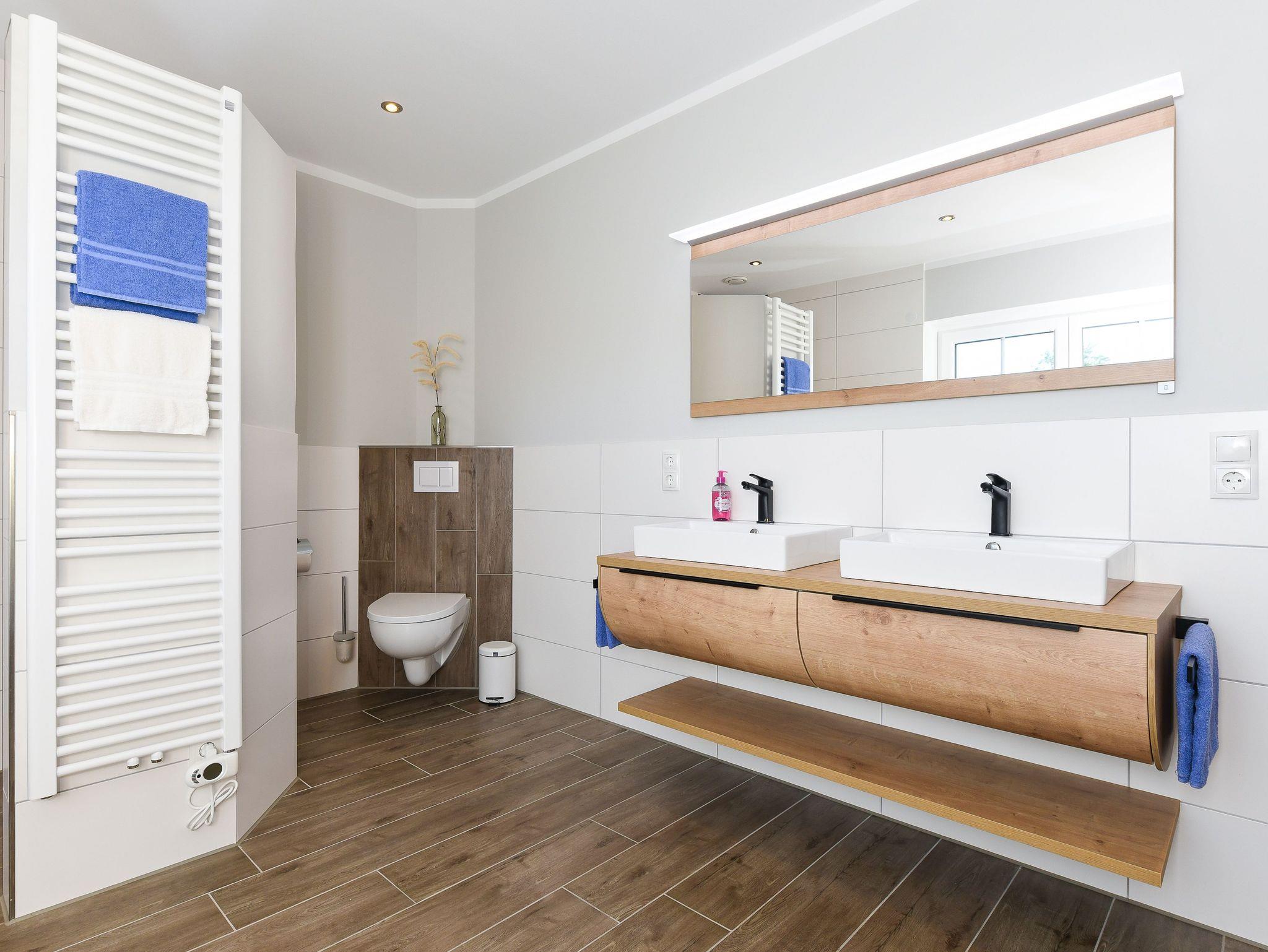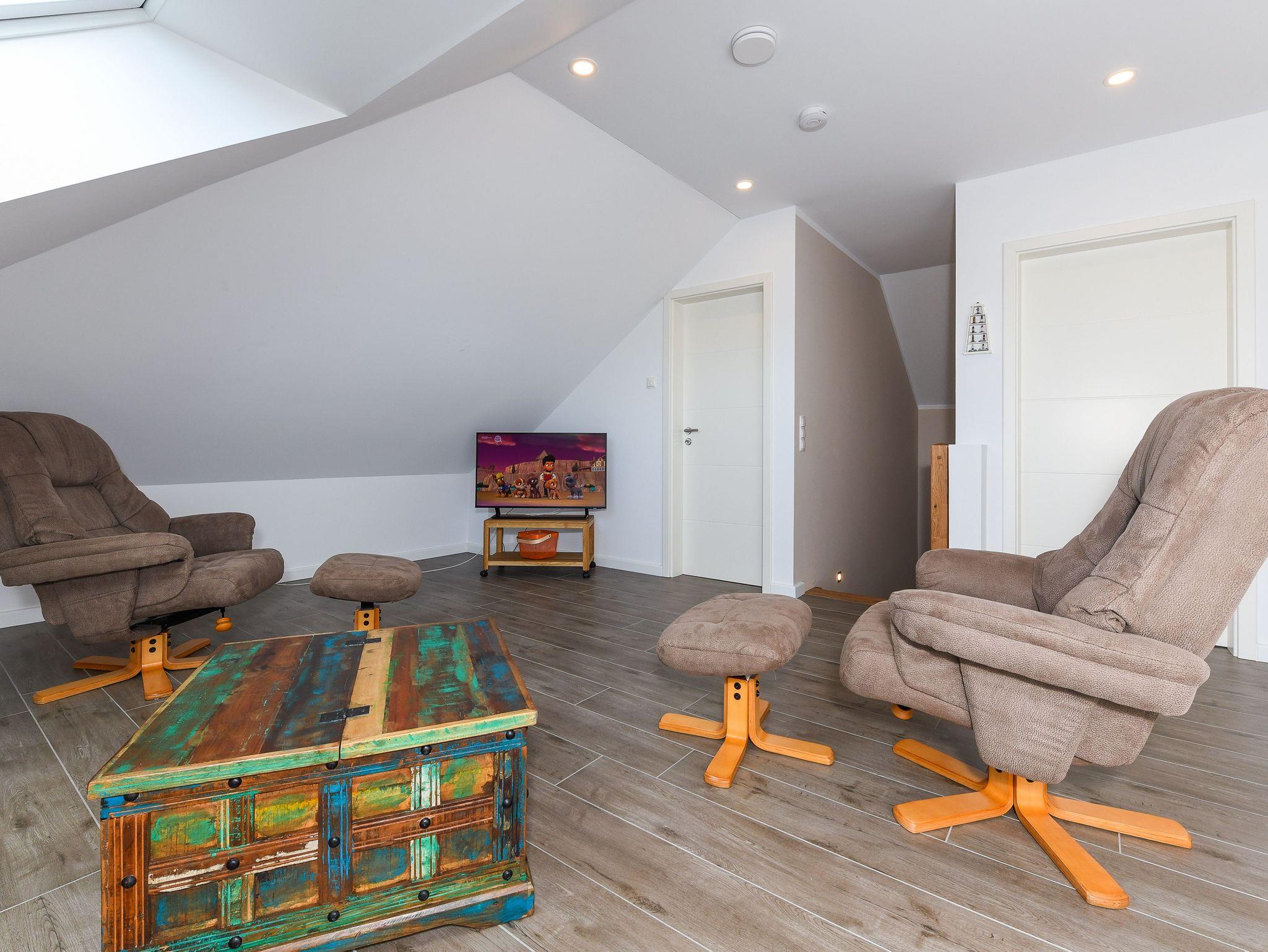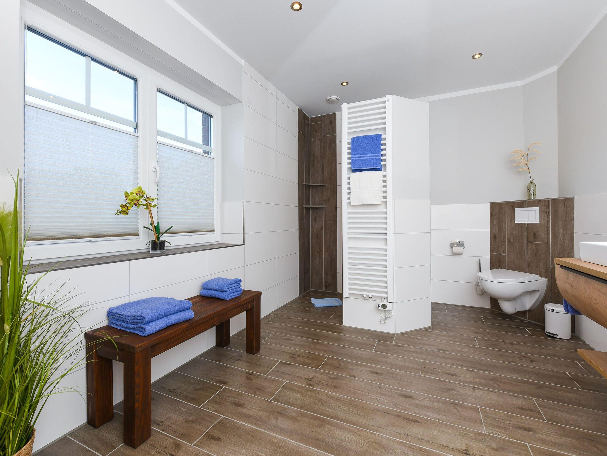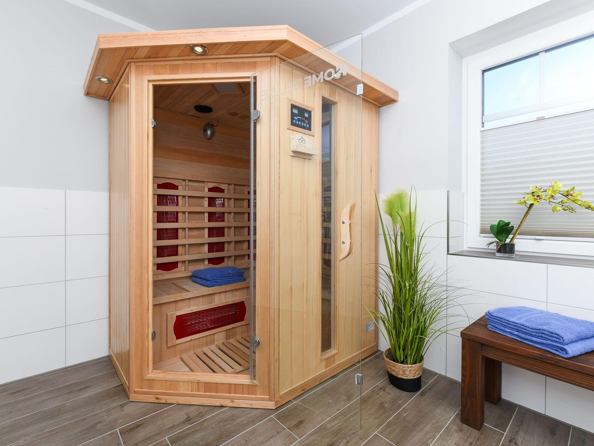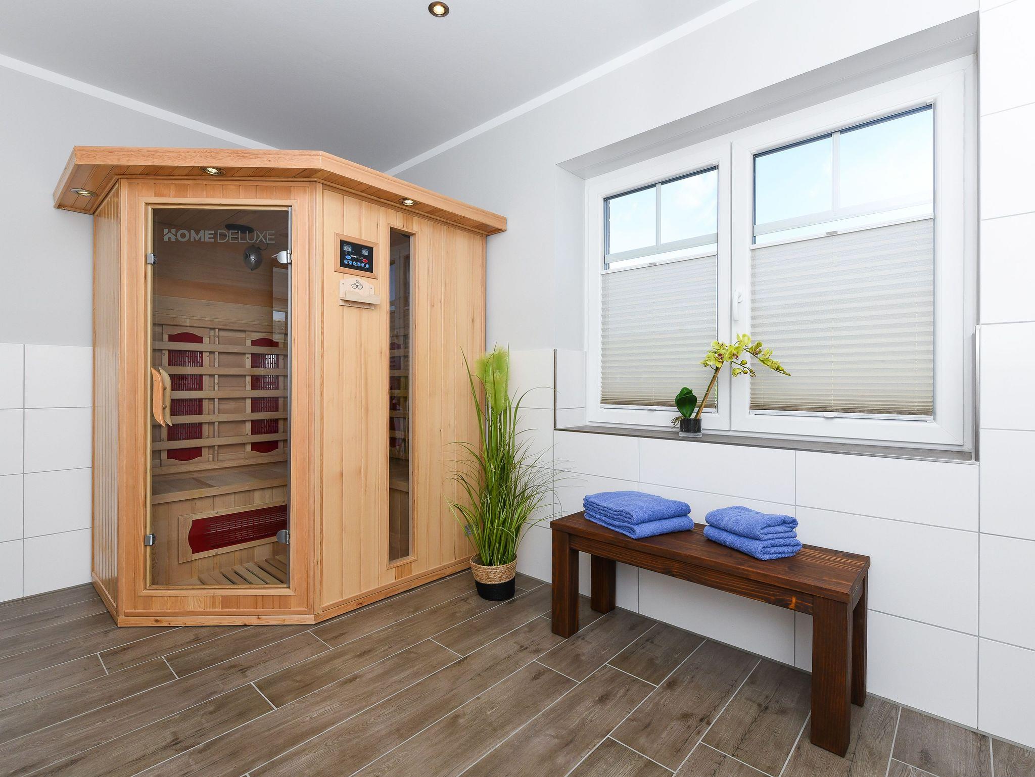 Ein ganz besonderes Highlight ist das Badezimmer im Erdgeschoss. Hier gibt es eine Infrarot-Sauna, die bequem 2 Personen Raum zur Entspannung bietet.