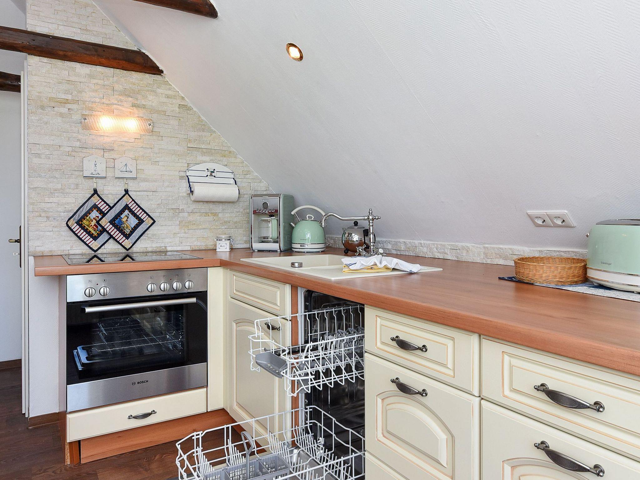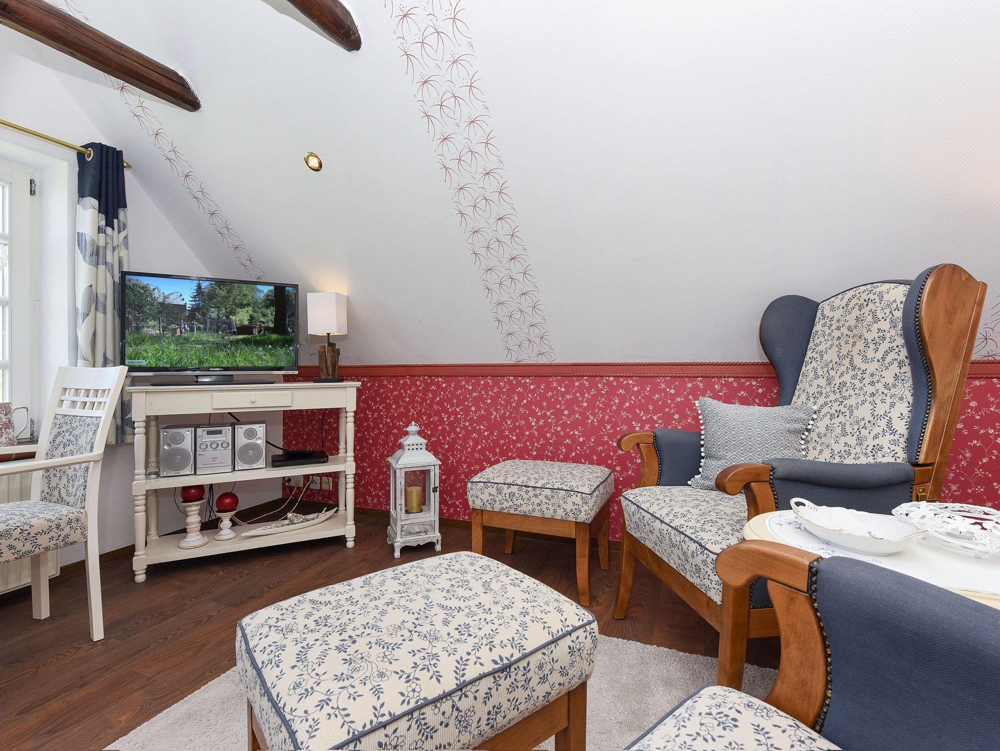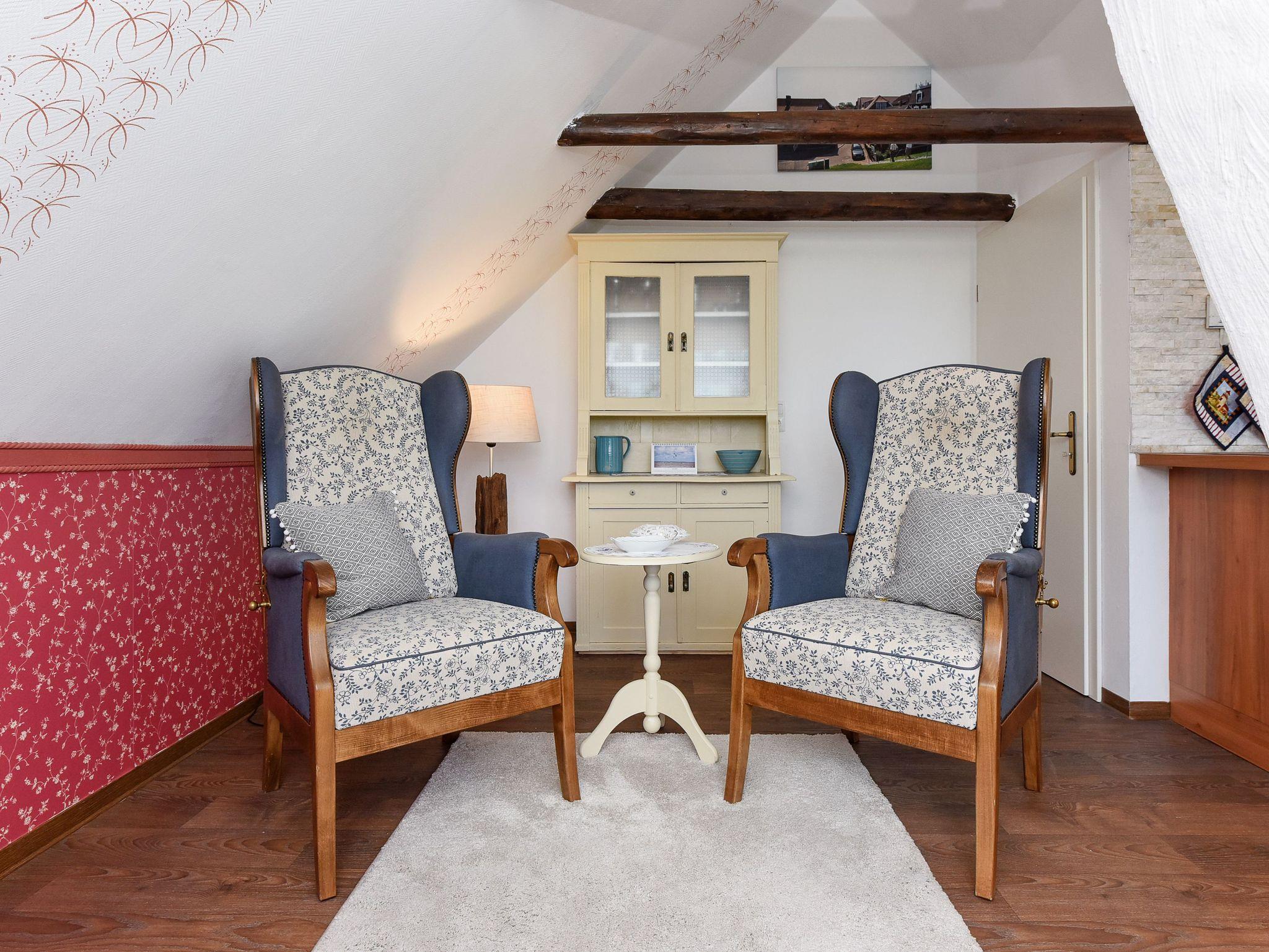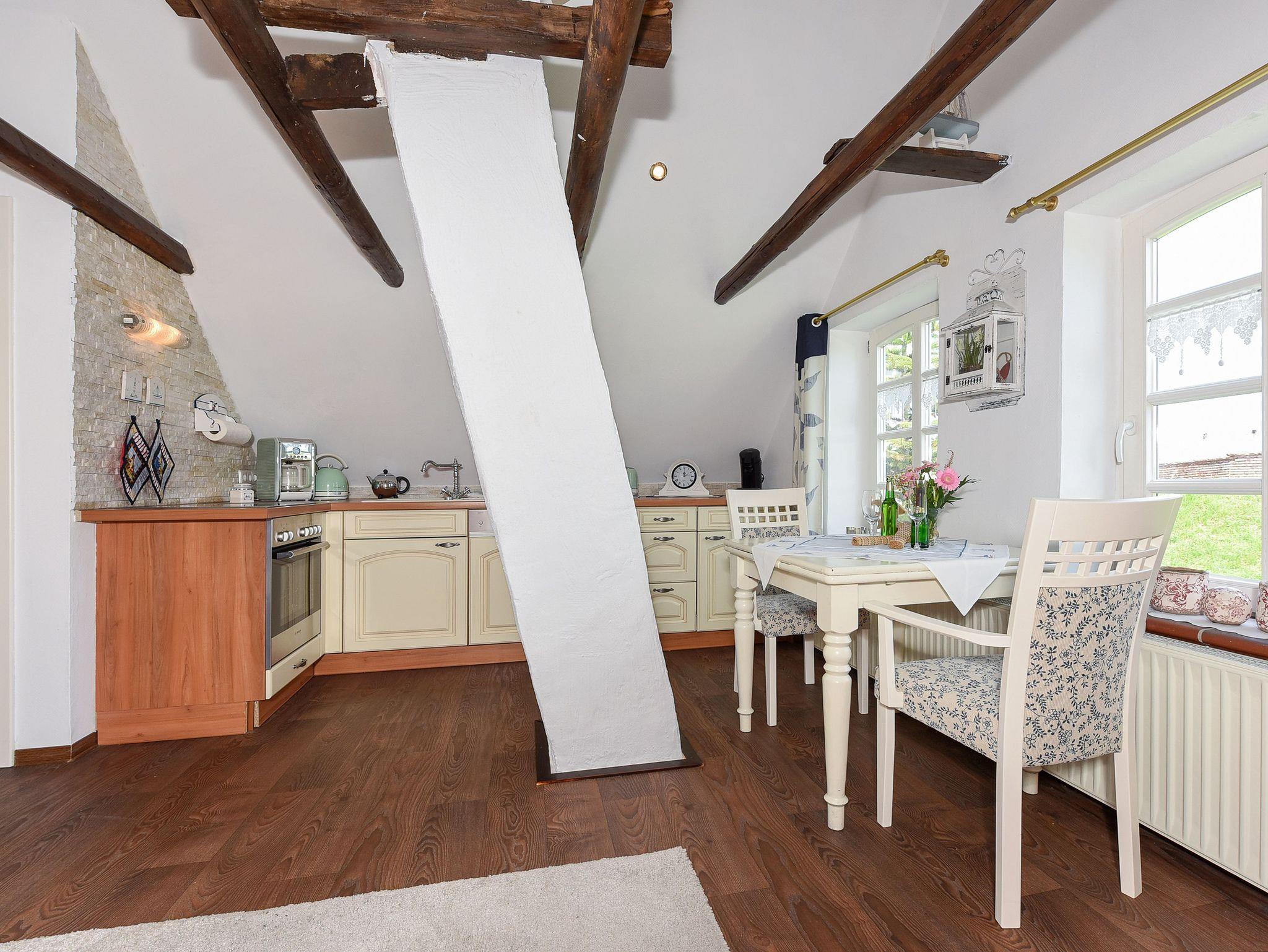 Größe ca. 45 Quadratmeter, Wohn-Küche, Schlafzimmer, Badezimmer mit Dusche, Waschtisch und WC, Obergeschoss, optimal für 2 Personen. WLAN kostenlos verfügbar
