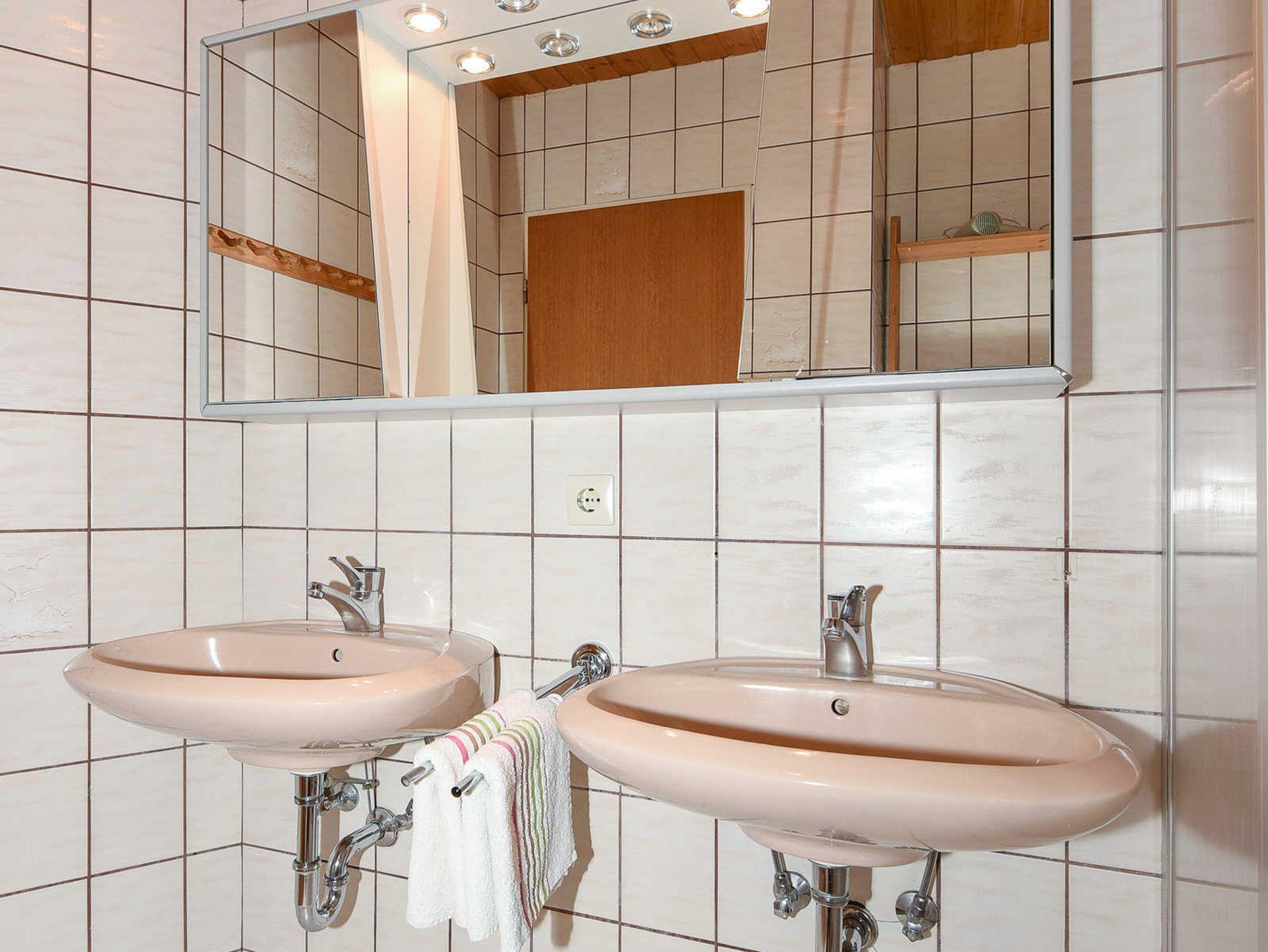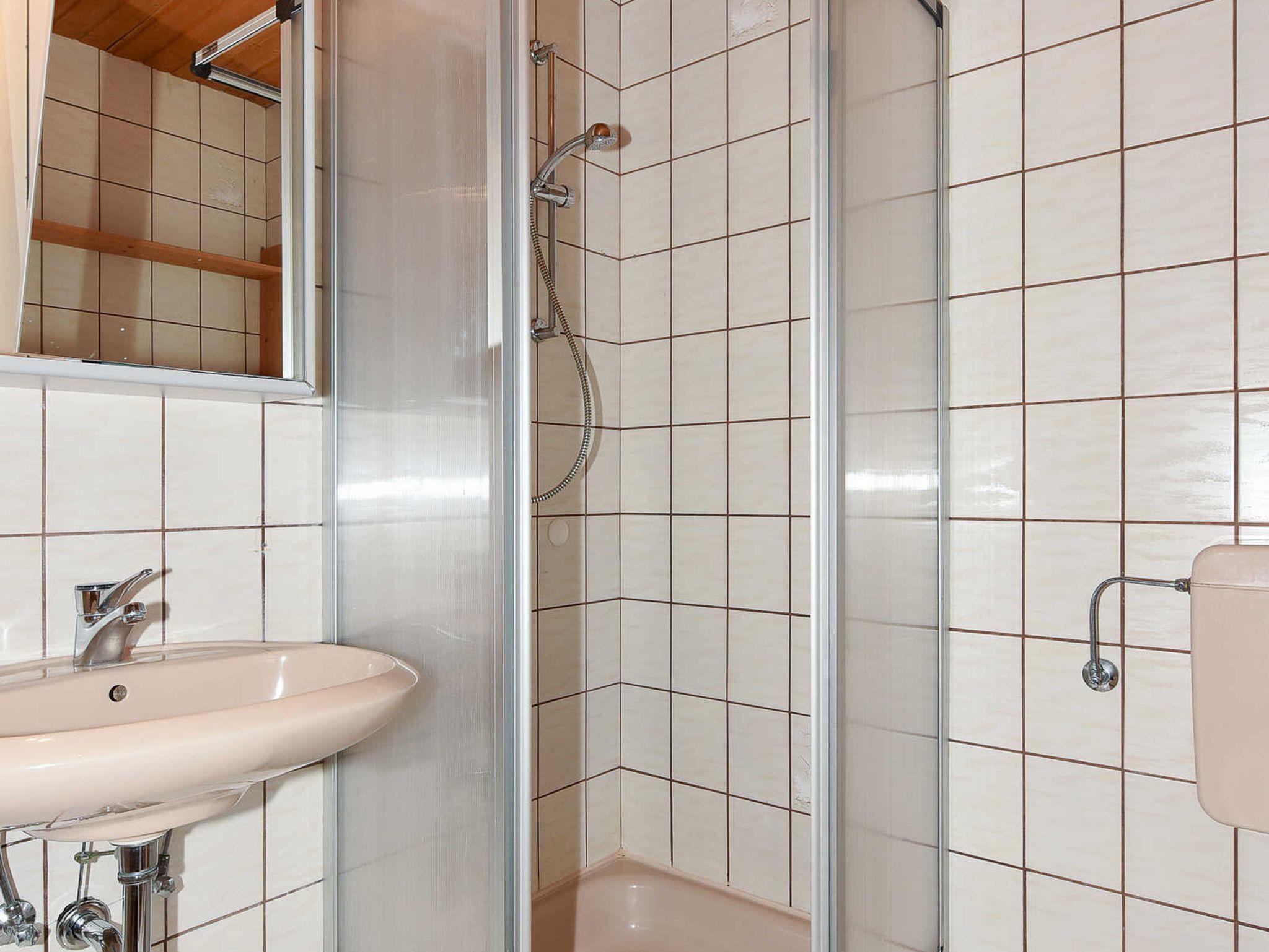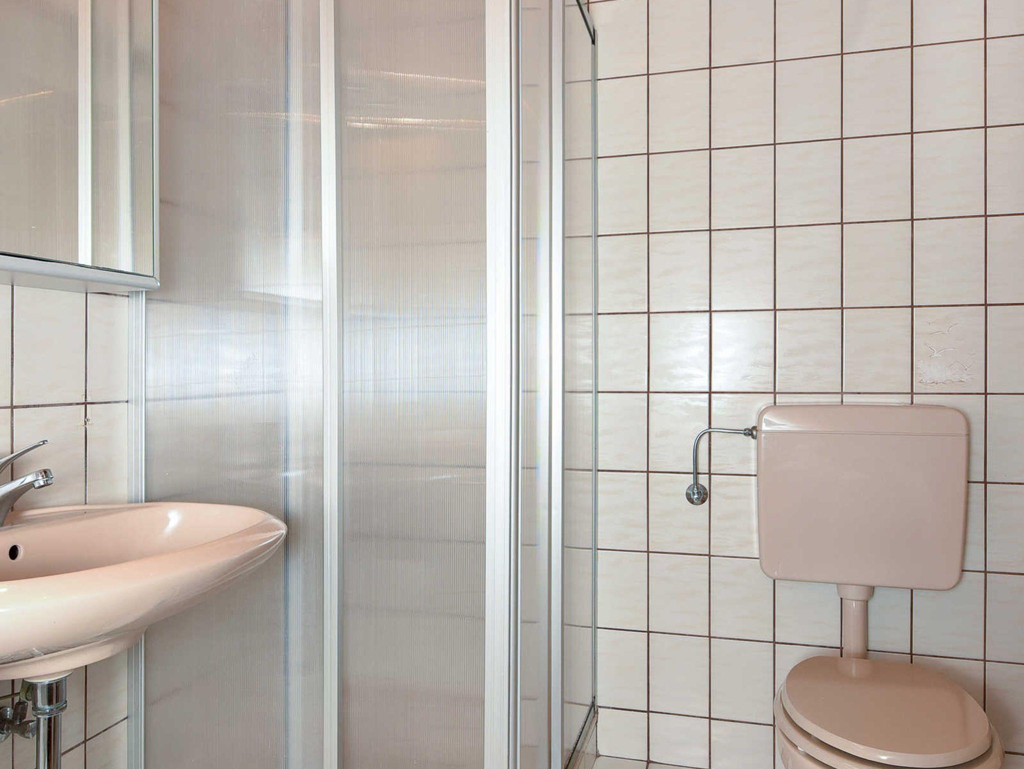 Badezimmer mit Dusche, Waschtisch und WC