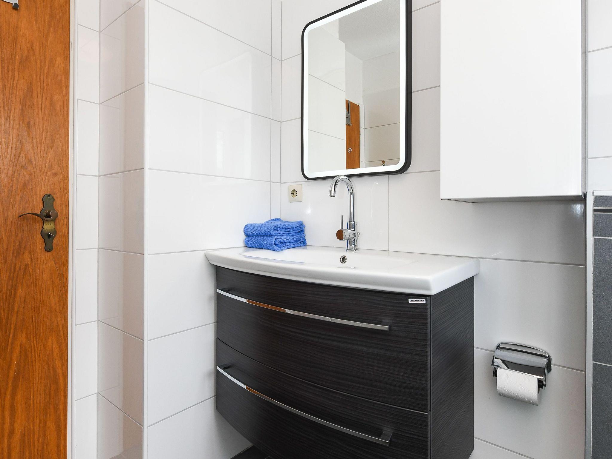 Badezimmer mit Dusche, Waschtisch und WC