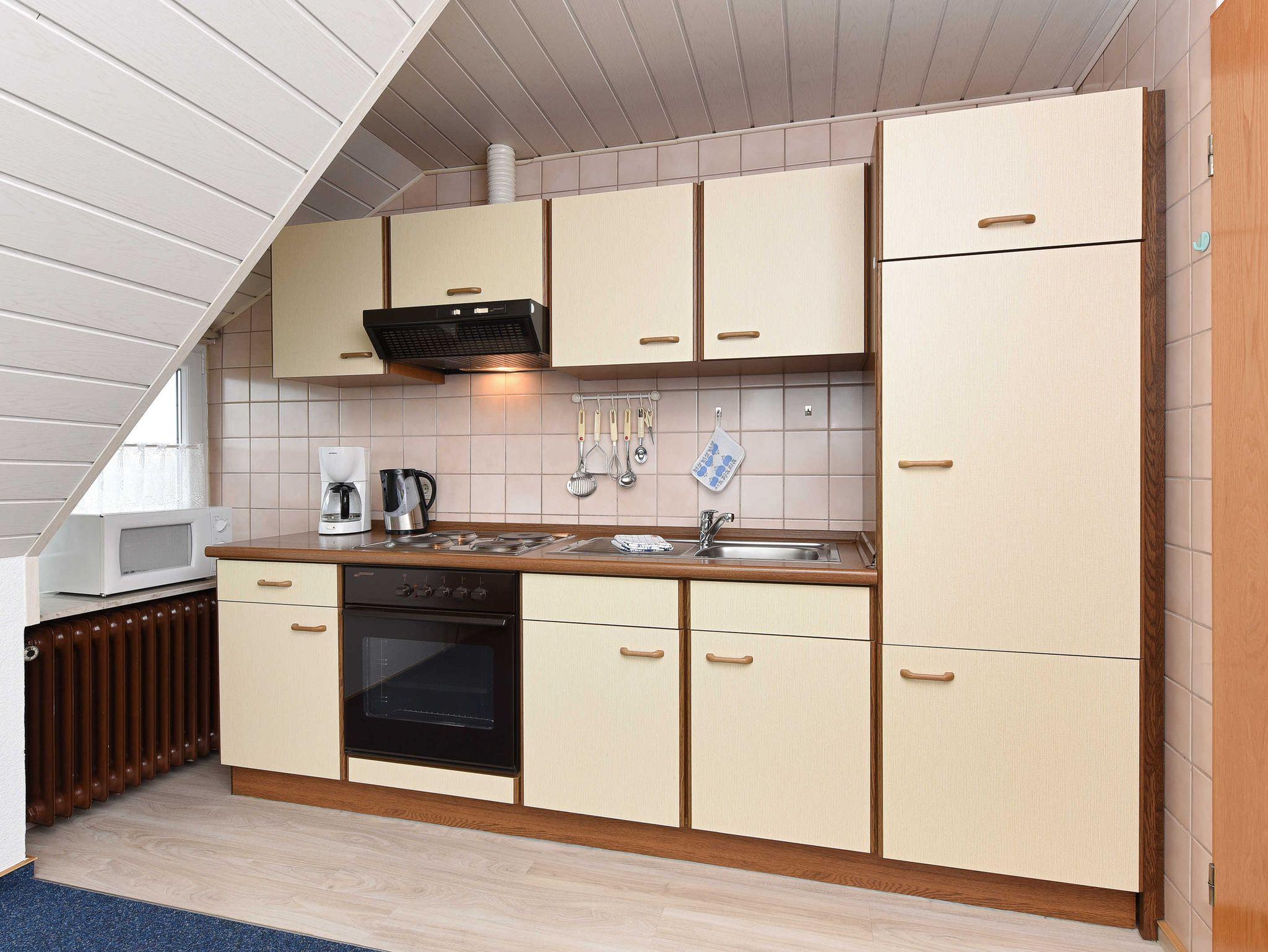 Größe ca. 30 Quadratmeter, Wohnraum mit integrierter Küche, Schlafzimmer, Badezimmer mit Dusche, Waschtisch und WC, Obergeschoss, optimal für 2 Personen.
