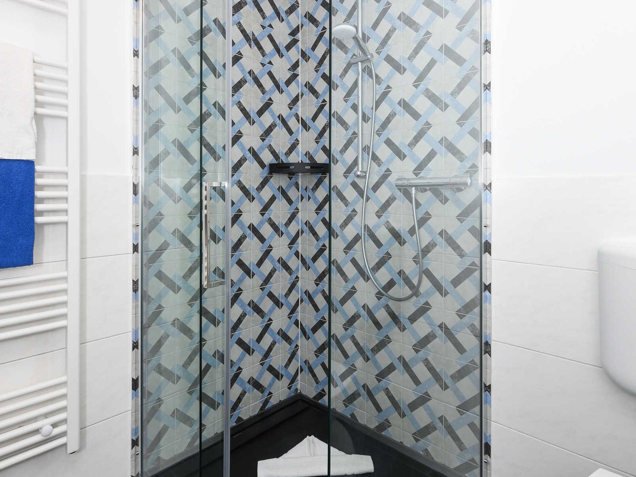 Badezimmer mit Dusche, Waschtisch und WC