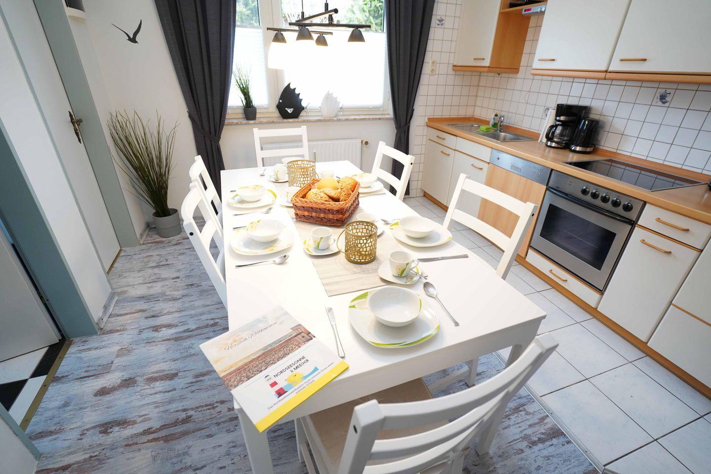 Die Ferienwohnung Baltrum überzeugt nicht nur durch ihre perfekte Lage, sondern auch durch ihre liebevolle, maritime Einrichtung. Direkt im Erdgeschoss gelegen, bietet die Wohnung alles, was Sie für einen komfortablen Aufenthalt benötigen. Zwei gemütliche Schlafzimmer mit jeweils einem Doppelbett versprechen erholsamen Schlaf. Die großzügige, voll ausgestattete Küche lässt keine Wünsche offen – hier können Sie gemeinsam kochen und bei einem gemütlichen Abendessen am großen Esstisch die Seele baumeln lassen.