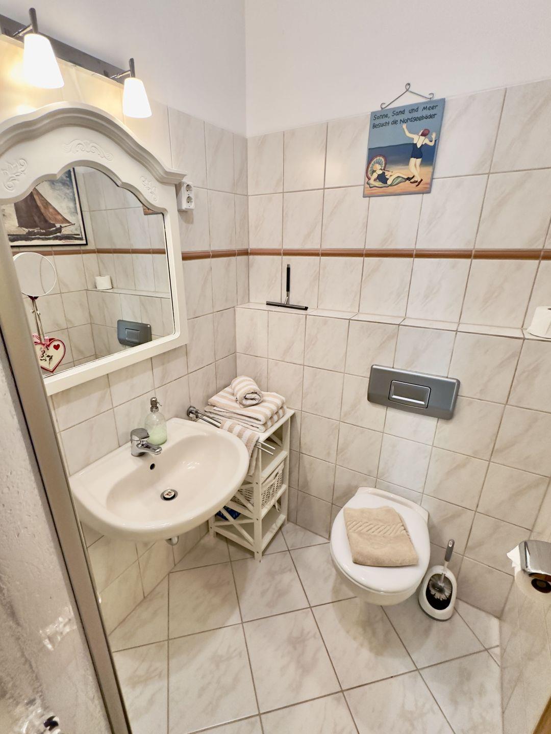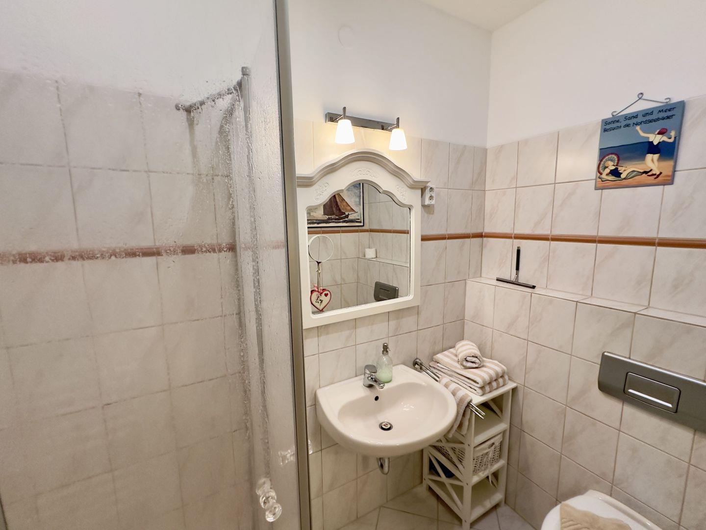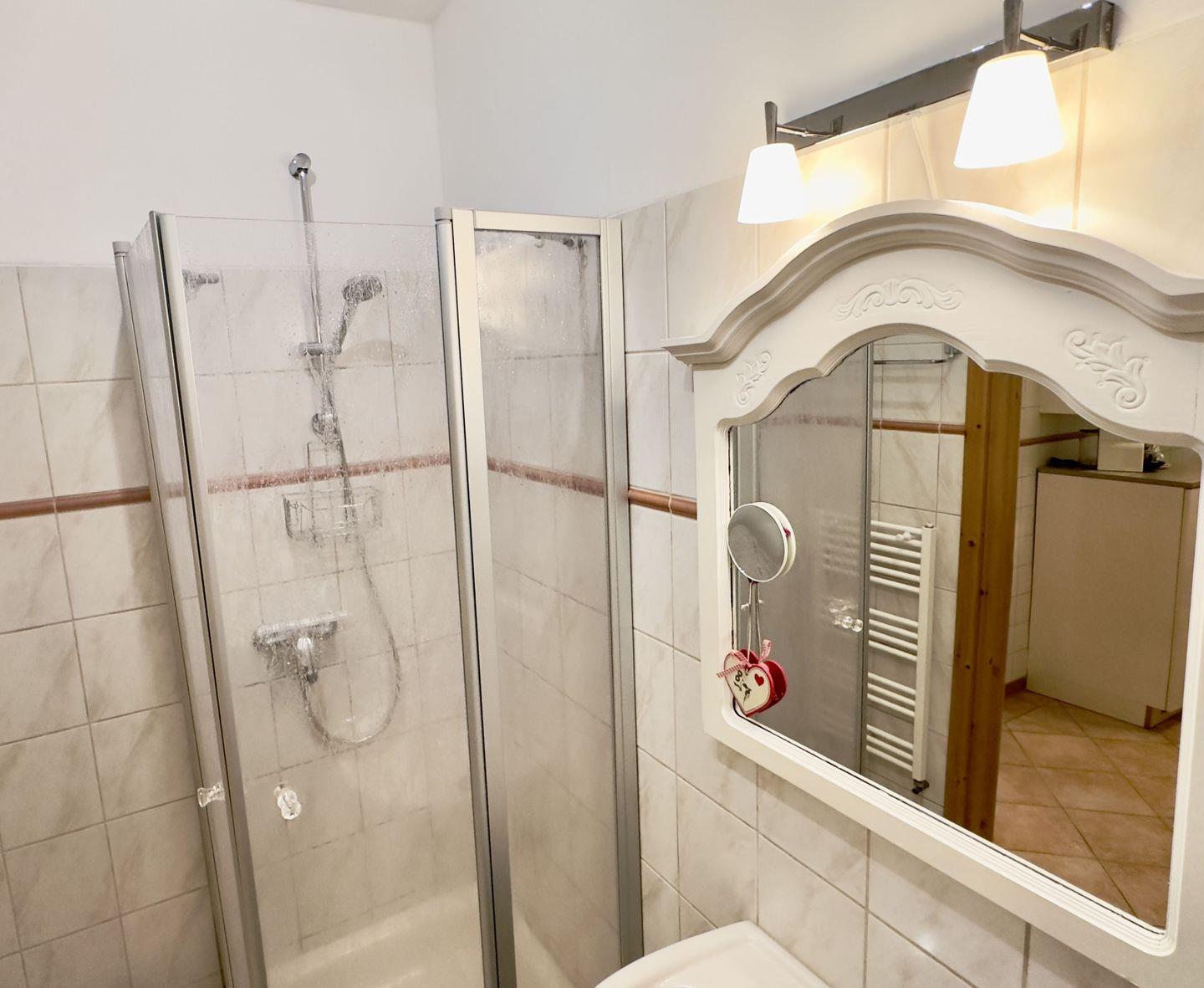Das helle Badezimmer ist ein Ort der Erfrischung und Pflege. Es ist mit einer Dusche, einem großen Spiegel und einem Kosmetikspiegel ausgestattet, sodass Sie sich rundum wohlfühlen können.