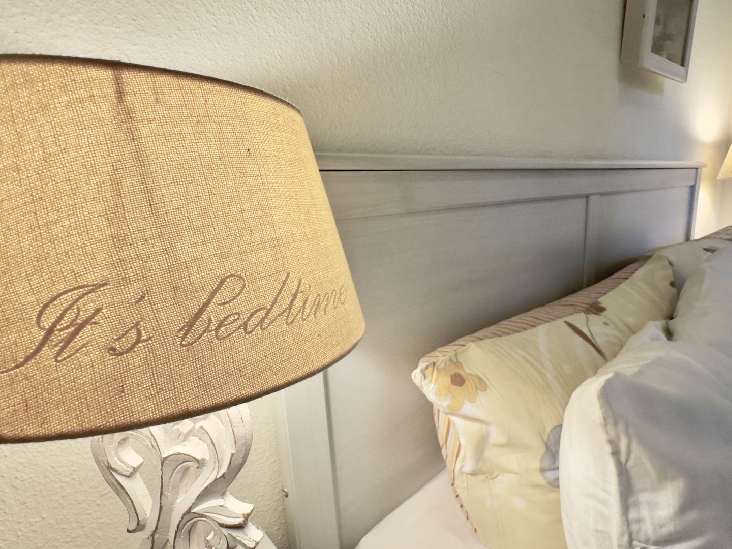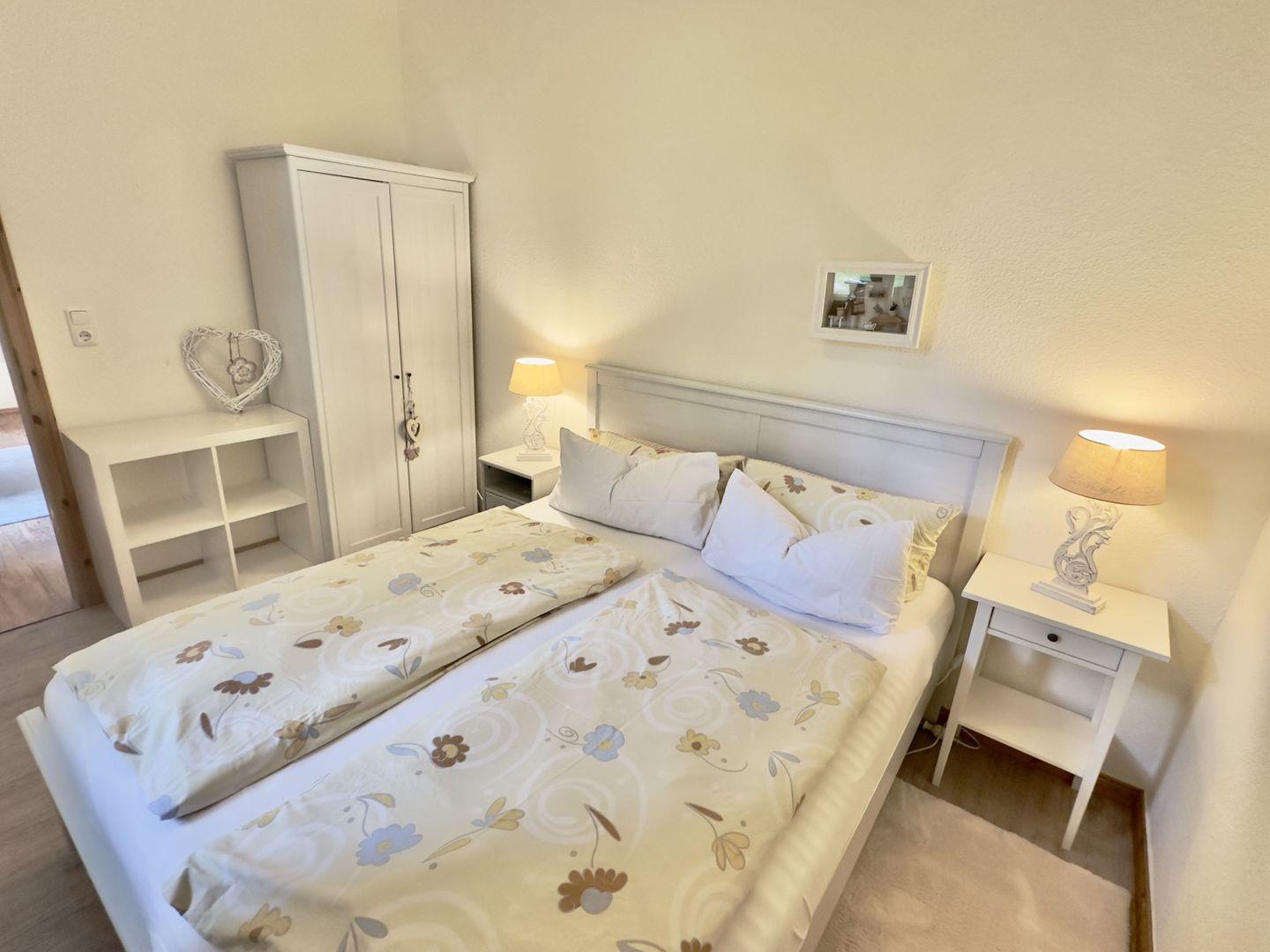Das freundliche Schlafzimmer, ausgestattet mit einem bequemen Doppelbett, lädt zu erholsamen Nächten ein. Stilvolle Nachttischlampen tauchen den Raum in ein warmes Licht und schaffen eine besonders behagliche Atmosphäre. Ein geräumiger Kleiderschrank bietet genügend Platz für Ihre Garderobe, sodass Sie sich auch bei einem längeren Aufenthalt wie zu Hause fühlen.