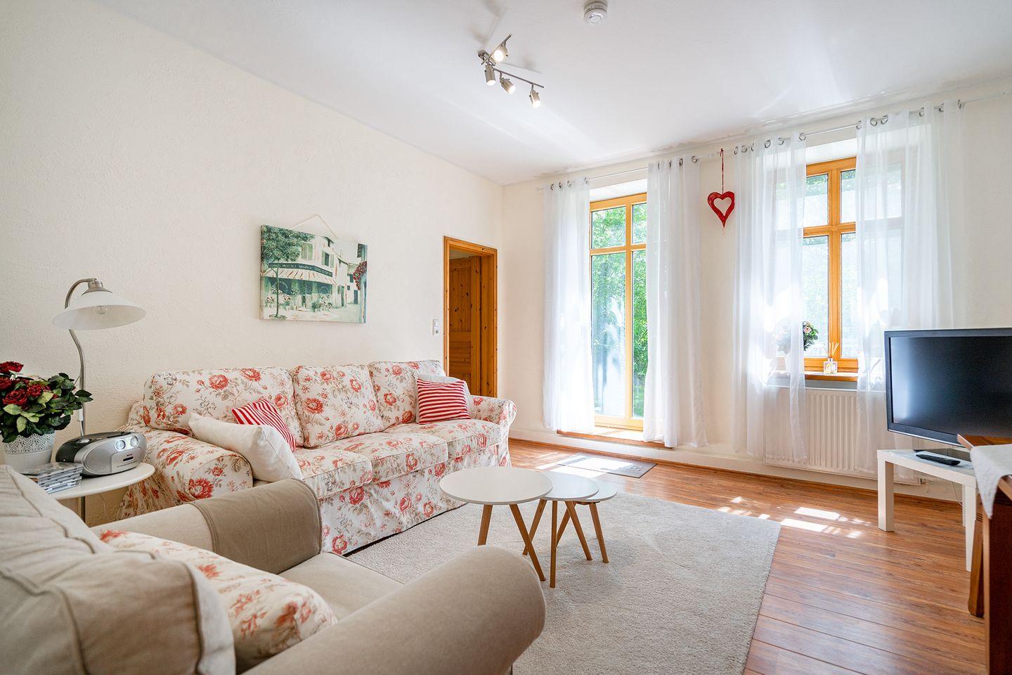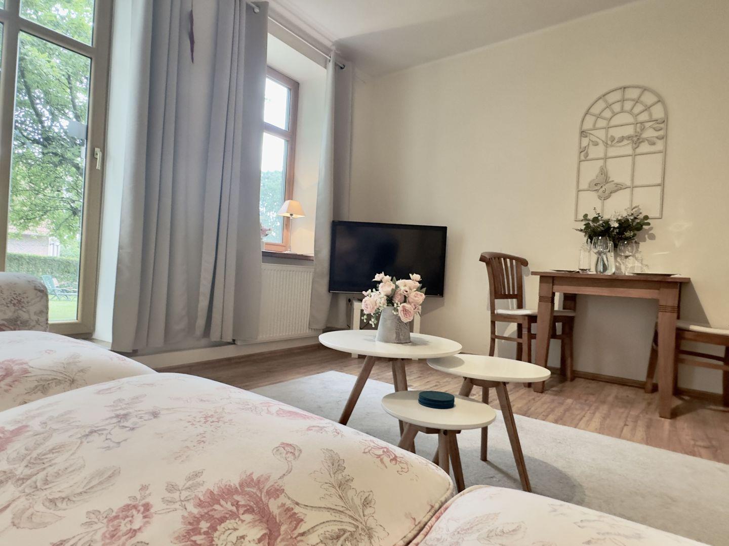 Im Wohnzimmer erwartet Sie ein wunderschöner Blick in den grünen Garten, der die Seele zur Ruhe kommen lässt. Die hellen und warmen Farben des geschmackvollen Mobiliars tragen dazu bei, dass Sie sich sofort wie zu Hause fühlen. Die Essgruppe im Wohnzimmer lädt zu gemeinsamen Mahlzeiten ein, bei denen man den Tag Revue passieren lassen oder Pläne für kommende Abenteuer schmieden kann. Das gemütliche Schlafsofa bietet eine zusätzliche Schlafmöglichkeit, die sich perfekt für eine dritte Person oder einfach zum Entspannen eignet.