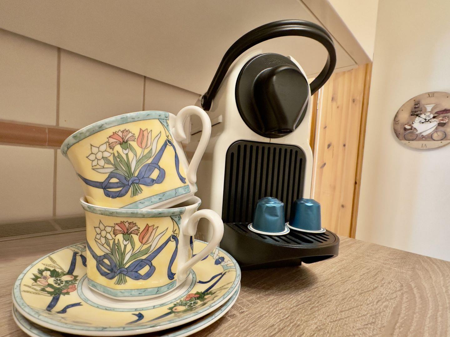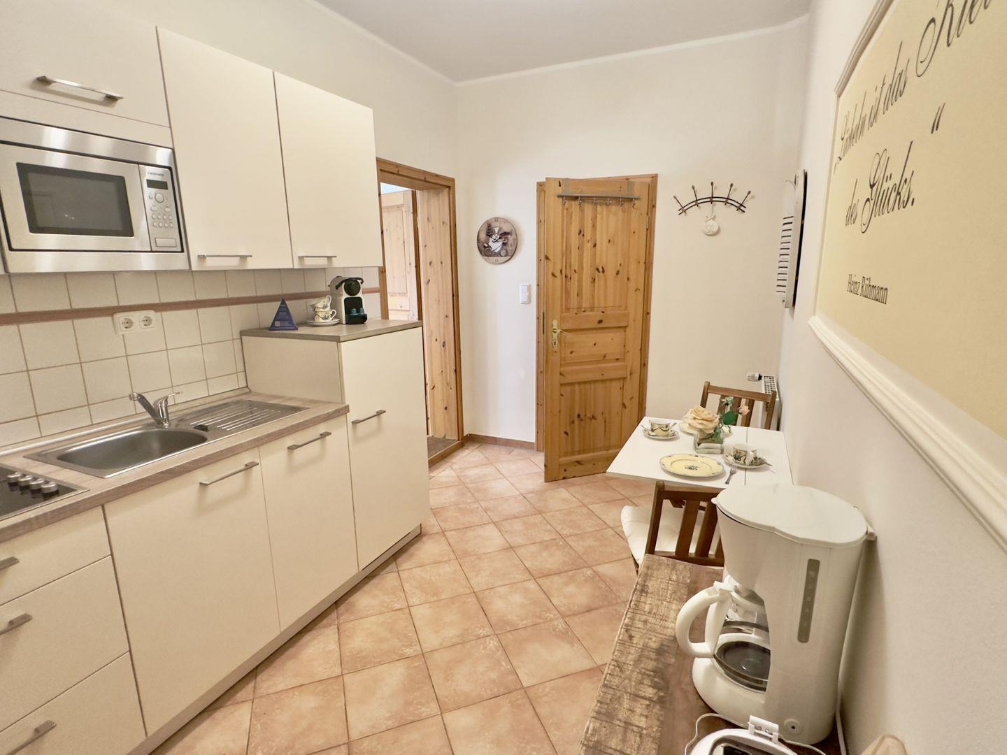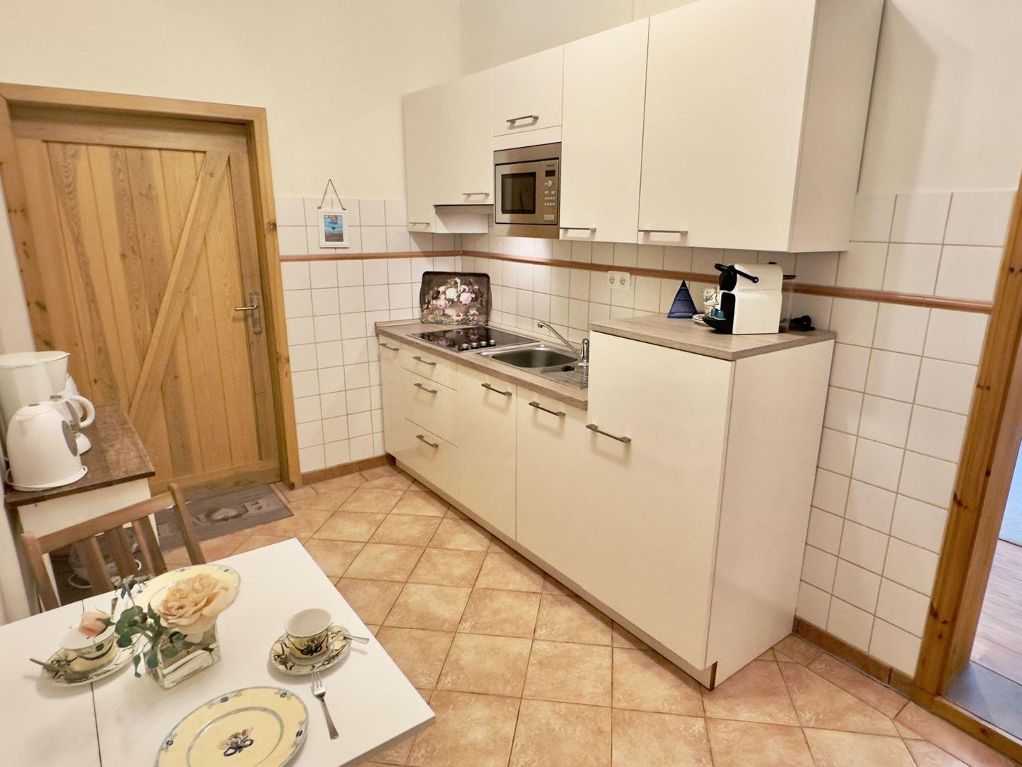 Die separate Küche ist mit allem ausgestattet, was Sie für die Selbstversorgung benötigen. Hier finden Sie eine Nespresso-Maschine, die Ihnen am Morgen den Start in den Tag versüßt. Eine kleine Essgruppe in der Küche bietet eine weitere gemütliche Sitzgelegenheit, ideal für ein Frühstück in ruhiger Atmosphäre.