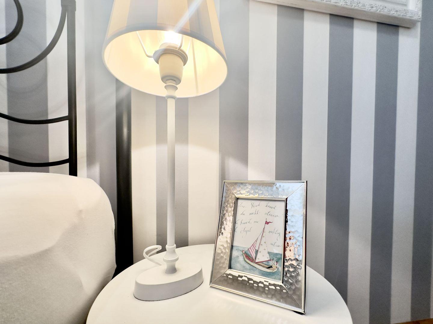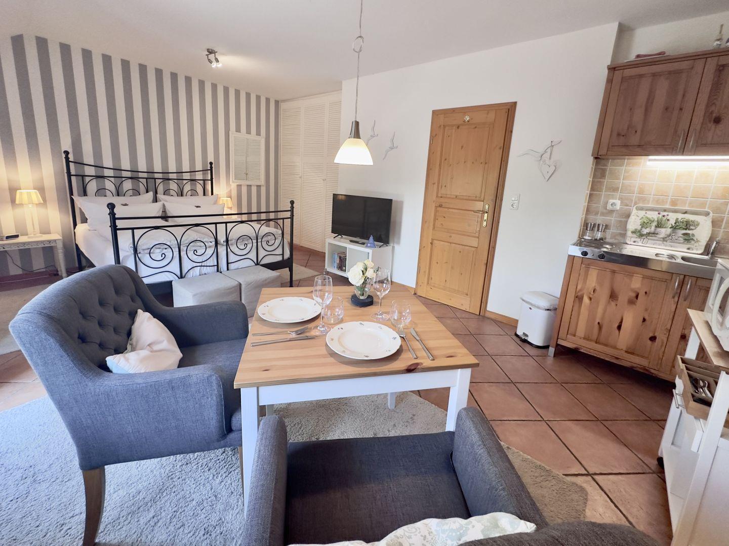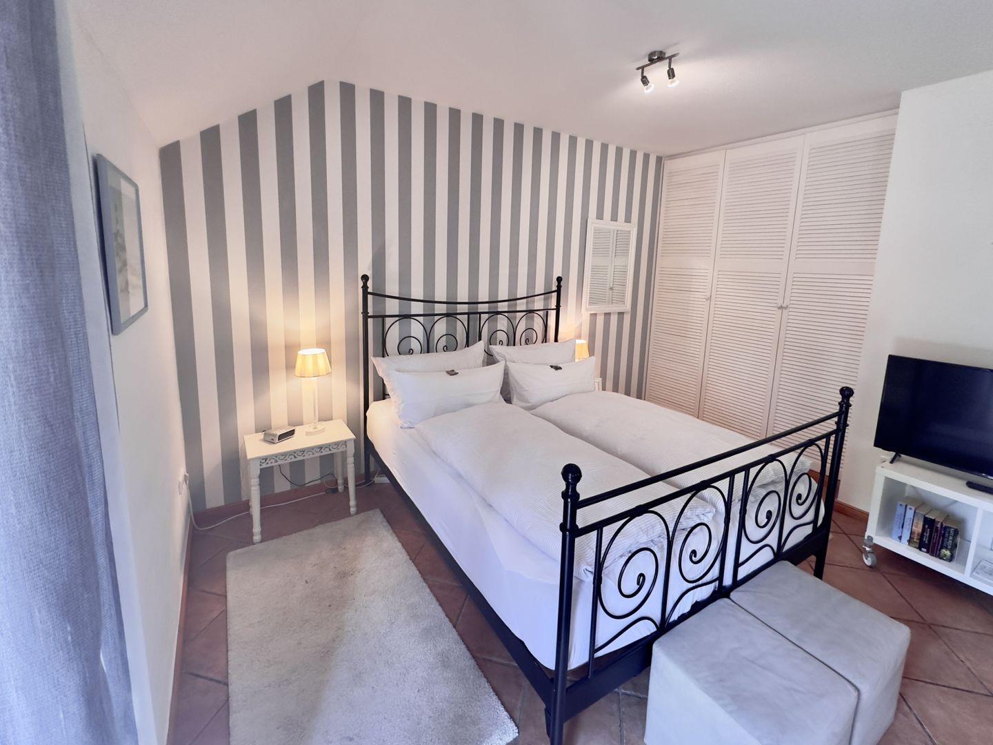 Das helle und freundliche Wohnzimmer empfängt Sie mit einem eleganten, verschnörkelten Metallbett, das sofort ein Gefühl von Geborgenheit vermittelt. Die geschmackvoll gestaltete Einrichtung schafft eine angenehme Atmosphäre, die zum Verweilen einlädt. Eine kleine, aber feine Essgruppe mit zwei Sesseln bietet den idealen Ort für gemütliche Mahlzeiten oder gesellige Abende.