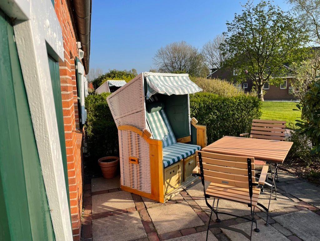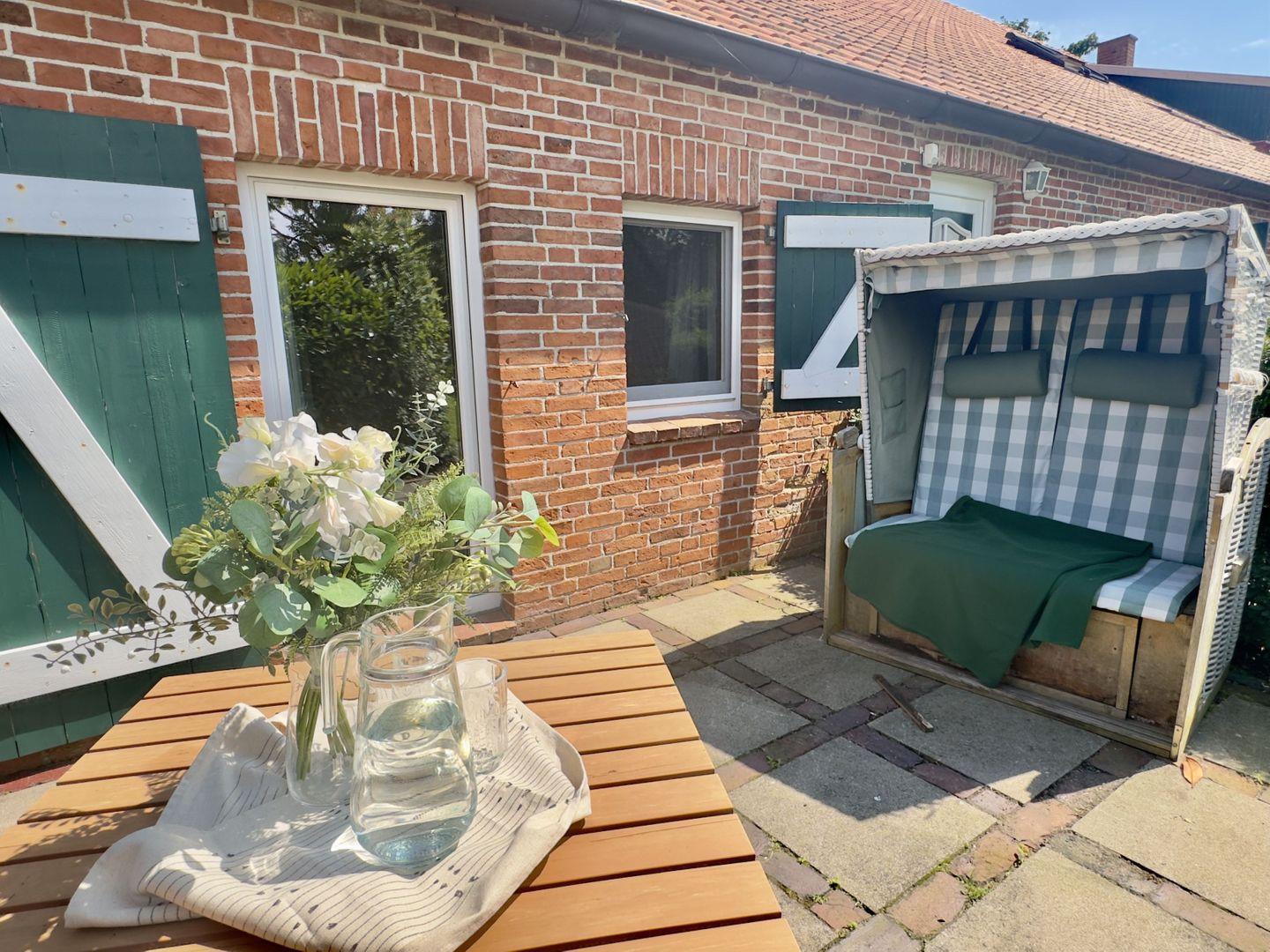 Direkt vom Wohnzimmer aus gelangen Sie auf die private Terrasse, die mit einem gemütlichen Strandkorb ausgestattet ist. Hier können Sie im Grünen träumen und die Ruhe genießen. Der Tisch und die Stühle auf der Terrasse laden zu einem entspannten Frühstück im Freien ein, während Sie sich von der Schönheit der Natur berauschen lassen.