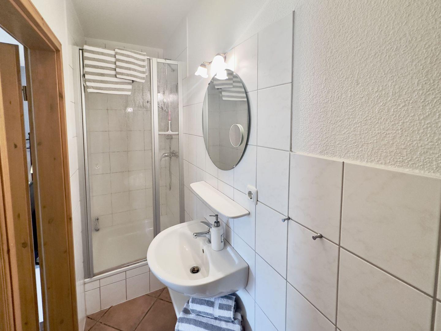 Das helle Badezimmer bietet Ihnen alles für Ihre tägliche Pflege, einschließlich einer Dusche, eines Spiegels und eines praktischen Kosmetikspiegels. Hier starten Sie frisch in den Tag und können sich rundum gepflegt fühlen.