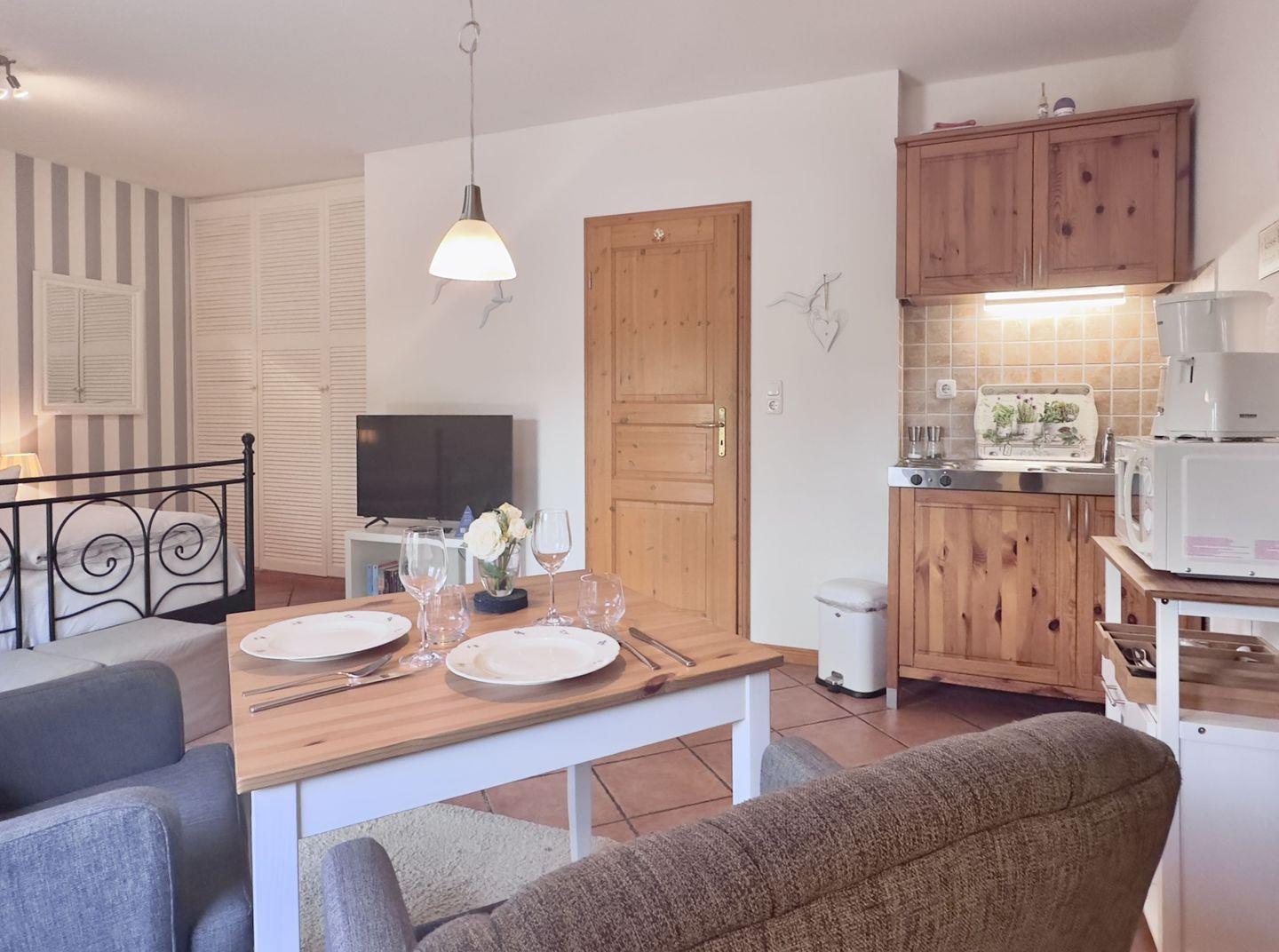 Die kompakte Holzküche ist perfekt ausgestattet und lässt keine Wünsche für Ihre Selbstversorgung offen. Hier können Sie Ihre Mahlzeiten zubereiten und den Tag kulinarisch beginnen. Die geschickte räumliche Gestaltung verleiht dem Apartment eine wundervolle Atmosphäre, in der Sie sich sofort wohlfühlen werden.