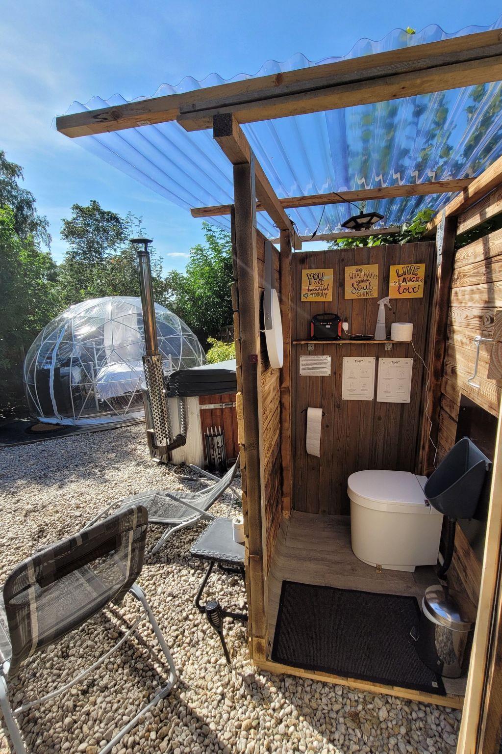 ? A simple dry toilet with washing facilities is located in a hut next to the bubble. A guest bathroom with running drinking water and a shower is located in the inner courtyard approx. 30 metres away.