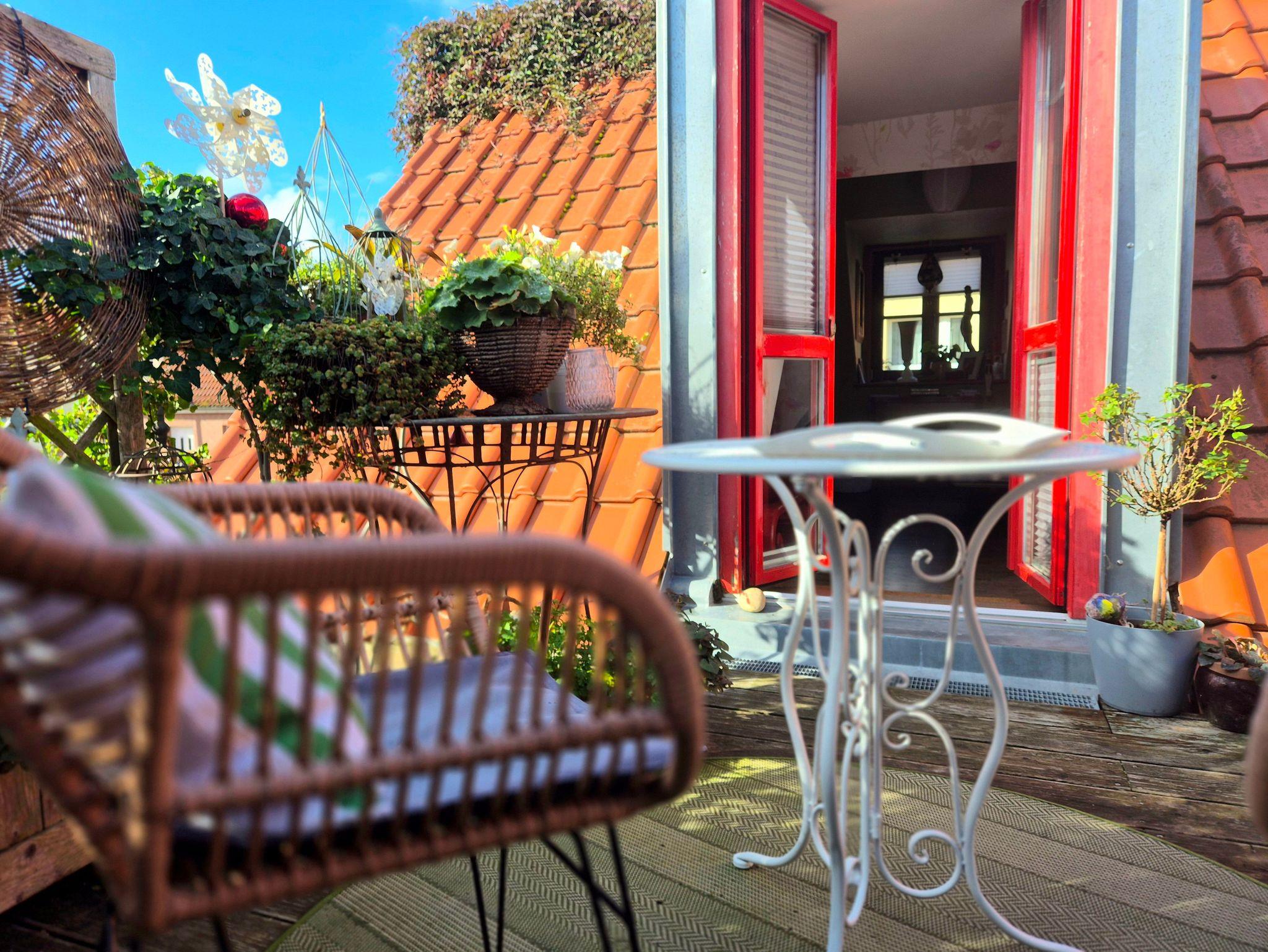 Ein besonderes Highlight ist die großzügige Dachterrasse, ein sonniger Rückzugsort über den Dächern von Neukalen. Hier genießen Sie den ganzen Tag Sonne, entspannen auf einem gemütlichen Daybed und lassen abends den Blick über die beleuchtete Kirchturmuhr schweifen. Wenn die Nacht hereinbricht, können Sie die Sterne beobachten und den Tag in Ruhe ausklingen lassen.