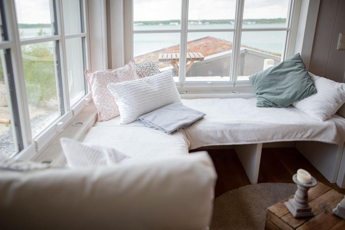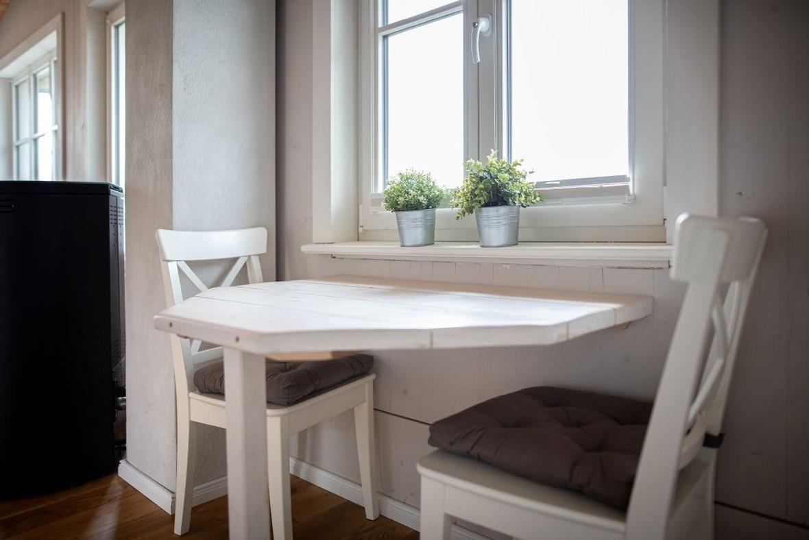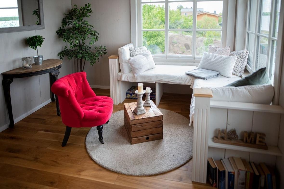 Der gemütliche Wohnraum ist mit viel Liebe zum Detail modern eingerichtet. Ein Pellet-Kamin sorgt nicht nur in der kalten Jahreszeit für romantische Abende. Die breiten und weichen Windowseats laden zum Entspannen ein – Lesen oder den Blick aus dem Fenster schweifen lassen und dem Farbenspiel der Natur von Sonnenaufgang bis Sonnenuntergang zusehen.