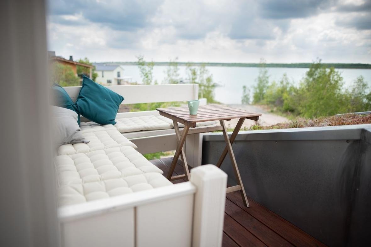 Inmitten des begrünten Daches finden Sie eine Loggia mit herrlichem Blick auf den Hainer See. Genießen Sie hier die Zweisamkeit bei einem Glas Wein und lauschen Sie dem Plätschern der Wellen.