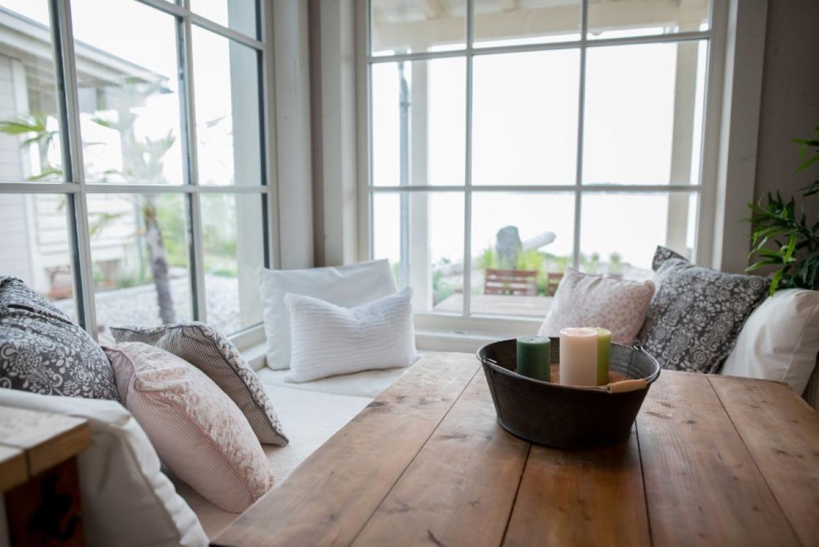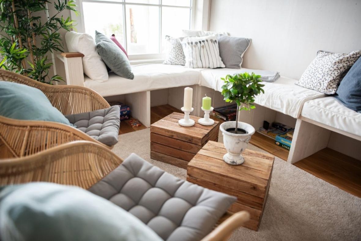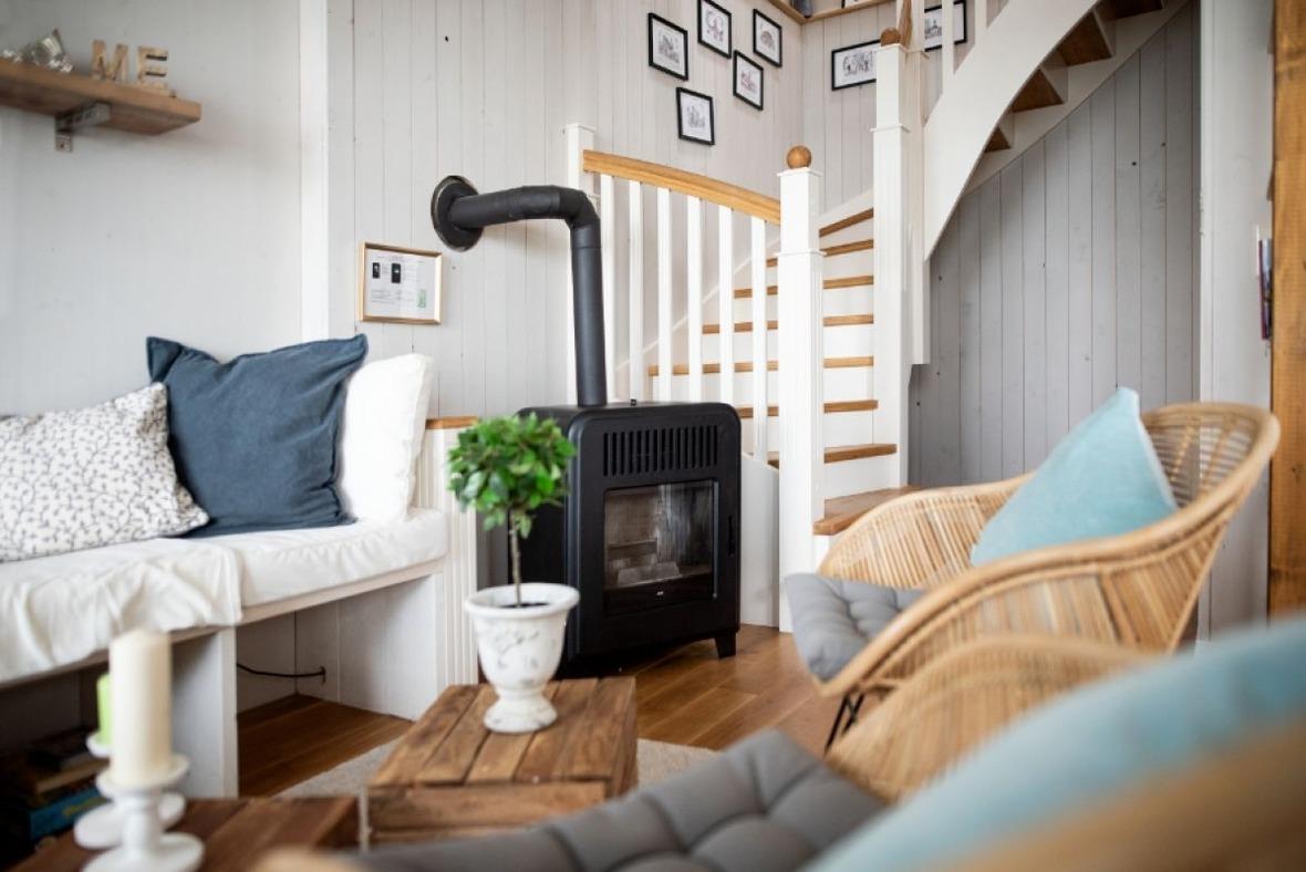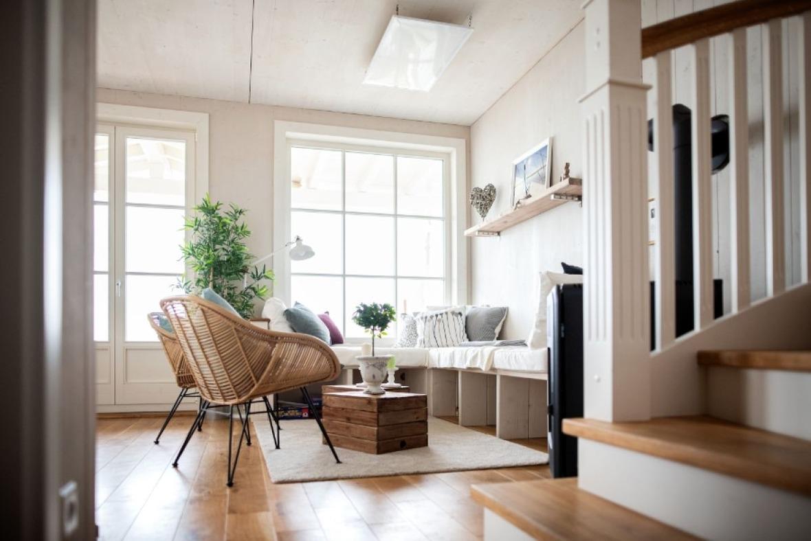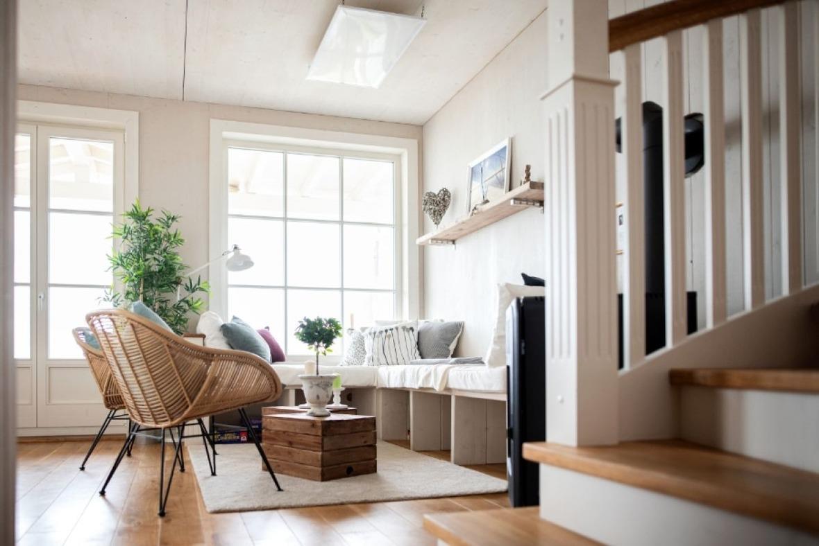 Im lichtdurchfluteten Wohnraum mit Pellet-Kamin laden gemütliche Windowseats zum Entspannen ein, zum lesen oder zum "Fernsehen" auf den See um dem Farbenspiel der Natur zuzusehen.