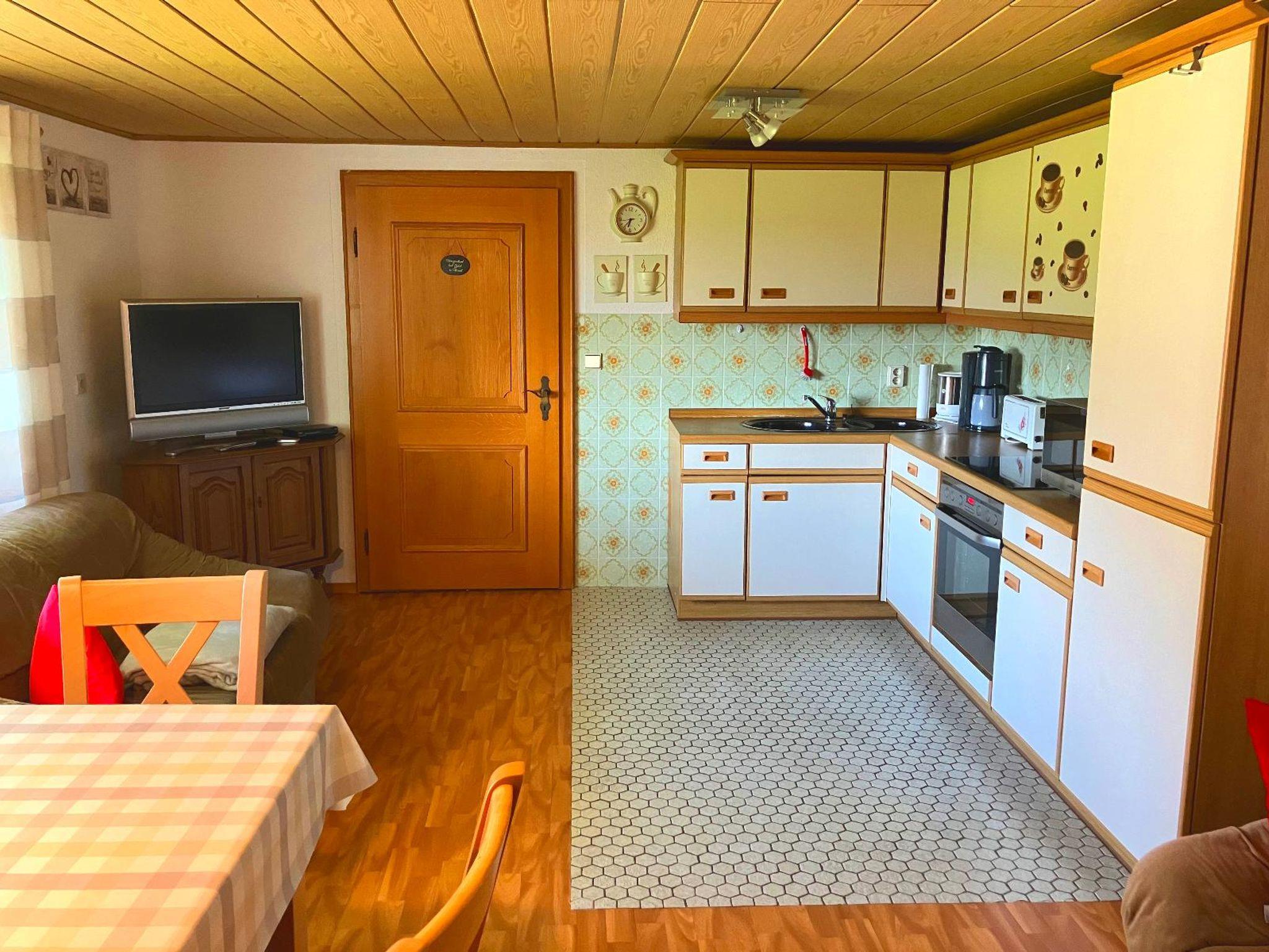 Die gemütlich eingerichtete Wohnküche bestehend aus Küchenzeile, Esstisch, Couch und der Flachbild SAT-TV lädt zum Verweilen ein.
