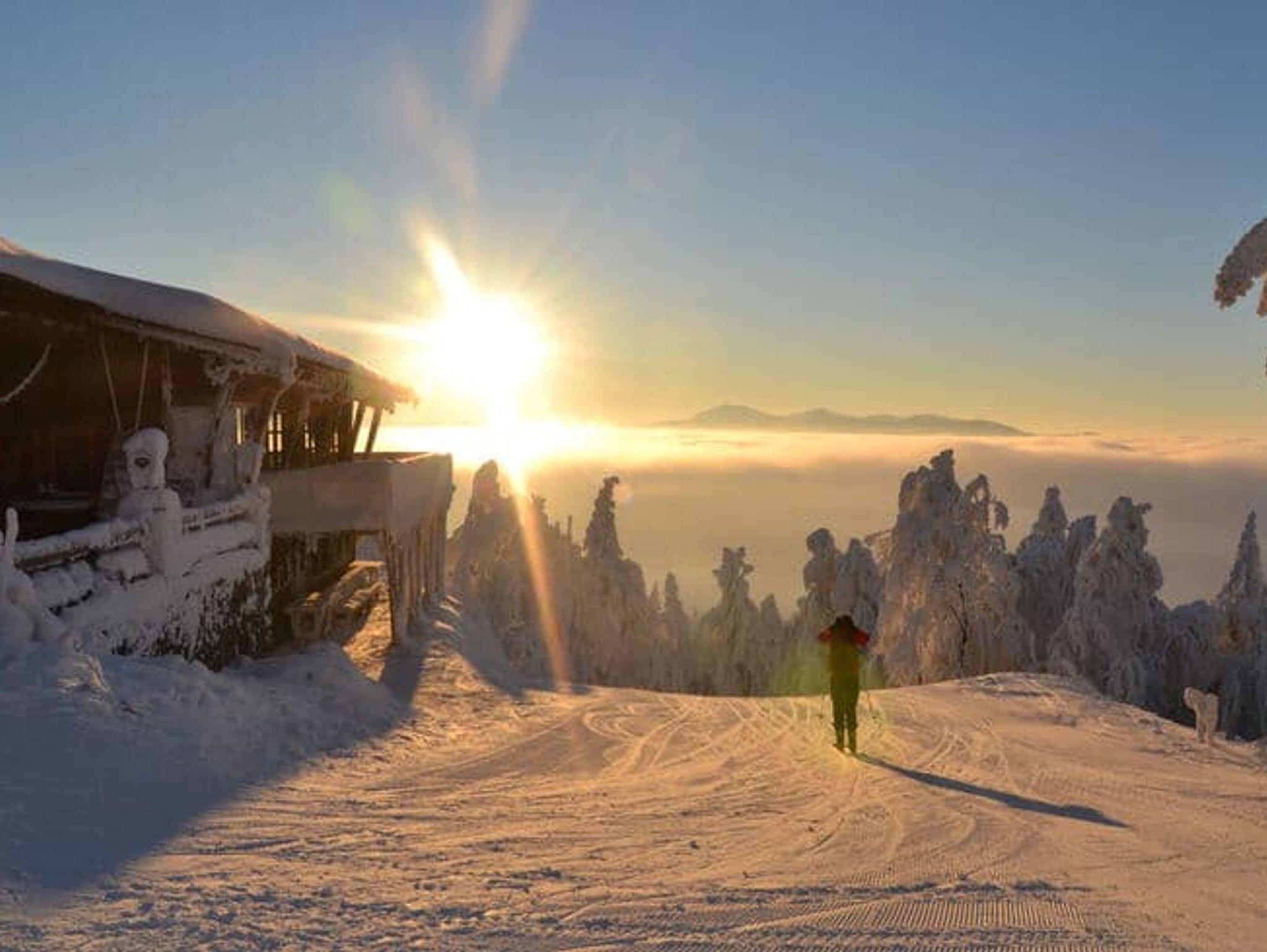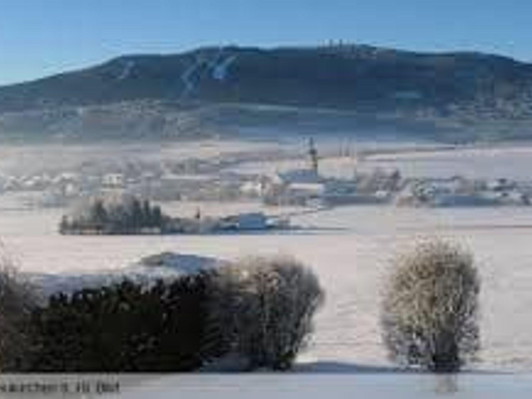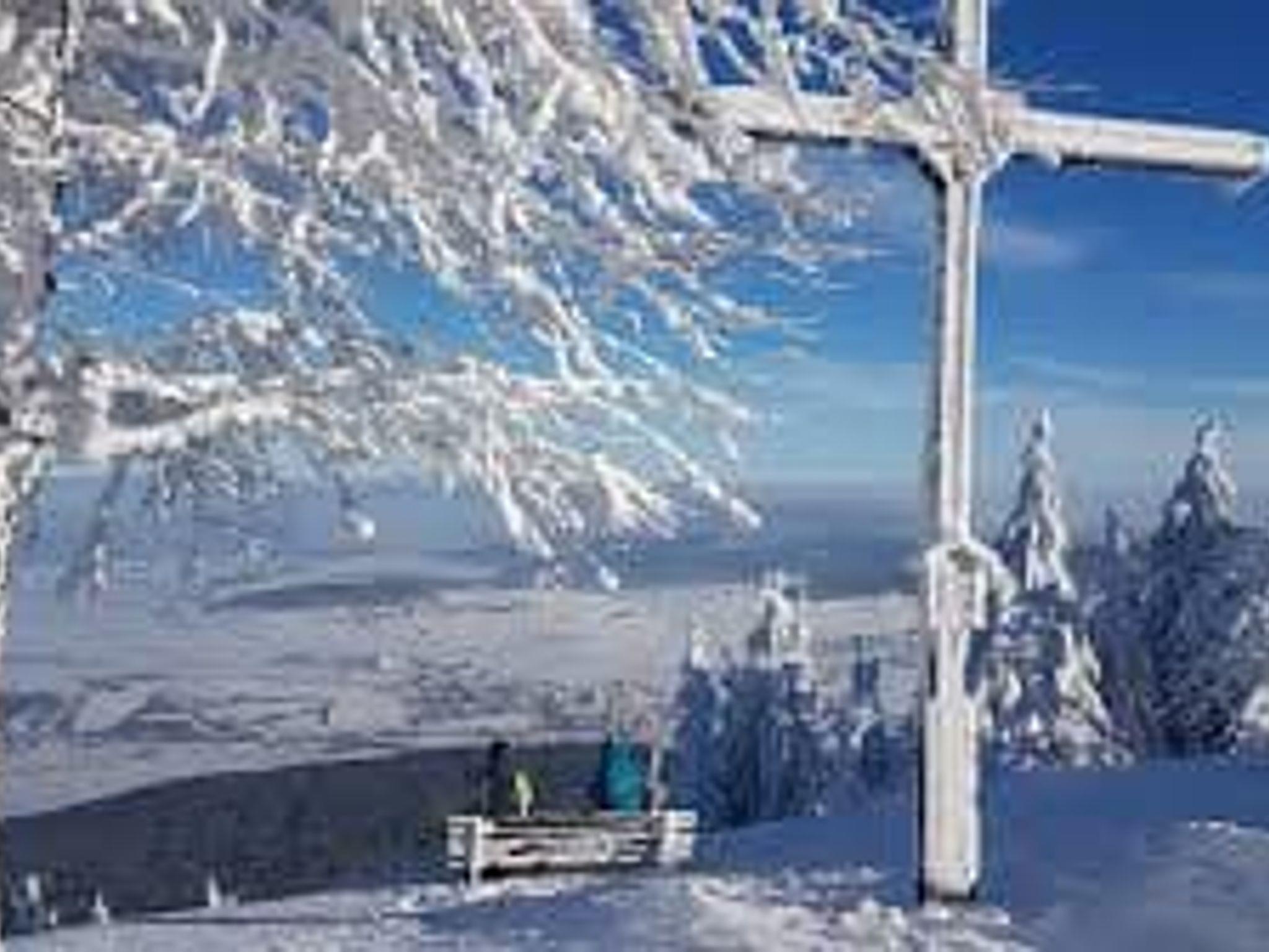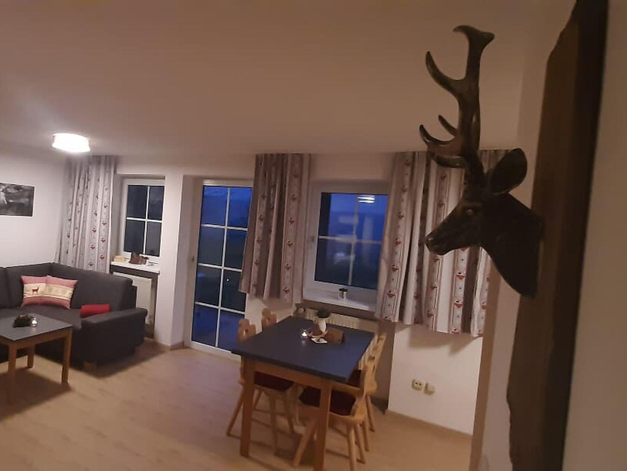 Neu Renovierte Ferienwohnung für 4 Personen mit Balkon, seitlicher Balkon mit Blick nach Neukirchen und zum Hohenbogen, mit Küche, gemütliche L-Couch, 1 Schlafzimmer mit Doppelbett, 1 Schlafzimmer mit zwei Einzelbetten, Bad und seperaten WC